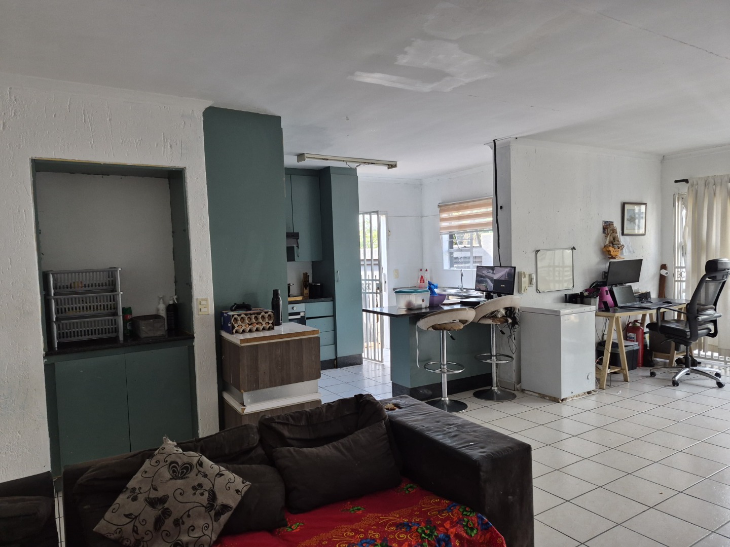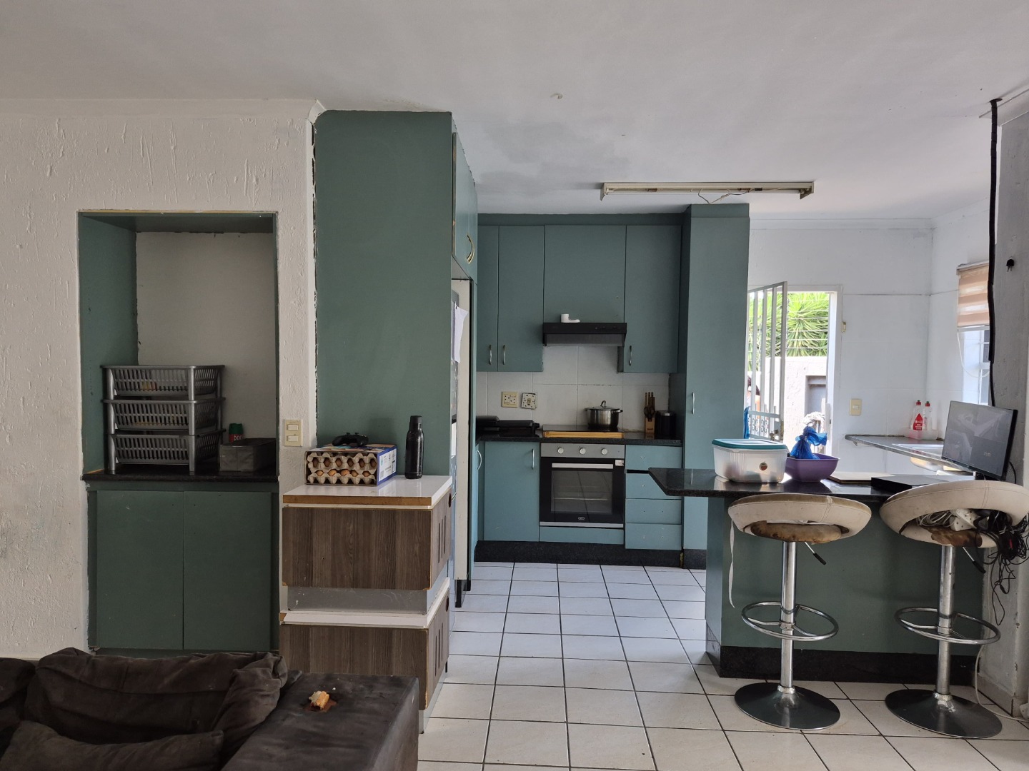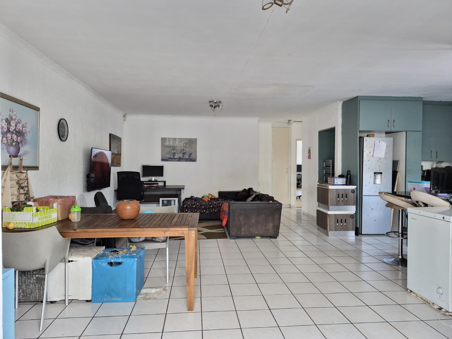 The kitchen, a central feature of the open-plan design, is equipped with ample cabinetry and counter space, an integrated oven, and a functional island featuring a hob and extractor fan. A breakfast bar provides an informal dining option, contributing to the home's versatile living arrangements. While presenting a functional layout, certain elements suggest potential for cosmetic enhancements to align with modern aesthetic preferences.