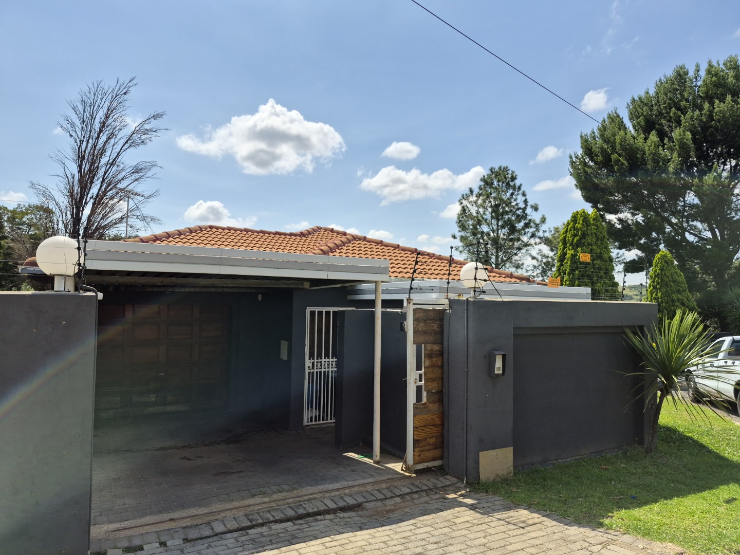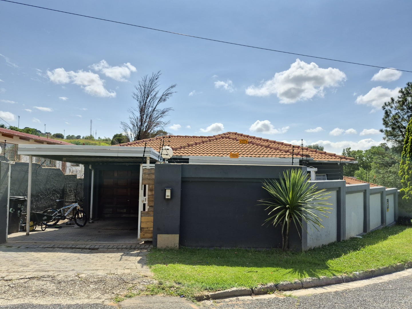 Situated in the established suburban enclave of Oakdene, Johannesburg, this distinguished residence presents a robust kerb appeal with its modern dark grey perimeter wall and gate, complemented by a classic terracotta tiled roof. The property benefits from a paved driveway and visible security features, including an electric fence and security gate, ensuring a secure environment.