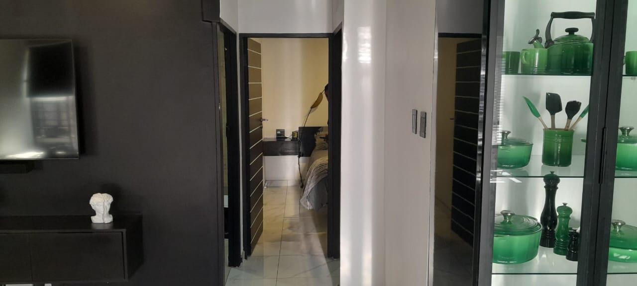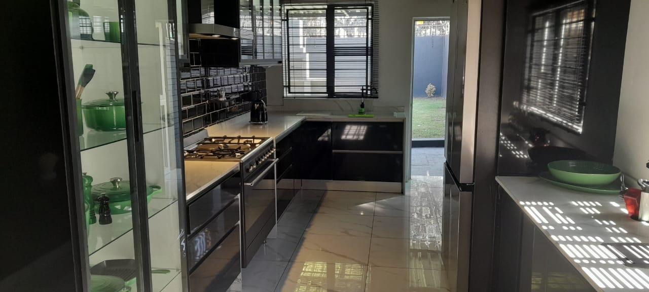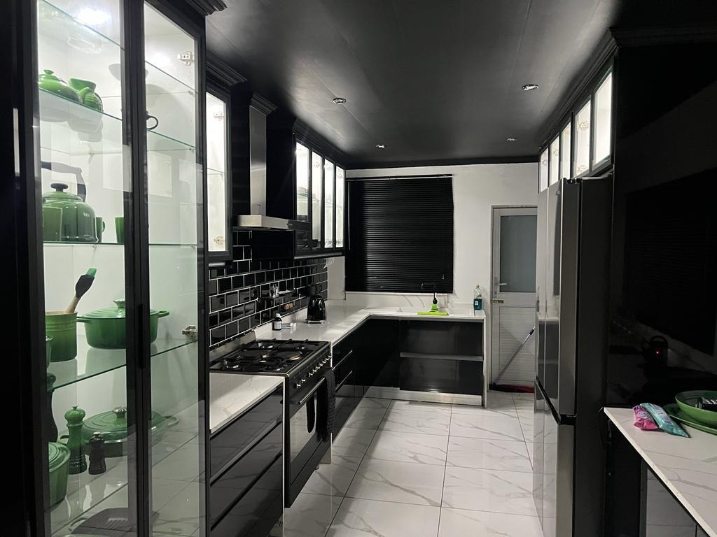 The heart of this home is its modern kitchen, a true highlight with glossy black cabinetry, stylish black subway tiles, and elegant marble-look countertops. It comes well-equipped with integrated appliances, including an oven, hob, extractor fan, fridge, and beverage cooler, ensuring a sophisticated culinary experience. The thoughtful layout promotes effortless flow between the kitchen and the main living areas, perfect for both daily living and entertaining.