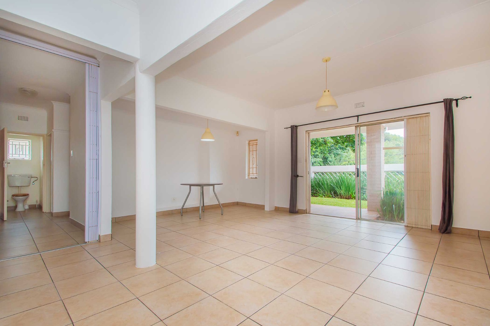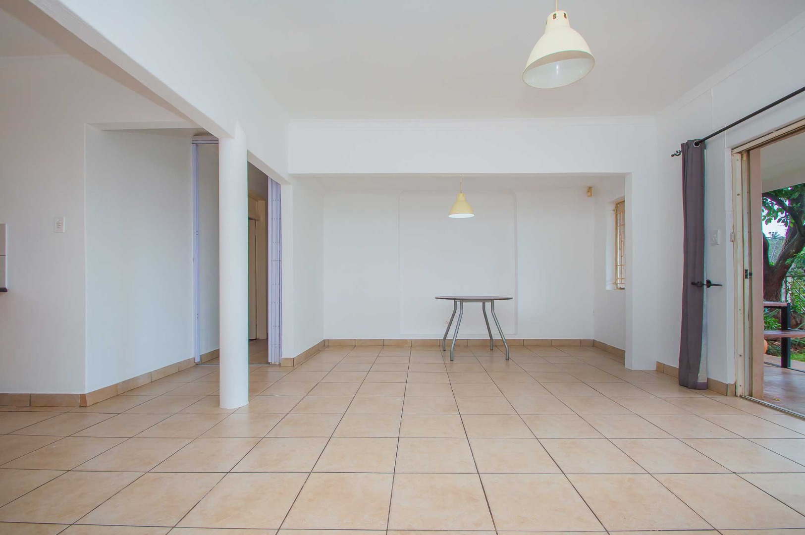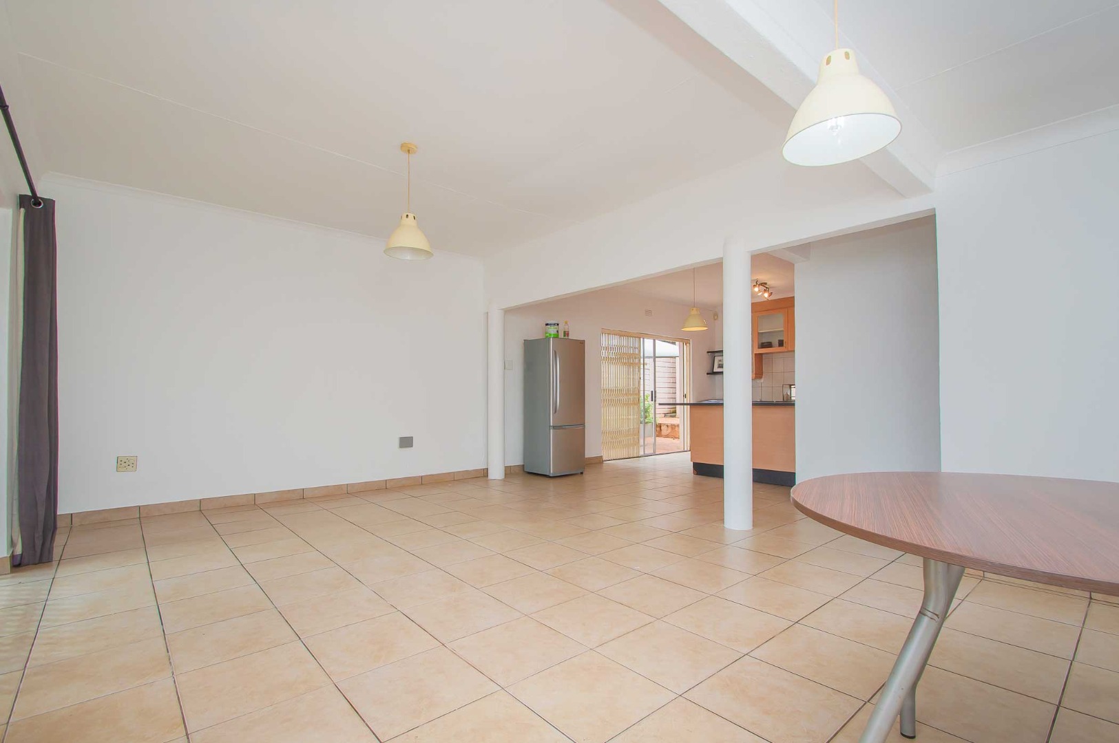 • Open-plan lounge, dining room, and kitchen with built-in cupboards and tiled flooring