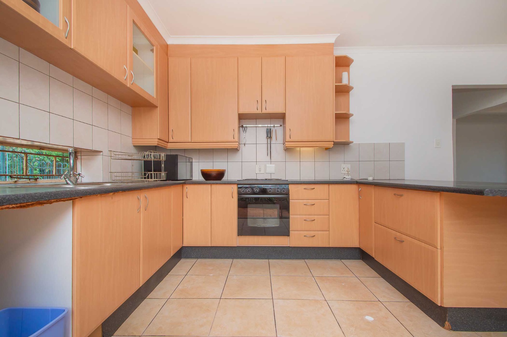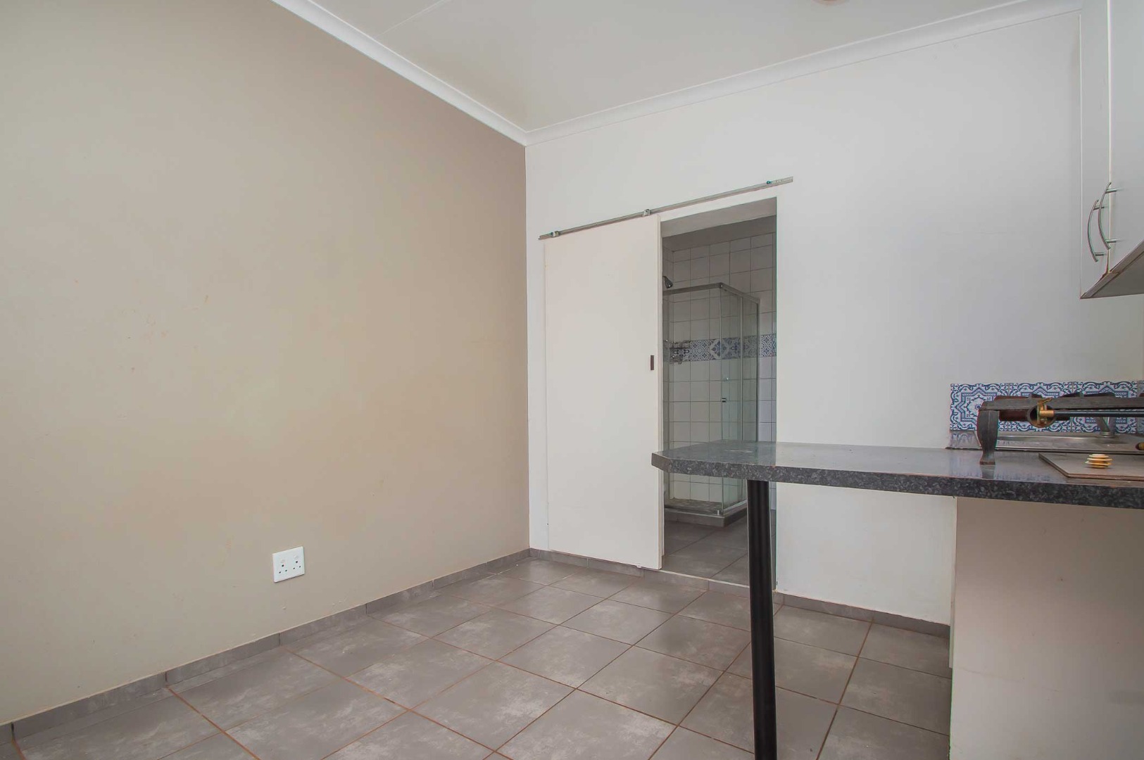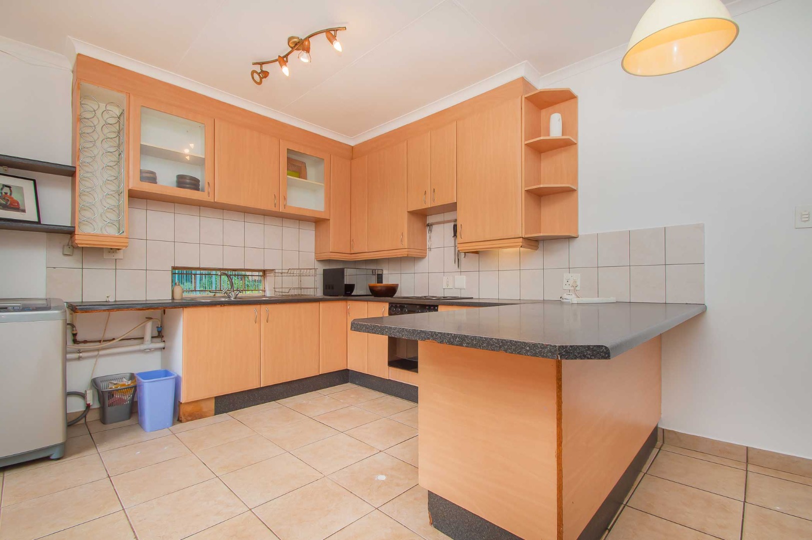 • Open-plan lounge, dining room, and kitchen with built-in cupboards and tiled flooring