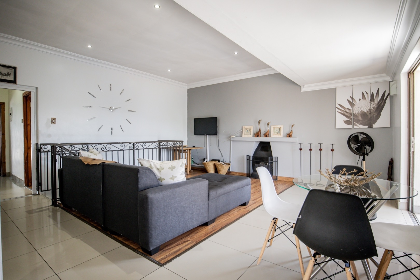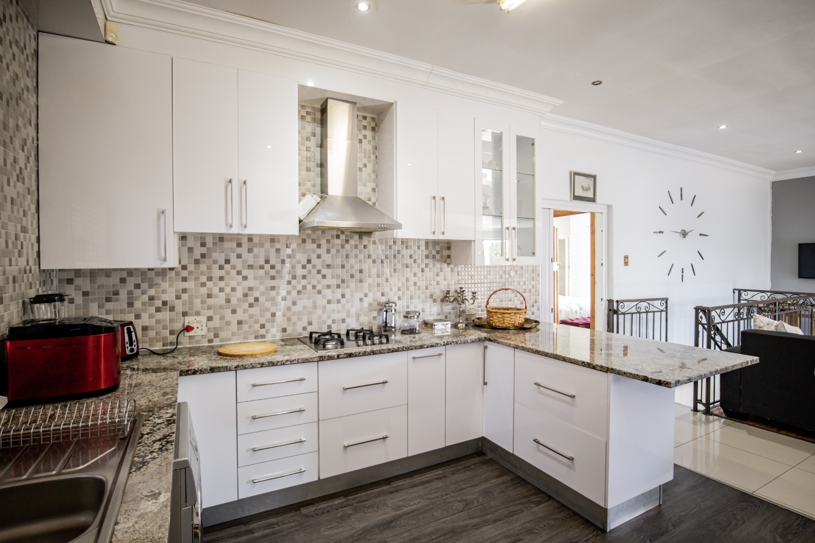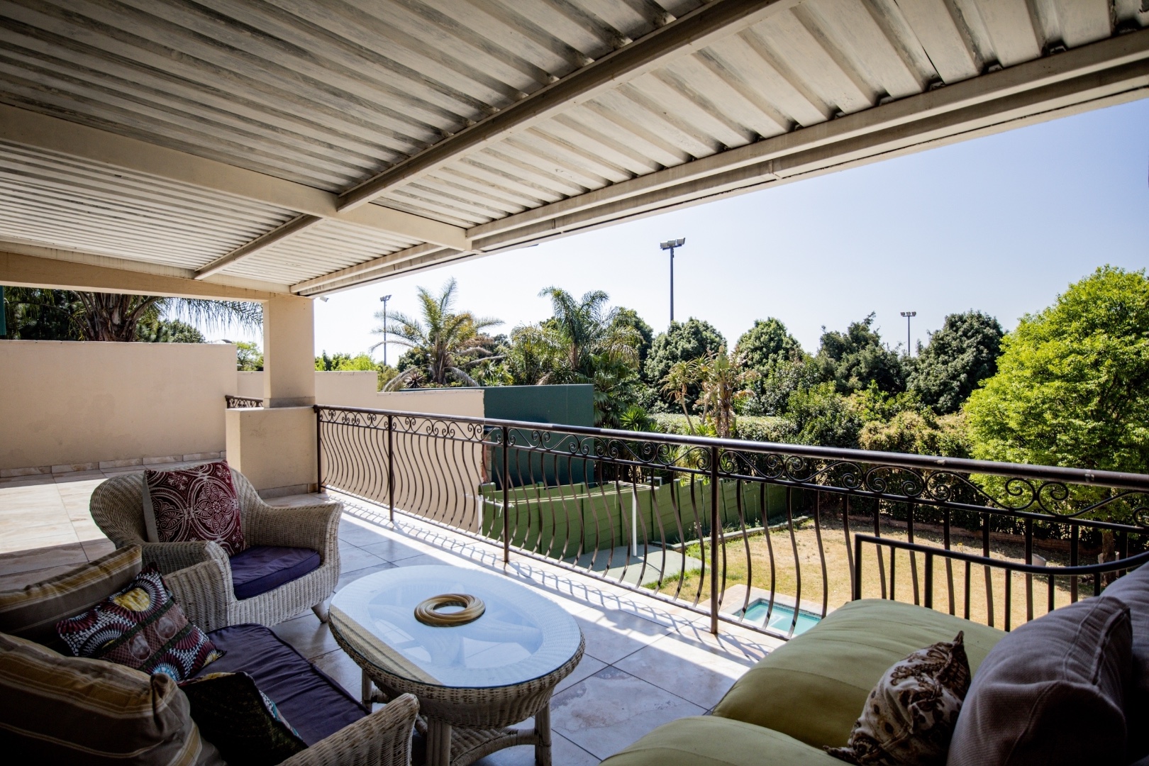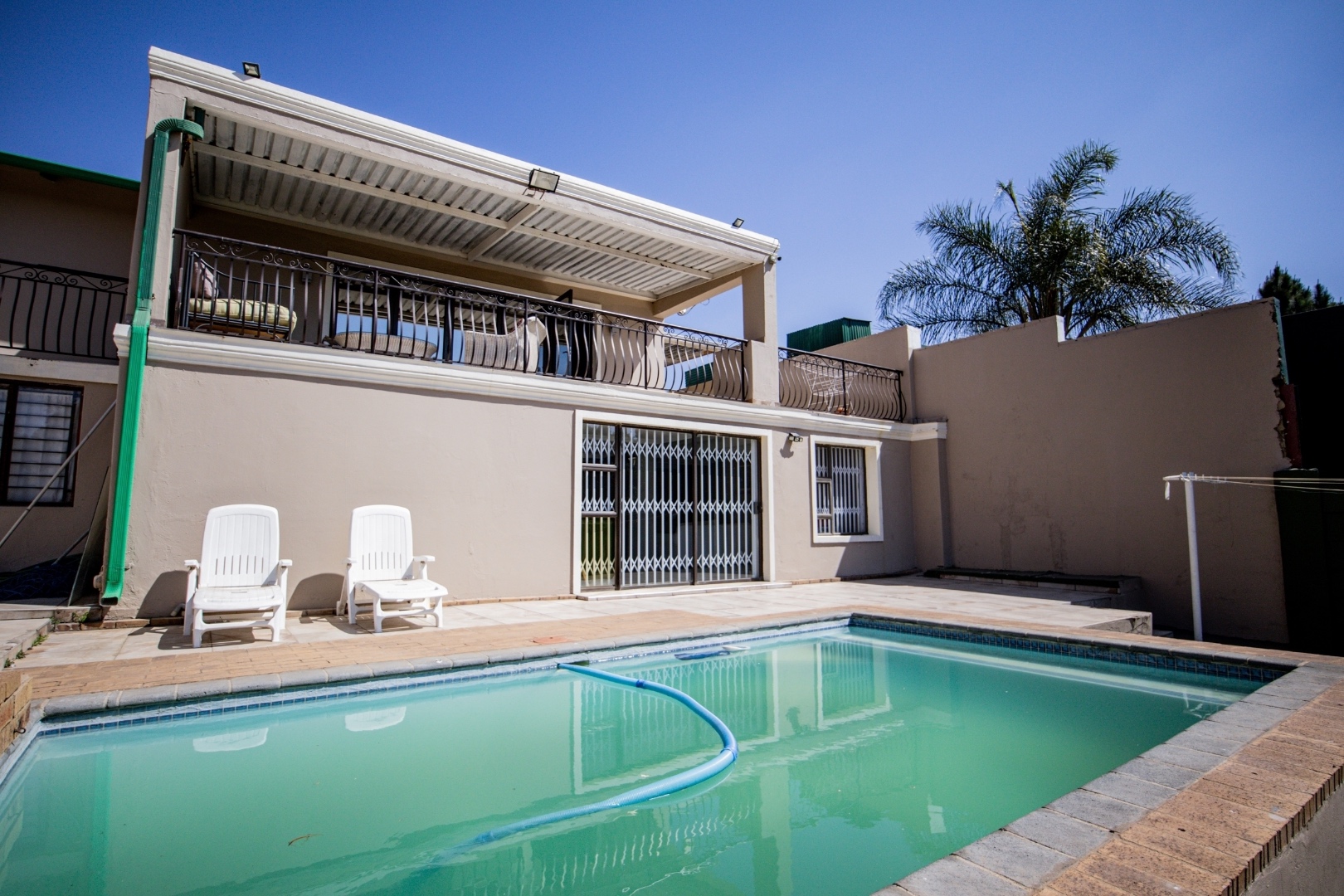 The open plan lounge / dining room / kitchen opens up to a covered patio / balcony, overlooking the garden and pool, which is sparking below the house on a lower level. Here you can sip your sundowners, and relax after a busy day while you look at your beautiful view.