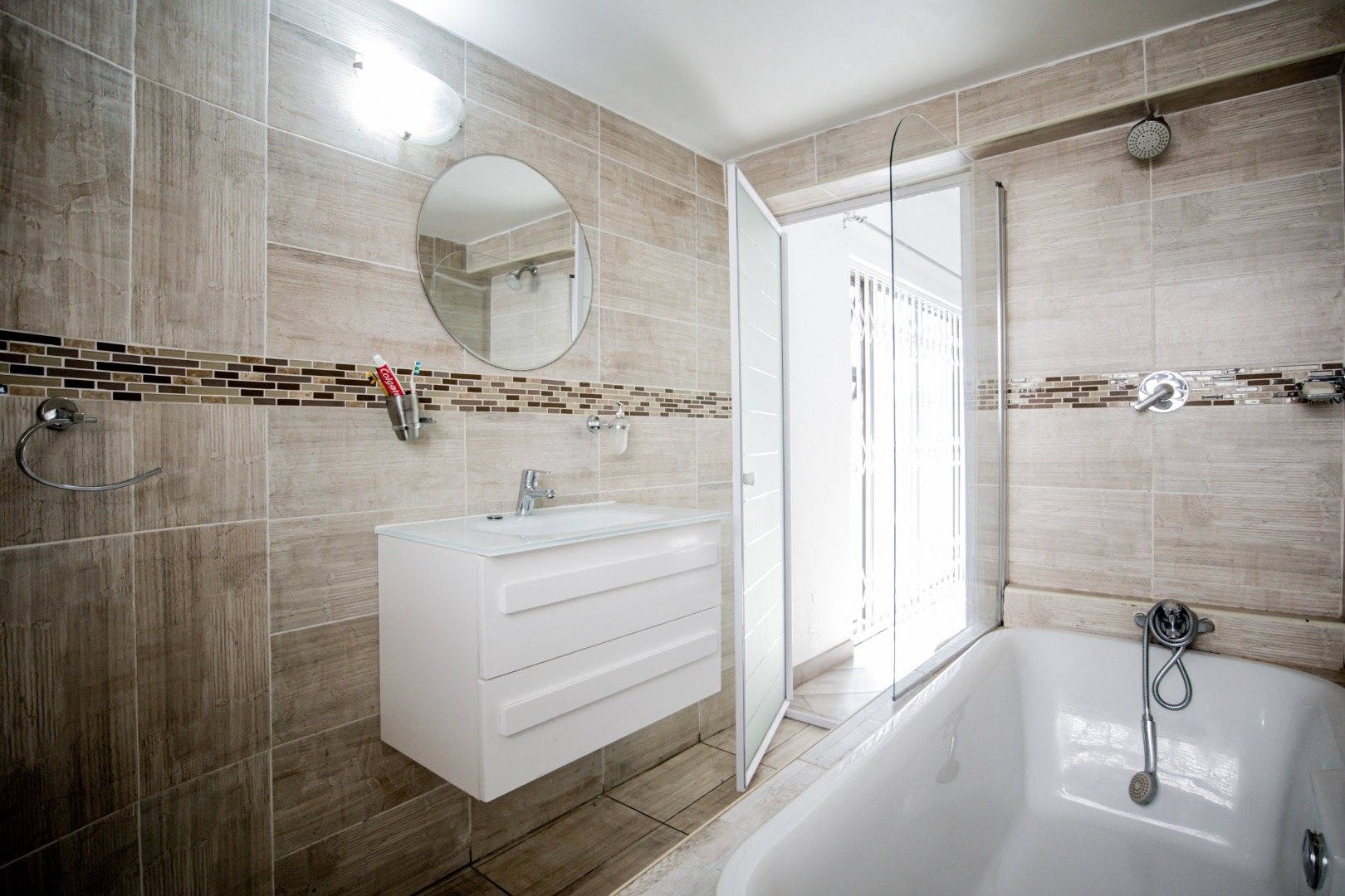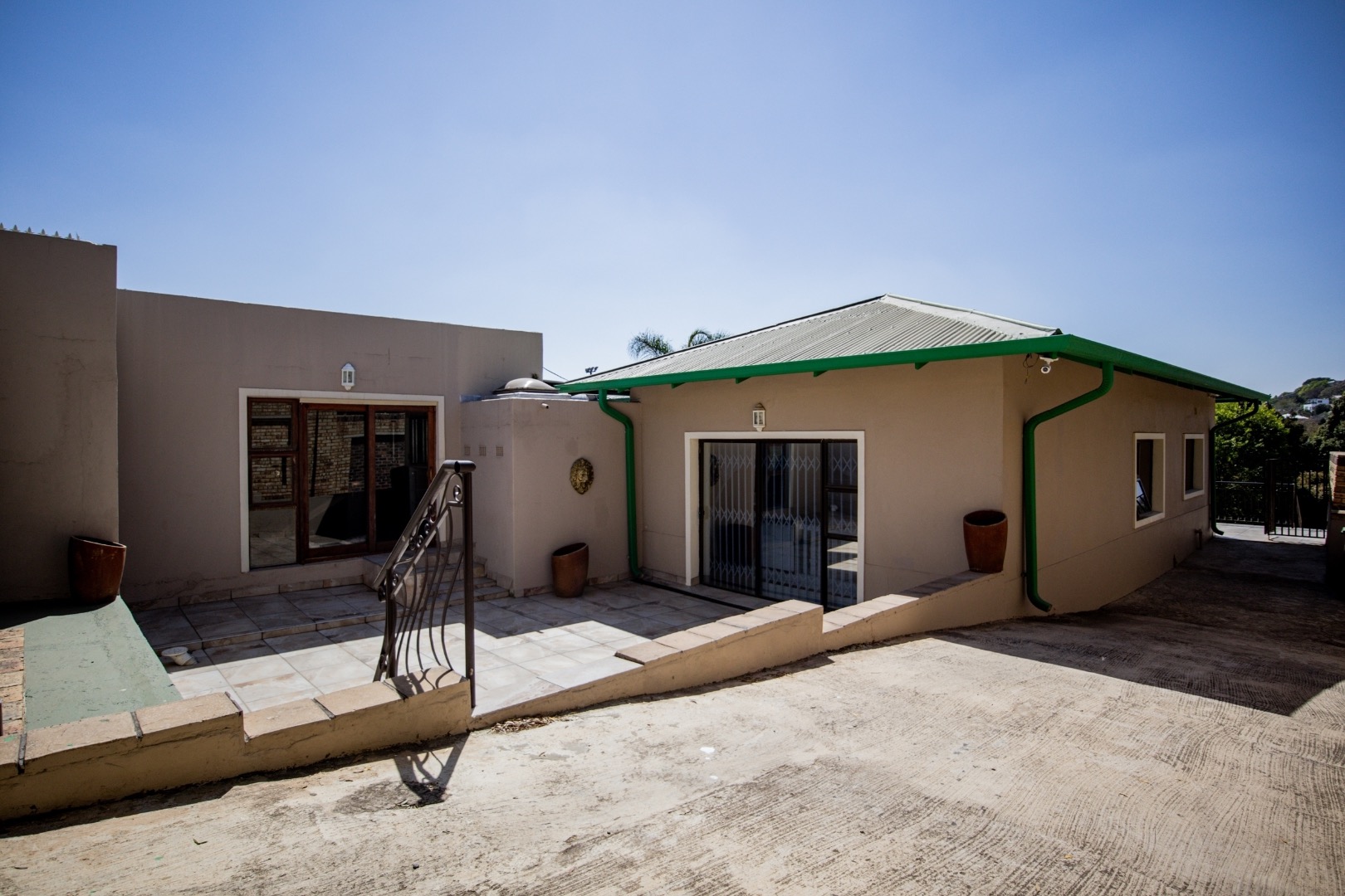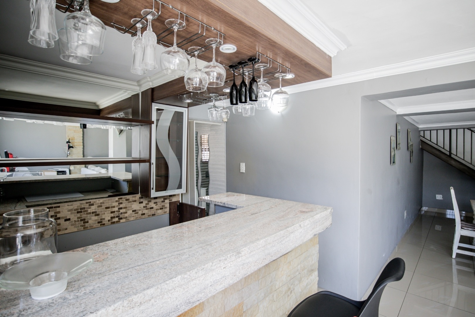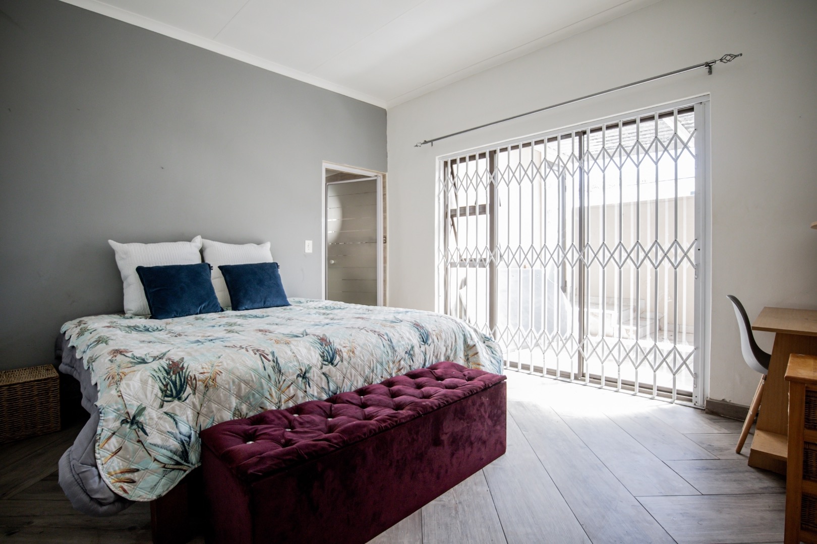 The open plan lounge / dining room / kitchen opens up to a covered patio / balcony, overlooking the garden and pool, which is sparking below the house on a lower level. Here you can sip your sundowners, and relax after a busy day while you look at your beautiful view.