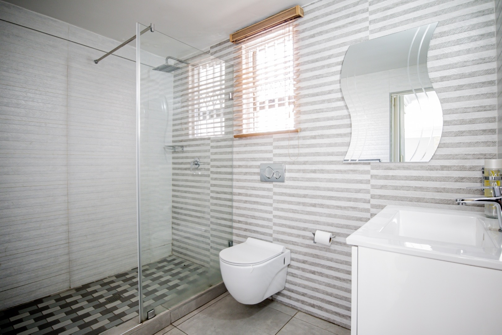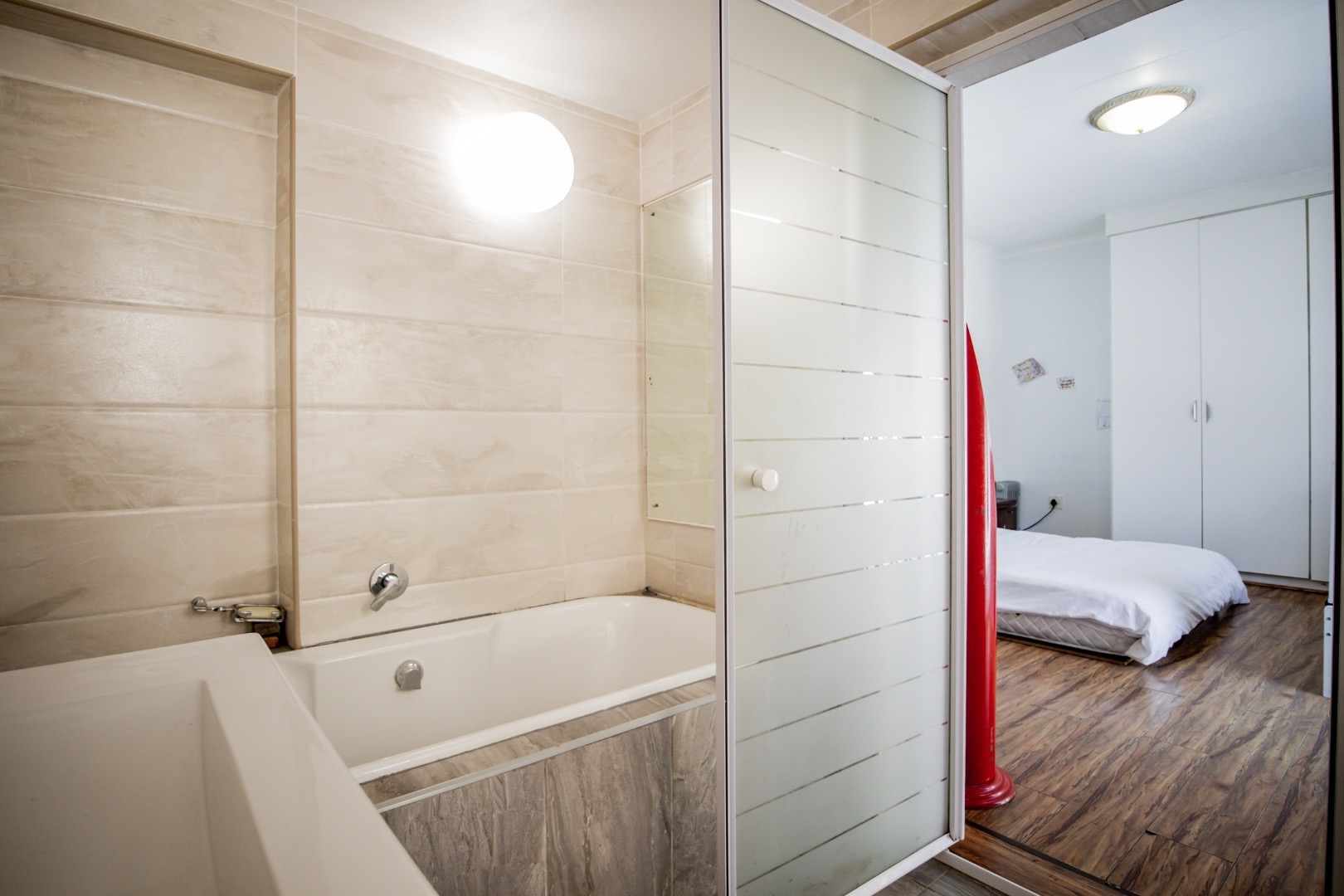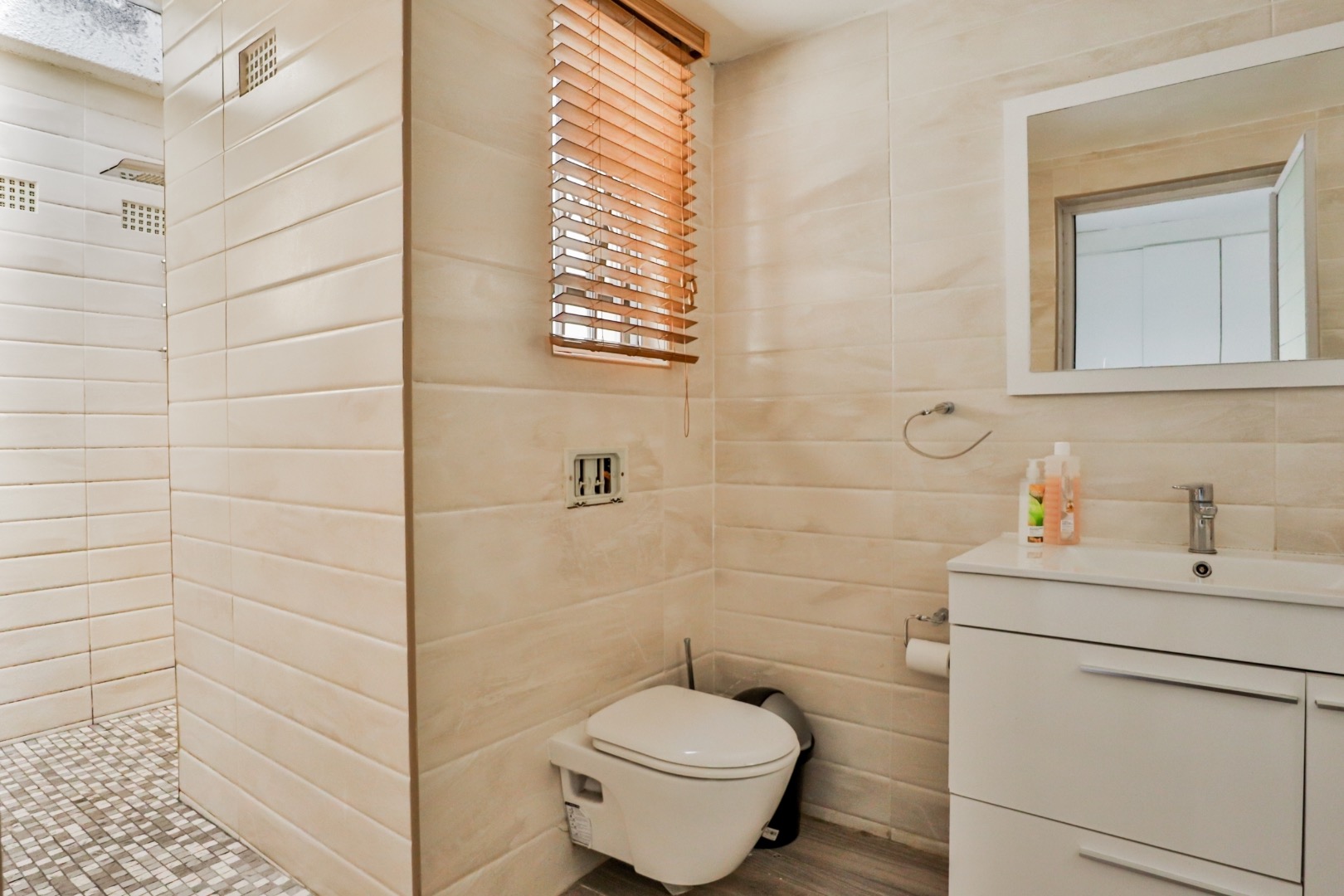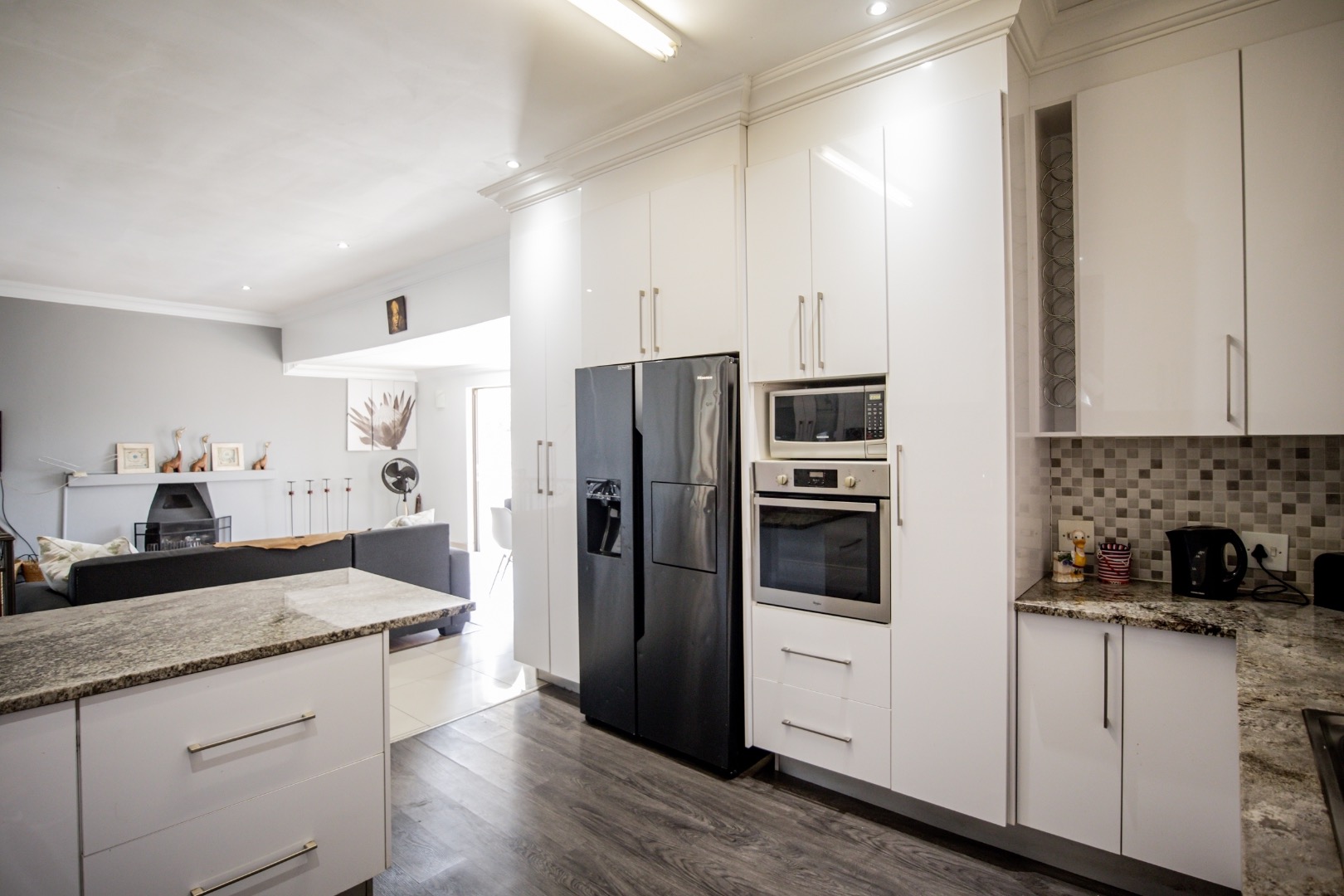 The open plan lounge / dining room / kitchen opens up to a covered patio / balcony, overlooking the garden and pool, which is sparking below the house on a lower level. Here you can sip your sundowners, and relax after a busy day while you look at your beautiful view.