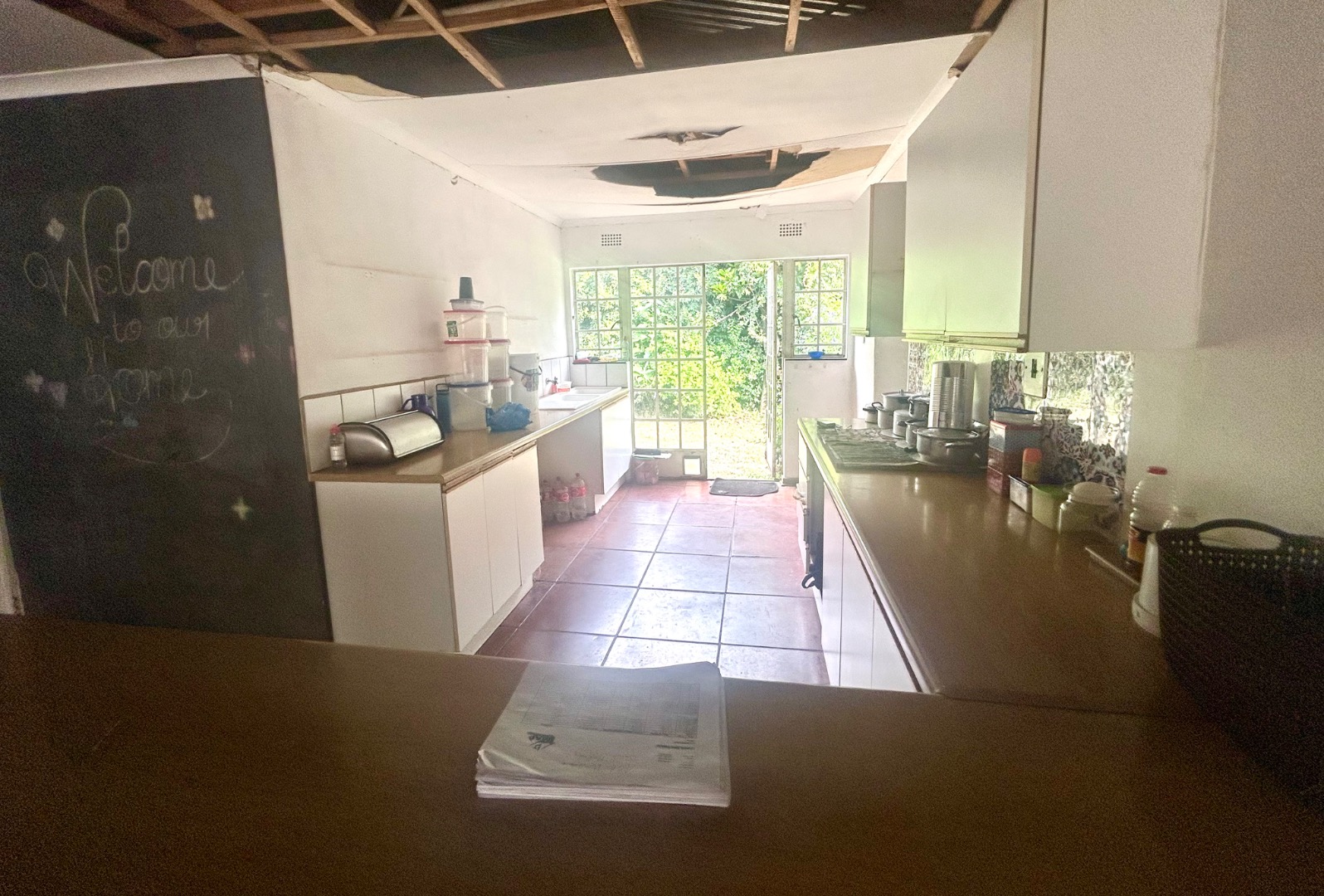 The interior boasts an open-plan layout, connecting living and kitchen areas, providing a spacious foundation for modern design. The property features two lounges and an open plan dining room, offering ample space for family living and entertaining. The kitchen area, though currently in a state of disrepair with exposed ceilings, it includes modern white cabinets in one section and a practical double sink, hinting at the possibilities for a contemporary culinary space.