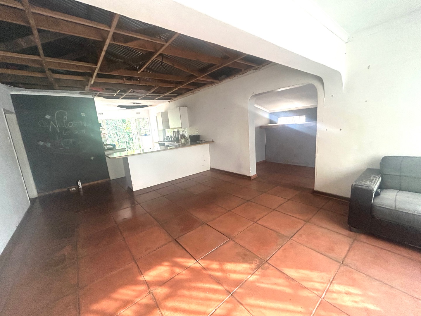 The interior boasts an open-plan layout, connecting living and kitchen areas, providing a spacious foundation for modern design. The property features two lounges and an open plan dining room, offering ample space for family living and entertaining. The kitchen area, though currently in a state of disrepair with exposed ceilings, it includes modern white cabinets in one section and a practical double sink, hinting at the possibilities for a contemporary culinary space.