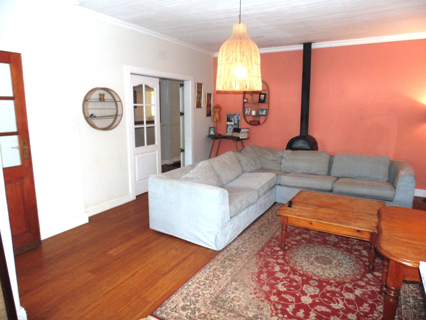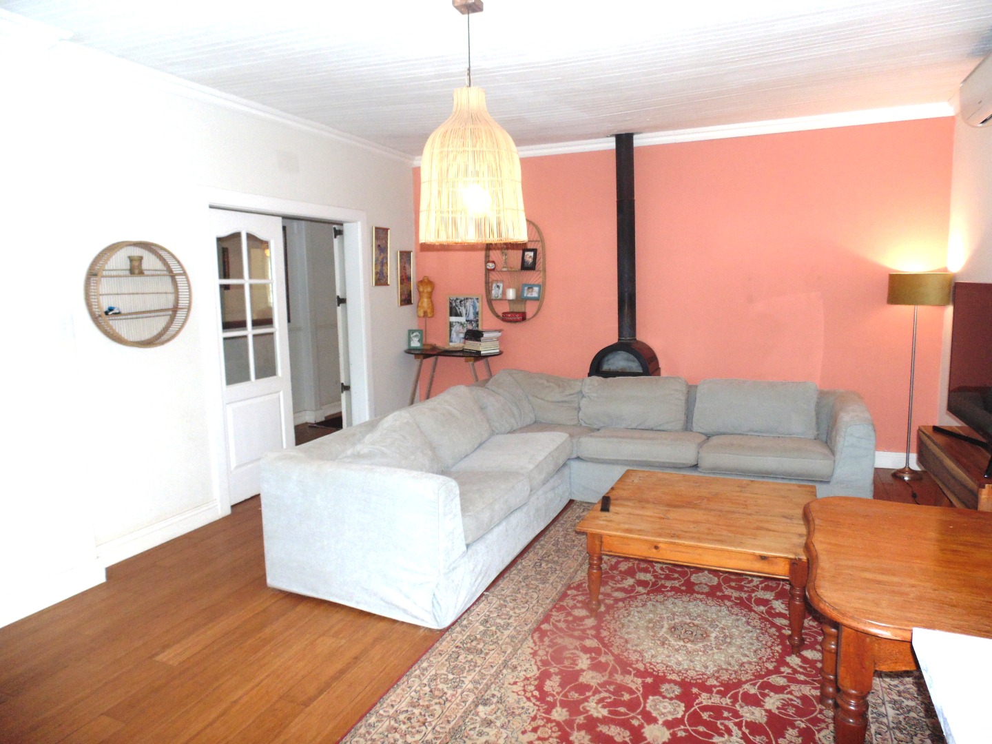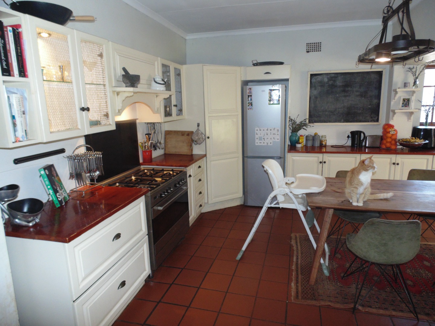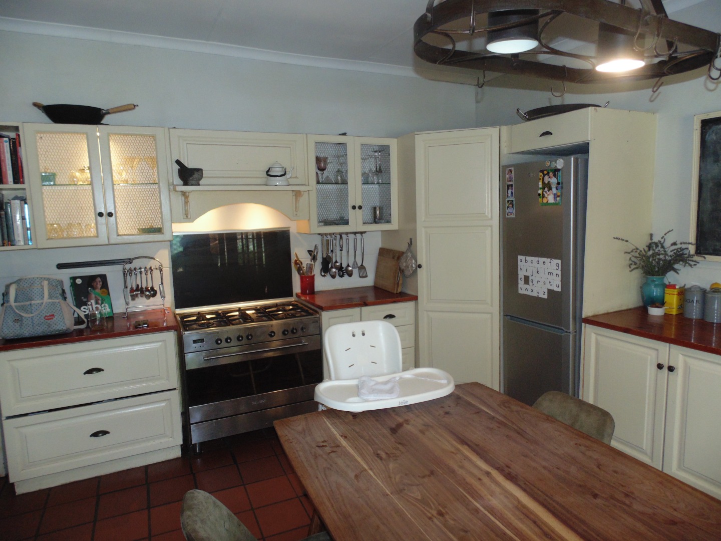 Step inside to discover a functional layout featuring a comfortable lounge and a spacious kitchen. The kitchen is well-appointed with ample cabinetry, dark countertops, and a large gas stove, complemented by a substantial dining area, perfect for family gatherings. Terracotta tiled flooring flows throughout, enhancing the rustic charm and connecting seamlessly to the outdoor patio via large glass doors, promoting an inviting indoor-outdoor lifestyle.