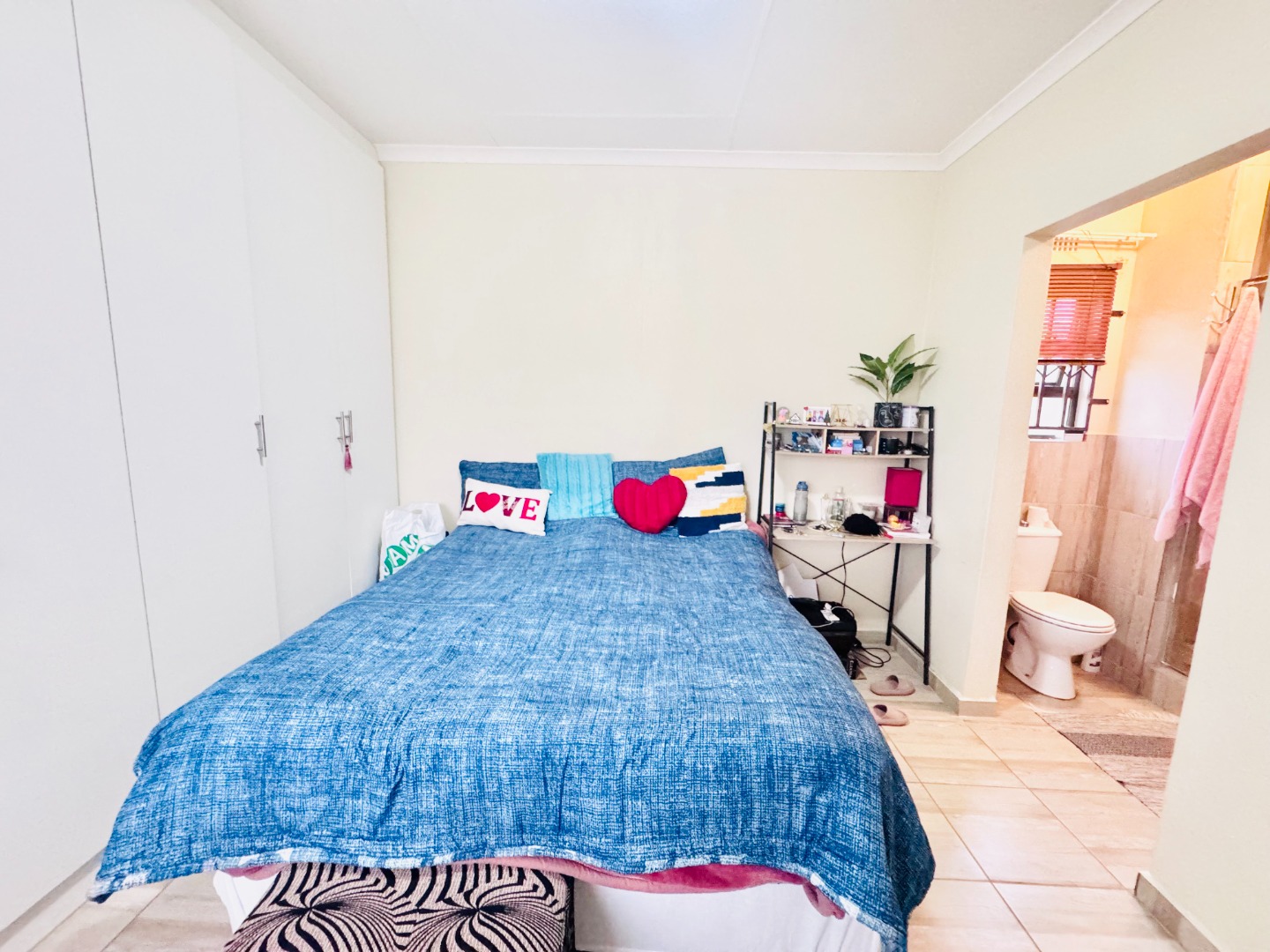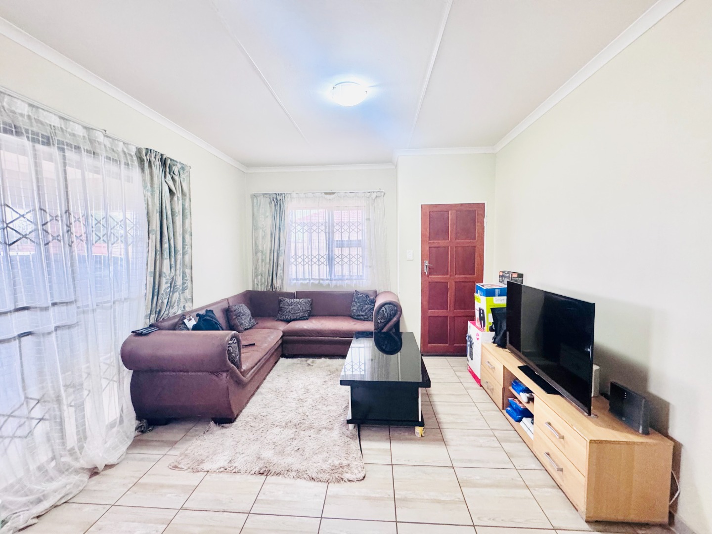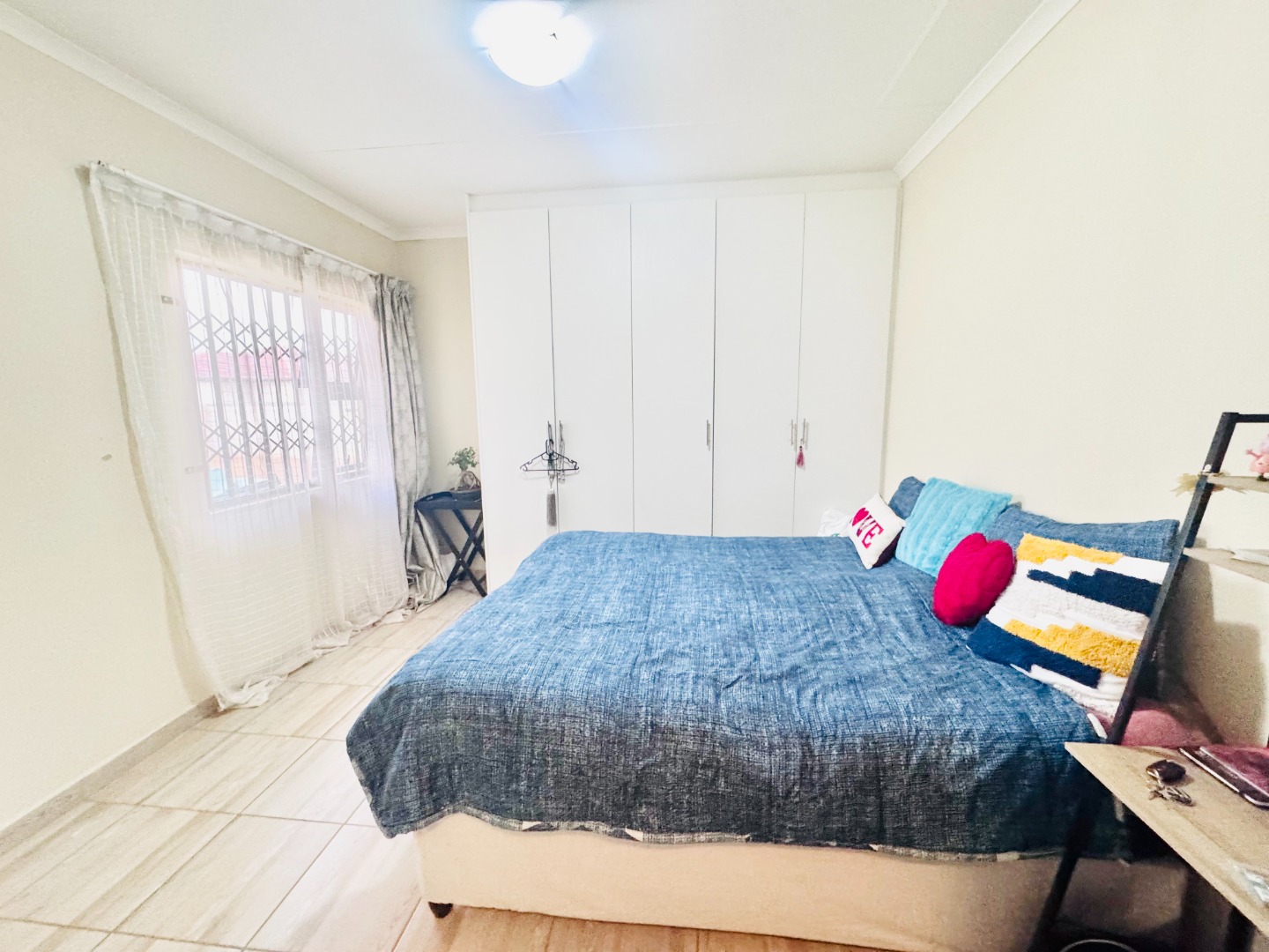 Inside, the home offers a practical and comfortable living environment. The bright lounge area, adorned with tiled flooring and neutral walls, provides a welcoming space. The functional kitchen is equipped with an L-shaped counter, ample storage, and space for essential appliances. Three comfortable bedrooms, all with tiled flooring, include a main bedroom with an en-suite bathroom and another with a built-in wardrobe.
