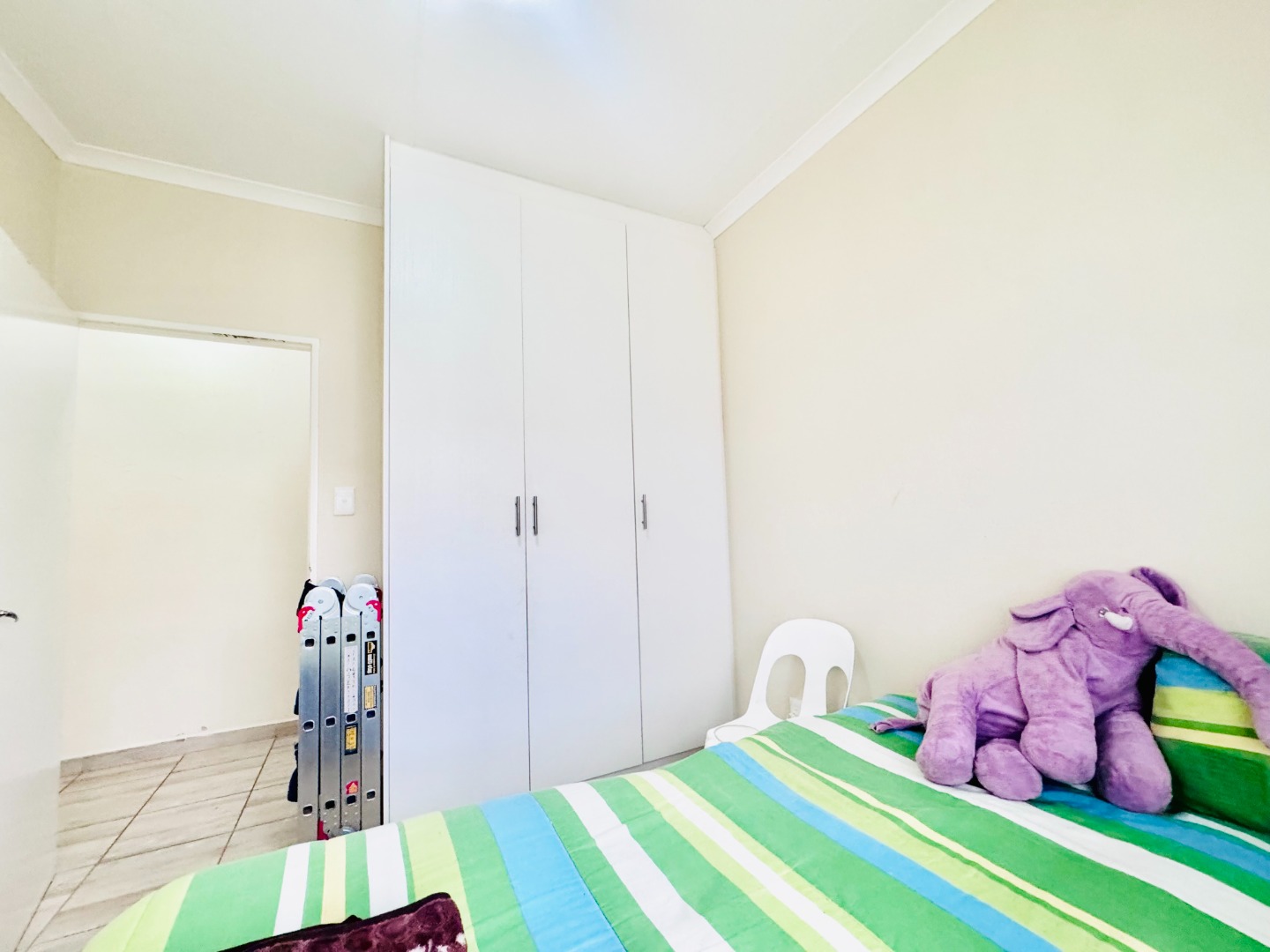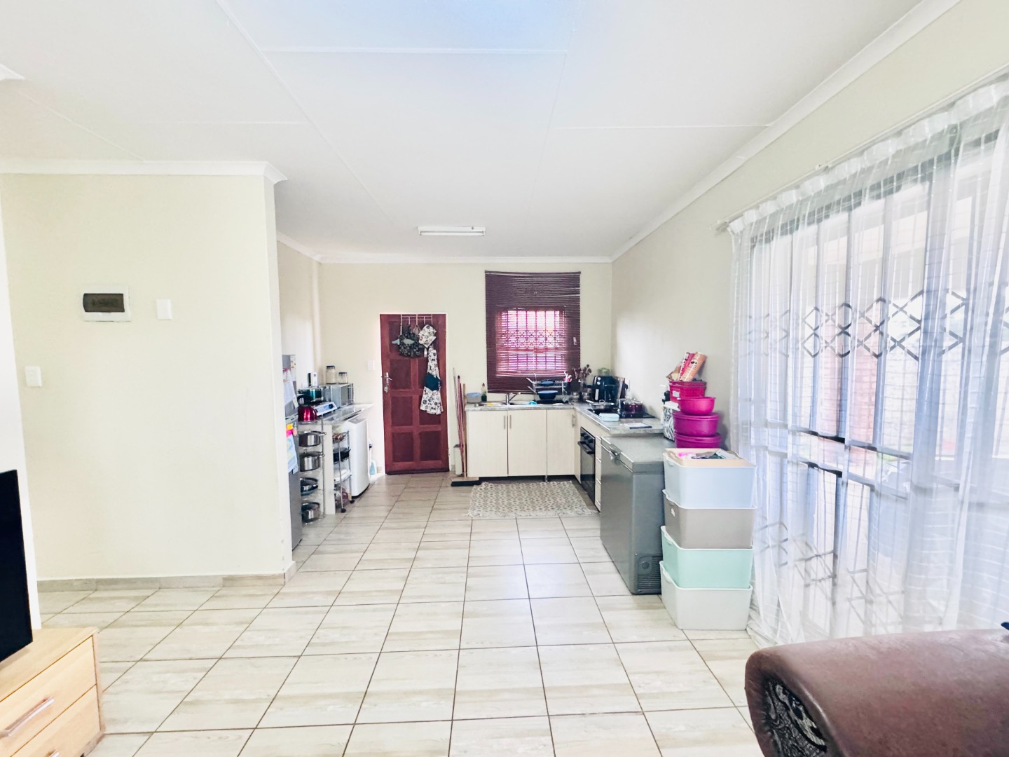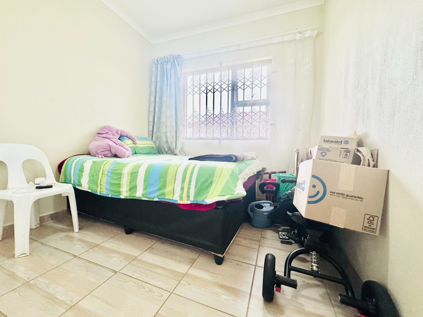 Inside, the home offers a practical and comfortable living environment. The bright lounge area, adorned with tiled flooring and neutral walls, provides a welcoming space. The functional kitchen is equipped with an L-shaped counter, ample storage, and space for essential appliances. Three comfortable bedrooms, all with tiled flooring, include a main bedroom with an en-suite bathroom and another with a built-in wardrobe.
