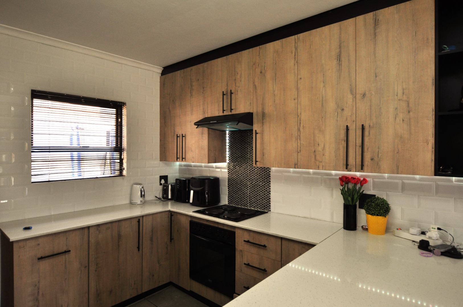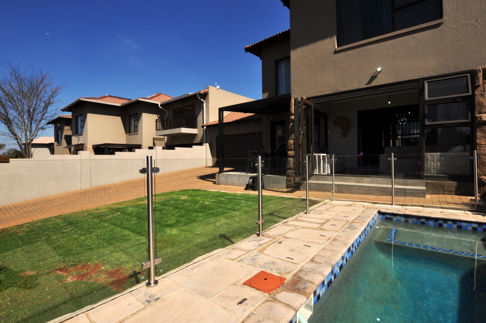 Discover an exquisite residence in the coveted Chancliff Ridge, Krugersdorp, South Africa, where sophisticated design meets unparalleled comfort. This magnificent 181 sqm home, set on a generous 313 sqm erf, presents a seamless open-plan living experience, meticulously crafted for the discerning homeowner. The heart of the home is a state-of-the-art kitchen, boasting elegant light wood-look cabinetry, pristine white quartz countertops, and a chic subway and mosaic tile backsplash. Integrated appliances, including an oven, hob, and microwave, are complemented by subtle under-cabinet lighting and a practical breakfast bar, perfect for casual dining or entertaining. The expansive lounge and dedicated family TV room flow effortlessly, offering versatile spaces for relaxation and social gatherings, with sliding doors providing direct access to the serene outdoors. This luxurious abode features three generously proportioned bedrooms and three impeccably appointed bathrooms, ensuring privacy and comfort for all residents. Each space is designed with a keen eye for detail, reflecting a commitment to quality and style. The outdoor oasis beckons with a private swimming pool and a beautifully landscaped garden, creating an idyllic setting for leisure and alfresco enjoyment. The property further enhances its lifestyle appeal with a dedicated braai room, ideal for entertaining. Practical amenities include two secure garages and an additional four parking spaces, ensuring ample accommodation for vehicles. Embracing modern living, this residence is equipped with fibre connectivity and sustainable features such as solar panels and water tanks, promoting efficiency and eco-conscious living. The property is totally walled, offering enhanced privacy and security, and is pet-friendly. With its modern aesthetic, paved driveway, and scenic views, this home exudes kerb appeal and promises a lifestyle of refined elegance. Key Features: * 3 Bedrooms, 3 Bathrooms * Modern Open-Plan Kitchen with Quartz Countertops * Integrated Appliances & Breakfast Bar * Lounge and Family TV Room * Private Swimming Pool & Garden * Dedicated Braai Room * 2 Garages, 4 Additional Parking Spaces * Fibre Connectivity & Solar Panels * Water Tanks & Totally Walled Property * Scenic Views