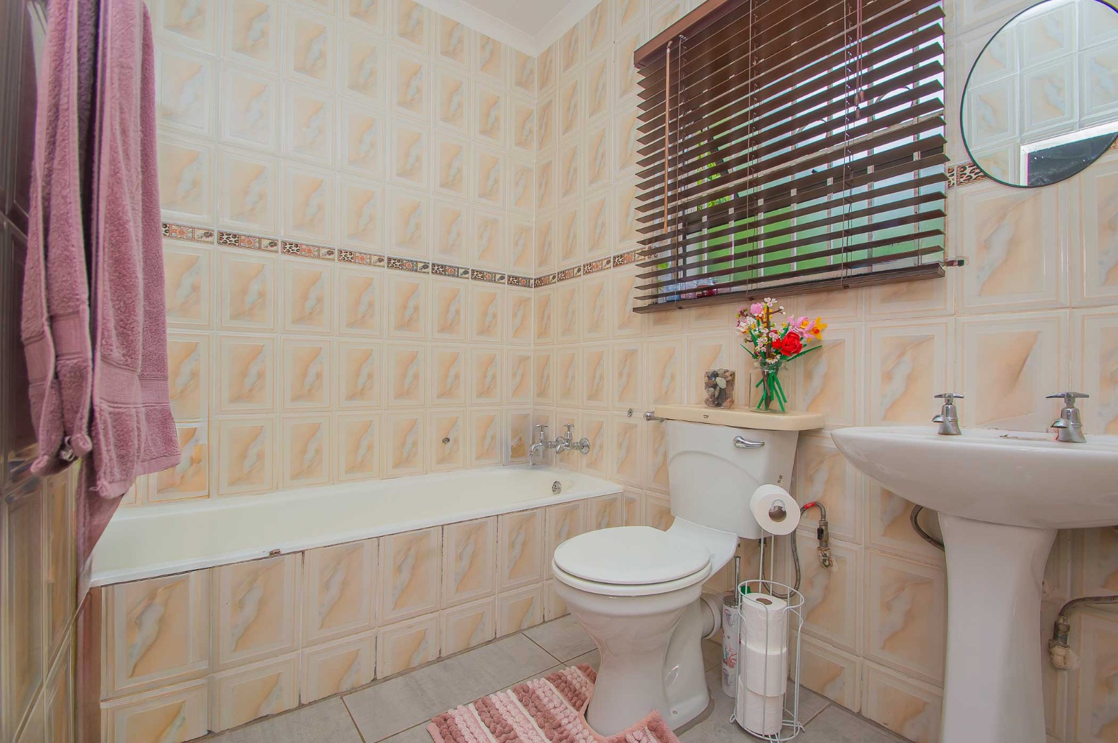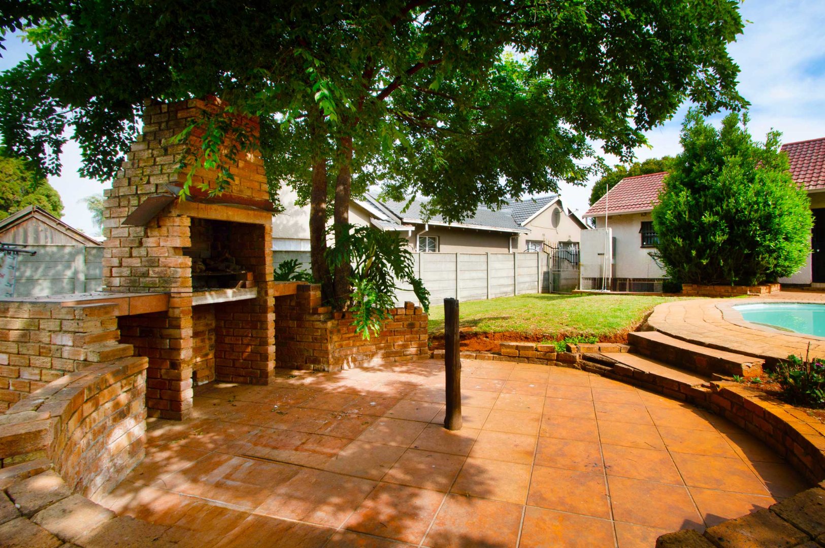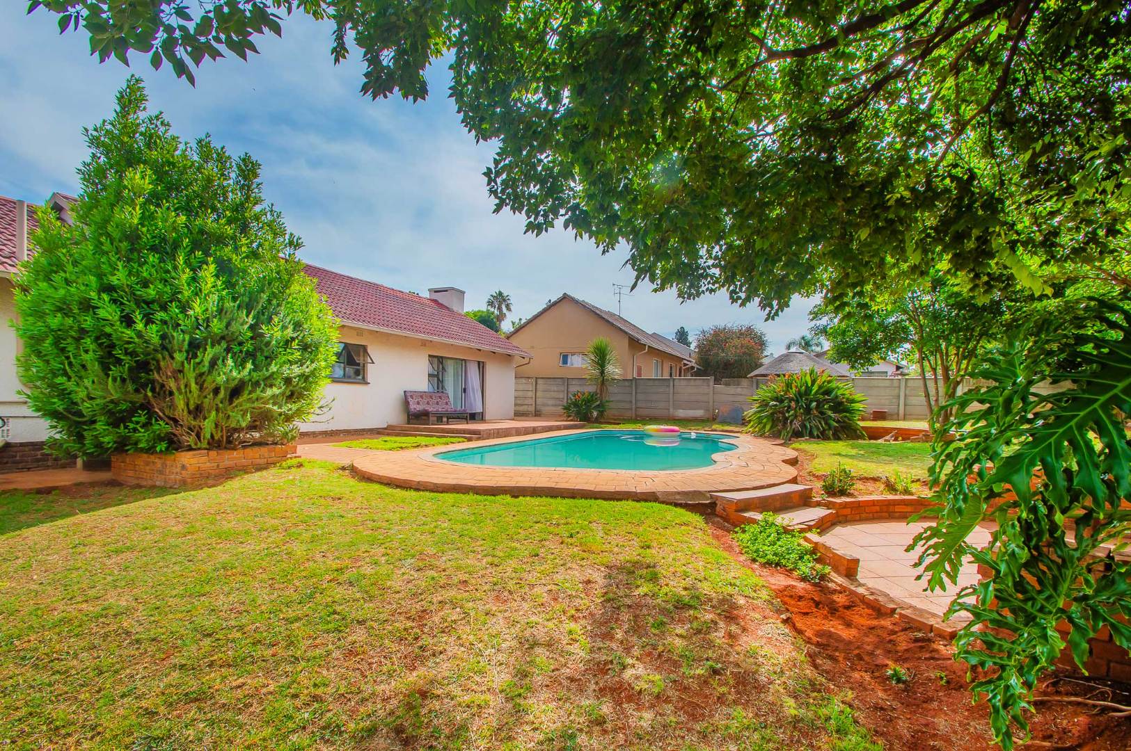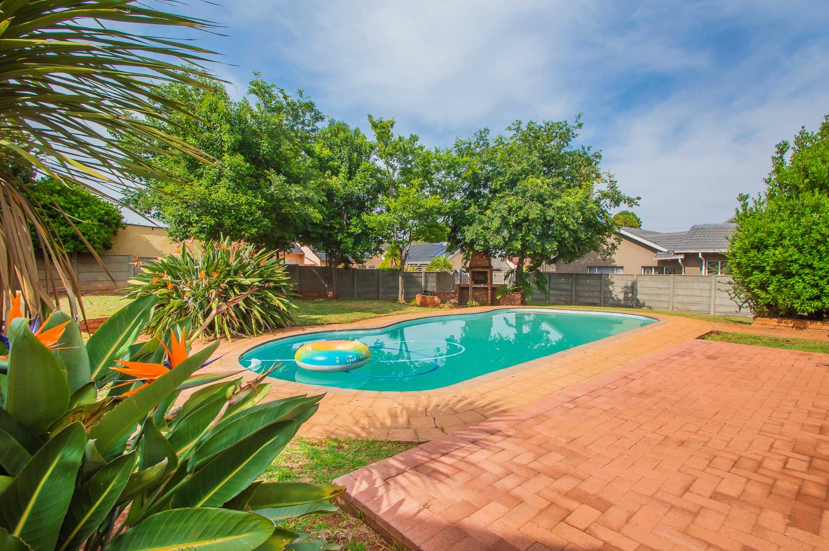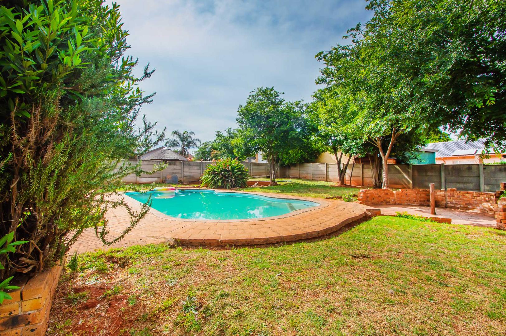Accommodation includes three generously proportioned bedrooms and two bathrooms, with one being an en-suite for enhanced privacy. The outdoor amenities are a highlight, featuring a swimming pool, perfect for relaxation and recreation. The expansive backyard boasts a built-in braai, ideal for entertaining guests. Mature trees and lush landscaping create a serene garden environment, complemented by extensive paving around the pool area. Pets are permitted, and the property benefits from a totally walled perimeter and an access gate.