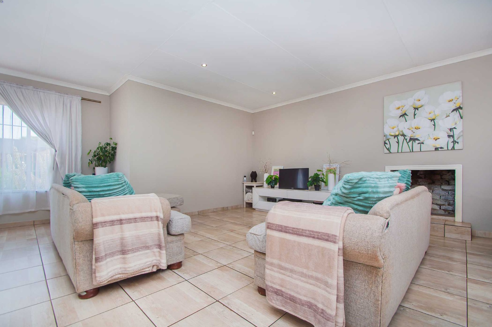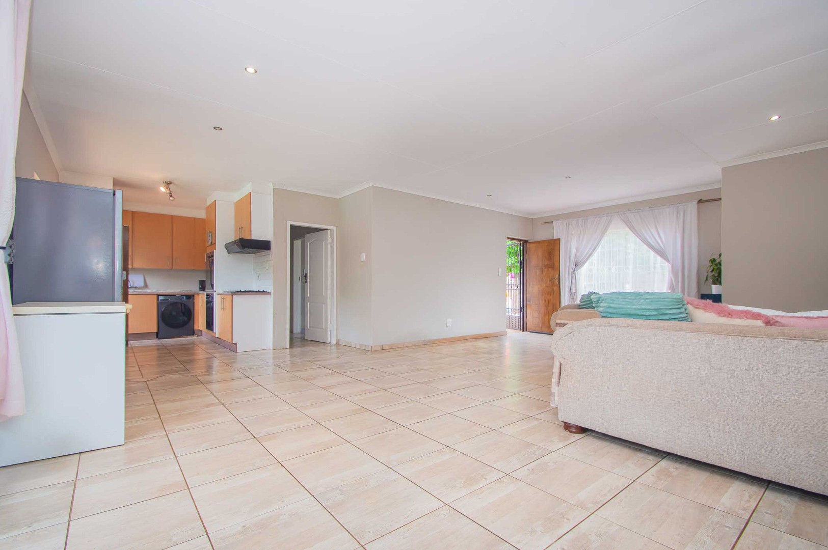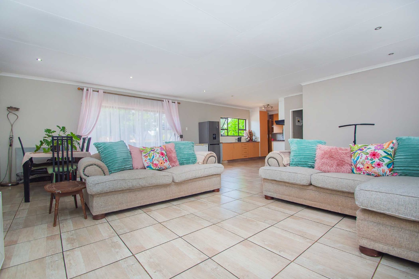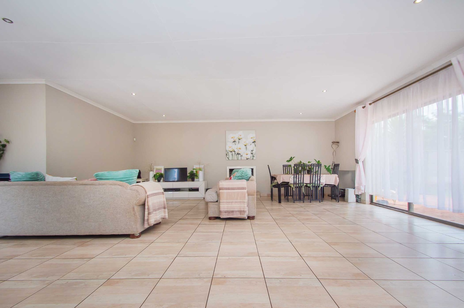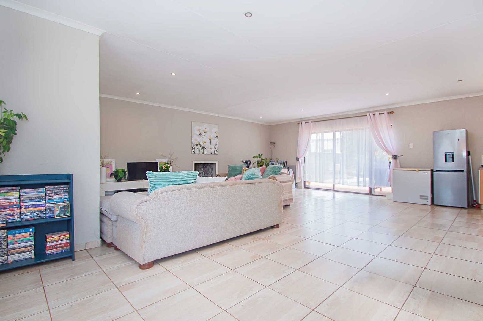Upon entry, the interior reveals a thoughtfully designed layout conducive to modern living. The expansive open-plan living and dining areas are bathed in natural light, courtesy of large sliding glass doors offering seamless access to outdoor spaces. Neutral wall tones, practical tiled flooring, and recessed lighting contribute to a bright and inviting atmosphere. The residence further comprises a dedicated lounge, a dining room, and a well-appointed kitchen, facilitating comfortable daily routines. A fireplace adds a touch of warmth and ambiance.
