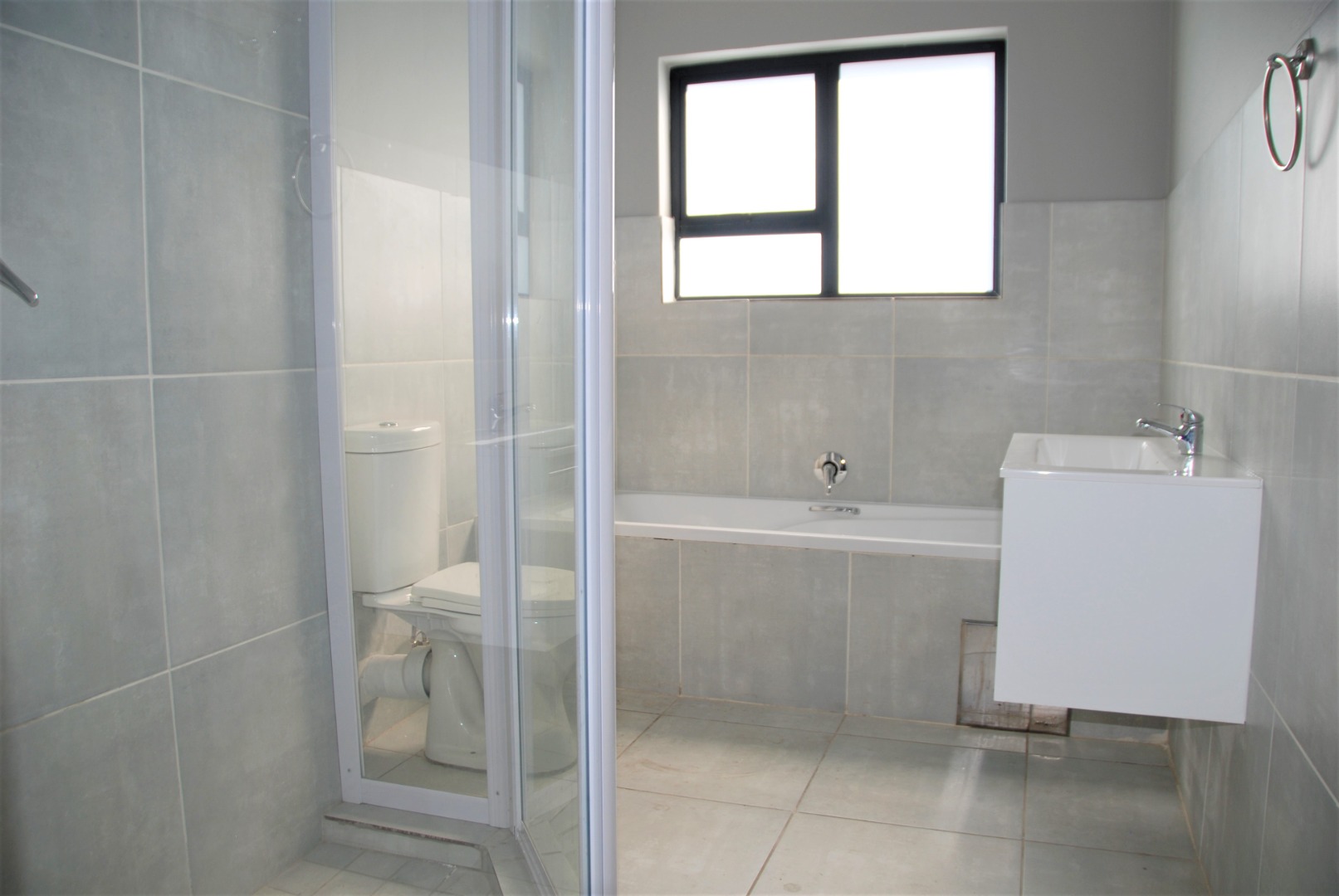 The three bedrooms are generously sized, each featuring modern wood-look laminate flooring and plenty of natural light. Two well-appointed bathrooms boast grey tiling, a separate shower and bathtub, and floating vanities for a clean, contemporary finish.