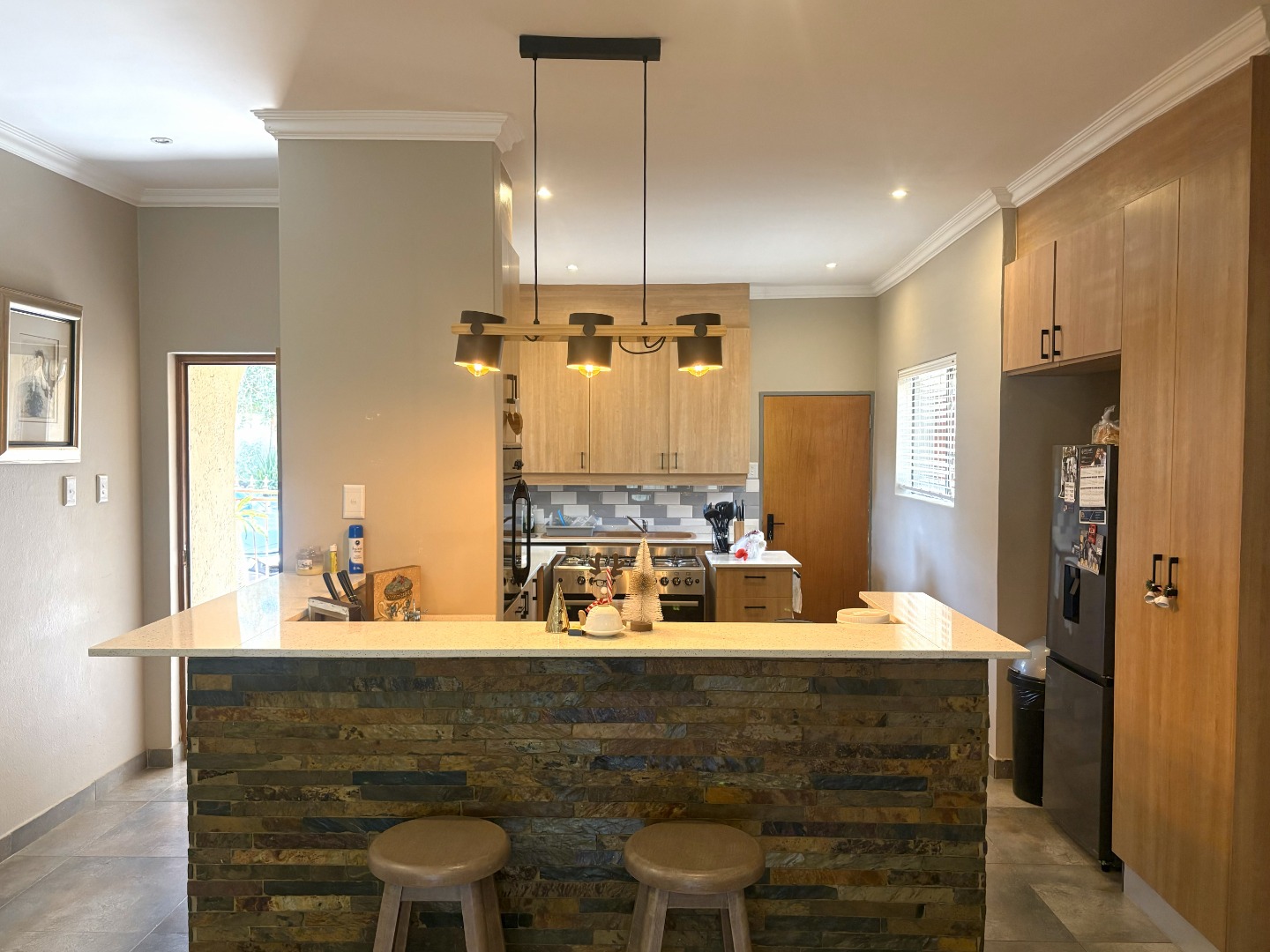 The welcoming open-plan layout offers a modern, stylish feel with quality finishes throughout. The contemporary kitchen is a standout feature, fitted with light wood-toned cabinetry, ample cupboard space, and a gas stove and oven. A striking stone-clad breakfast nook elegantly separates the kitchen from the living area, creating both functionality and visual appeal.