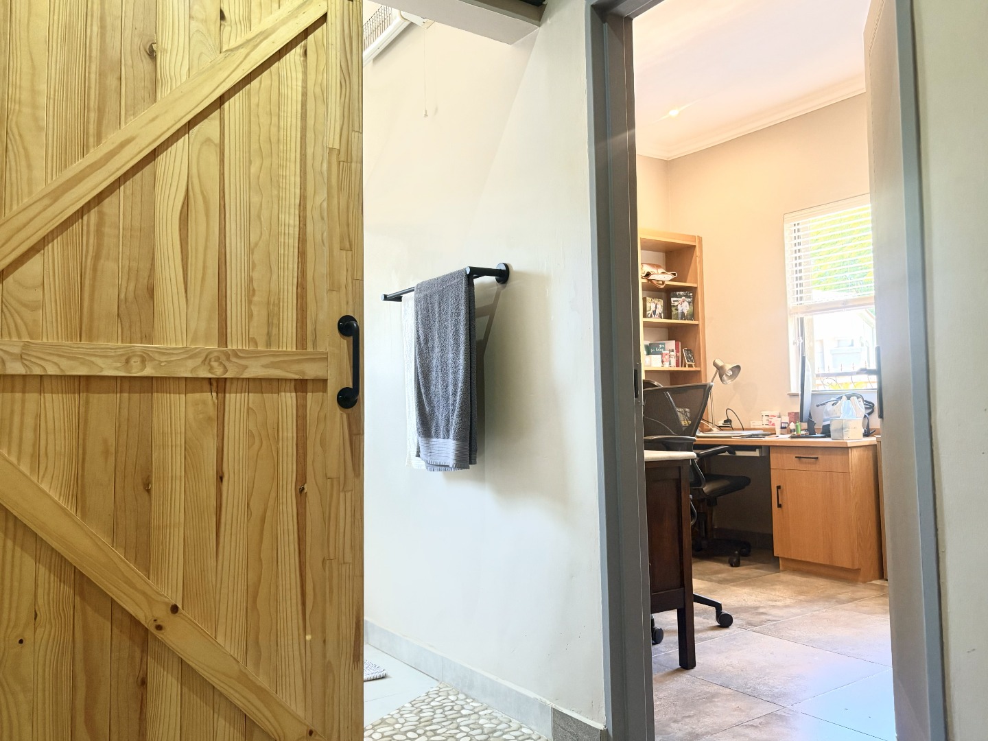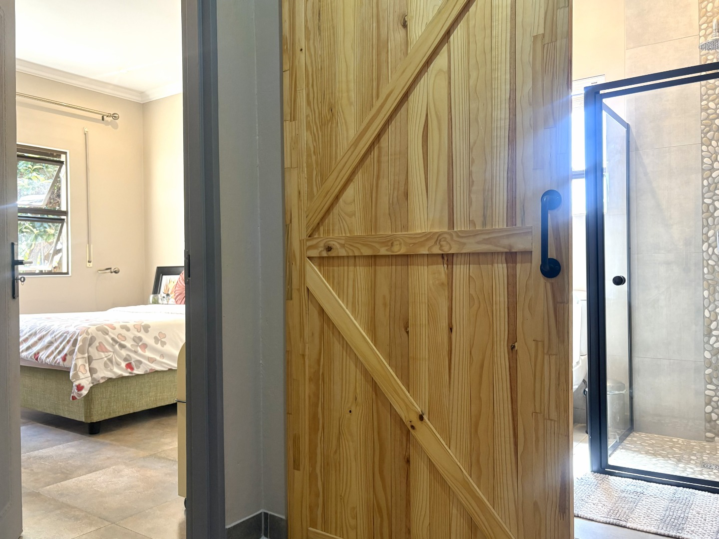 All three bedrooms are generously sized, with the main bedroom featuring a well-appointed en-suite bathroom. The second bathroom is conveniently positioned between the remaining bedrooms and is enhanced by a charming wooden barn door.