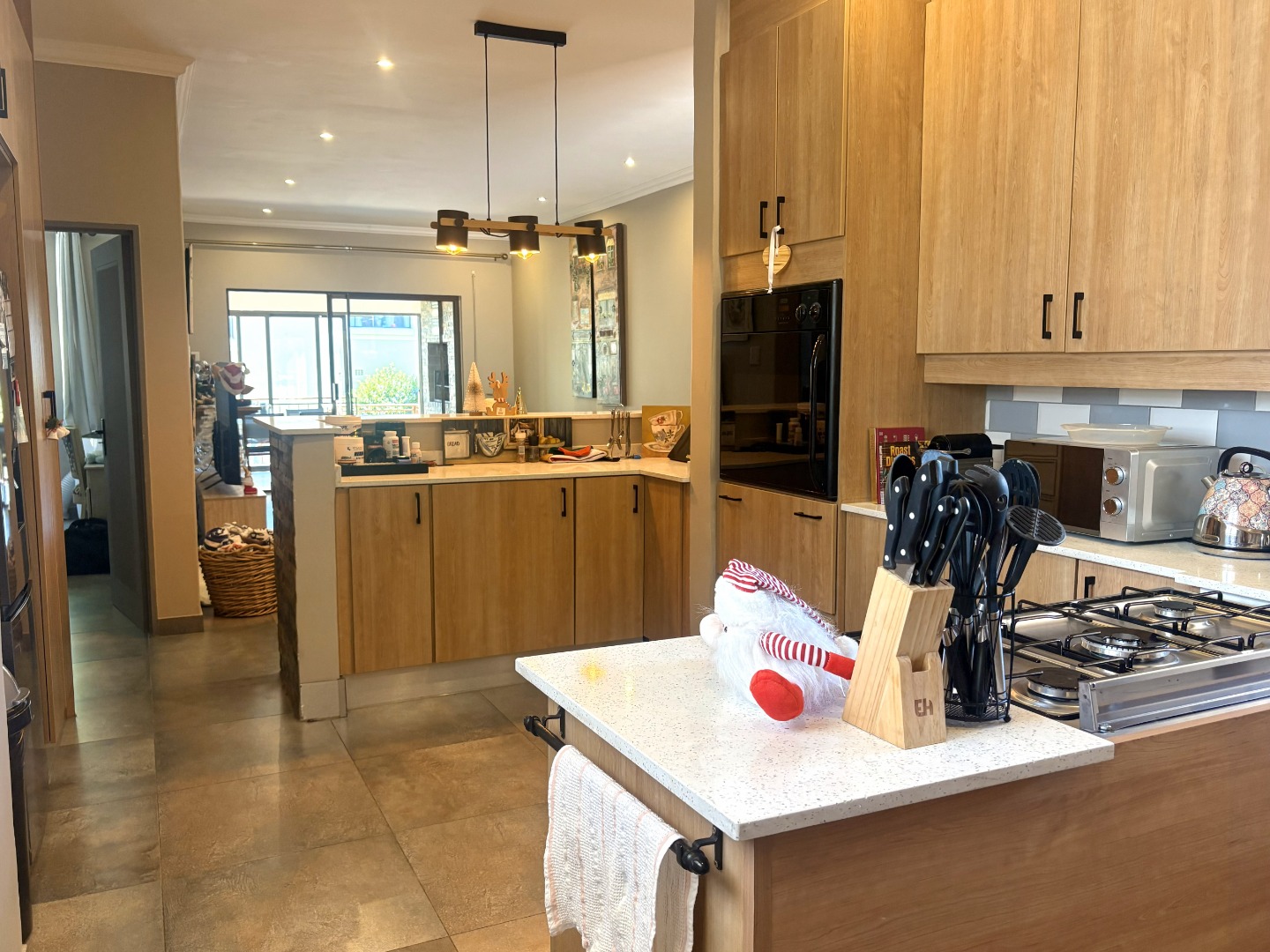 The welcoming open-plan layout offers a modern, stylish feel with quality finishes throughout. The contemporary kitchen is a standout feature, fitted with light wood-toned cabinetry, ample cupboard space, and a gas stove and oven. A striking stone-clad breakfast nook elegantly separates the kitchen from the living area, creating both functionality and visual appeal.