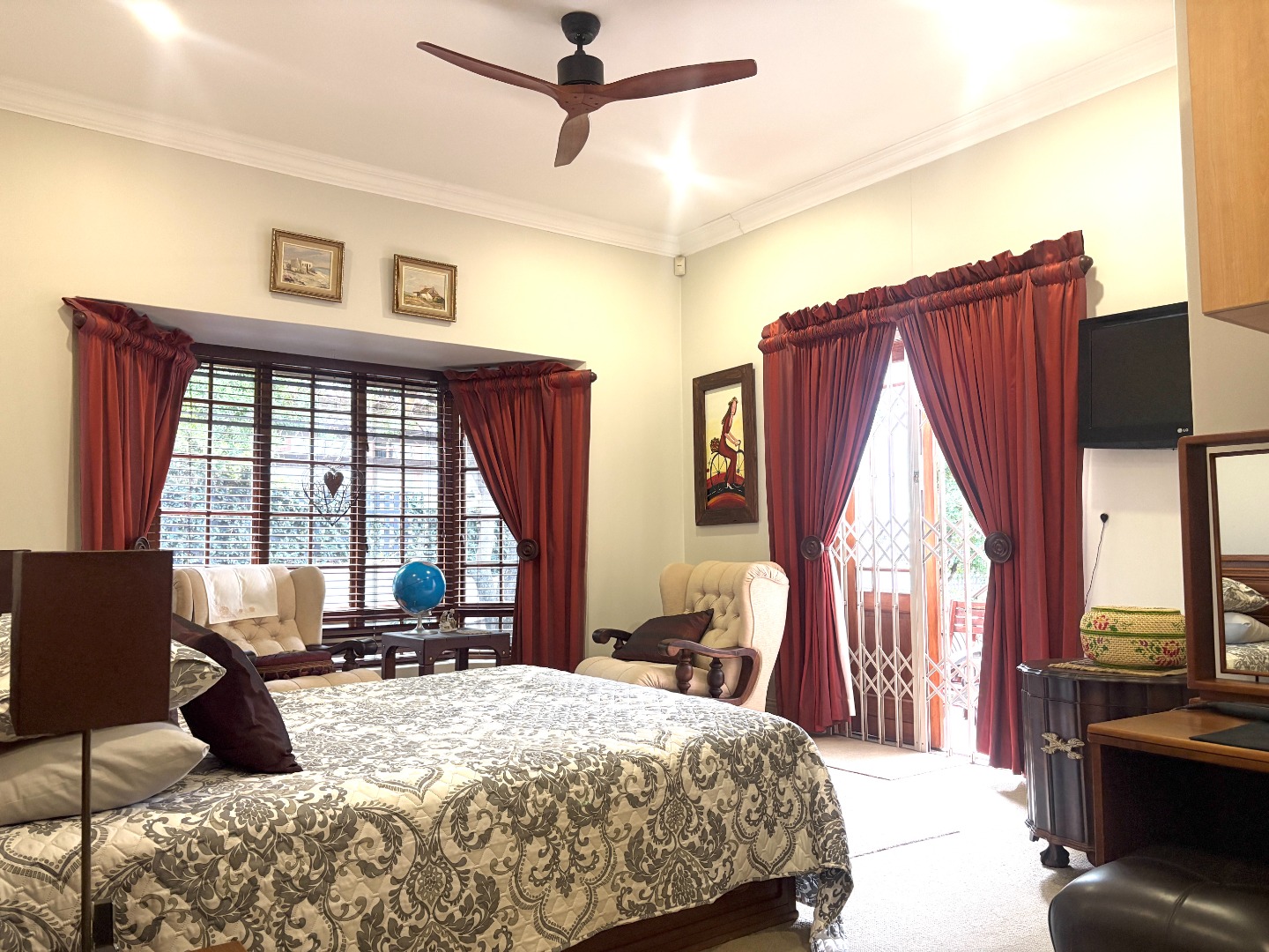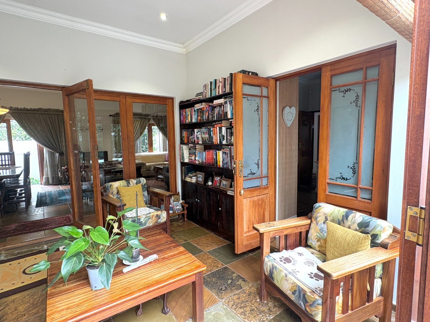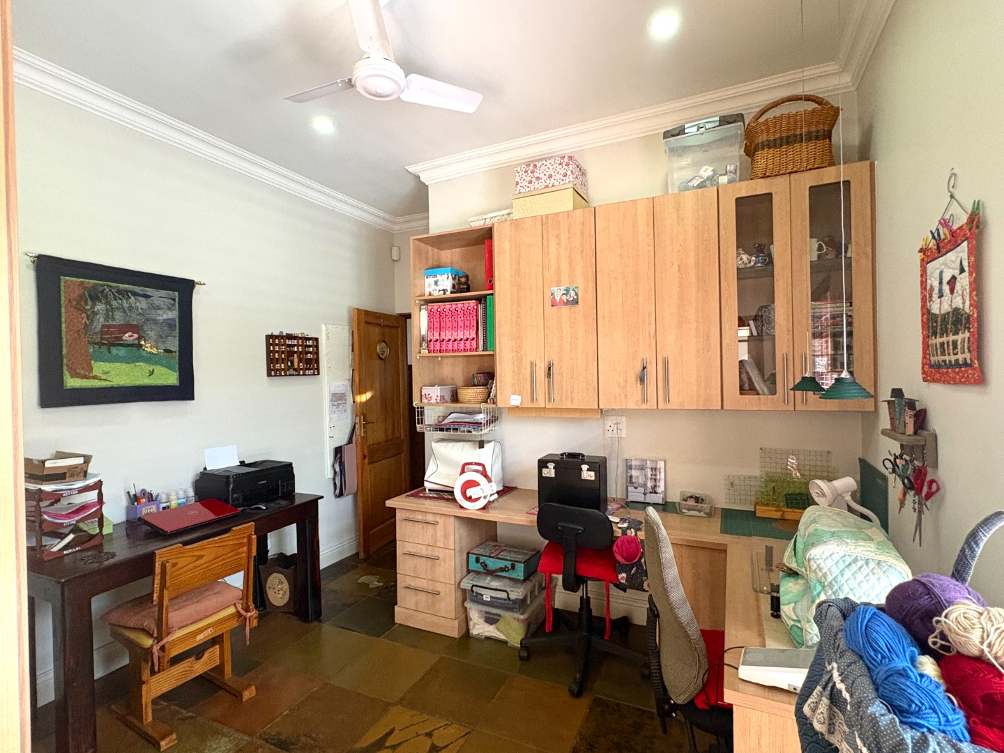 This home offers three bedrooms, or two bedrooms with a study. Two of the bedrooms are complete with built in cupboards, and share a near-by bathroom fitted with a shower, basin and toilet. The spacious main bedroom is a private retreat, complete with ample cupboard space, a ceiling fan, direct access to the patio, and an en suite bathroom with a bath, basin and toilet.