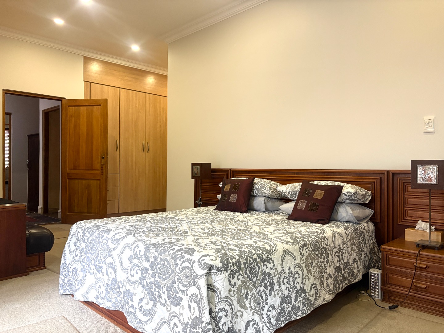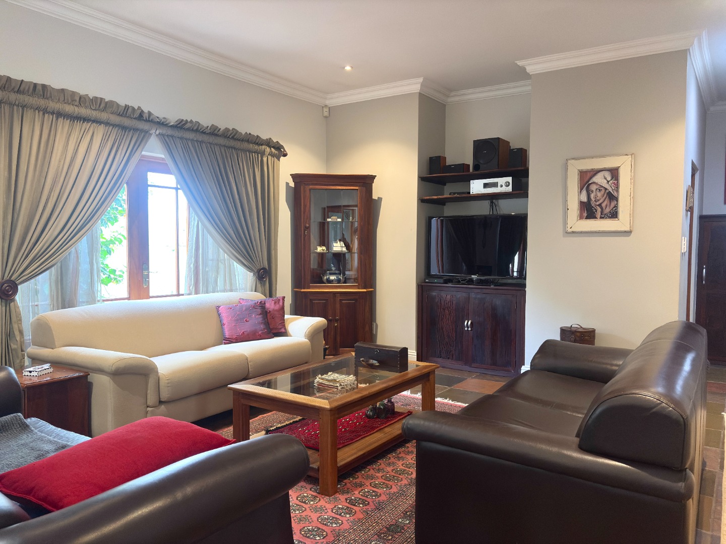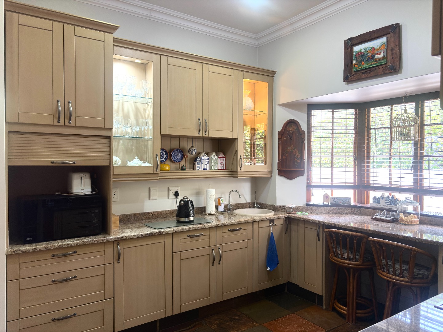 The heart of the home is a well-appointed kitchen featuring a pantry, microwave cut out, electric stove and oven, space for a double fridge, and a separate scullery with room for two appliances and direct access to a courtyard, designed with both practicality and convenience in mind.