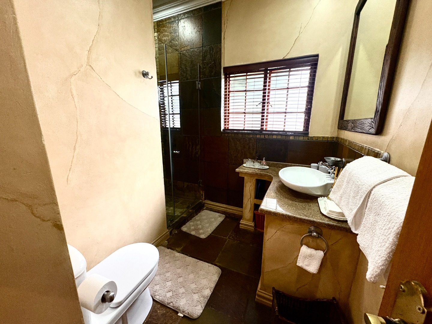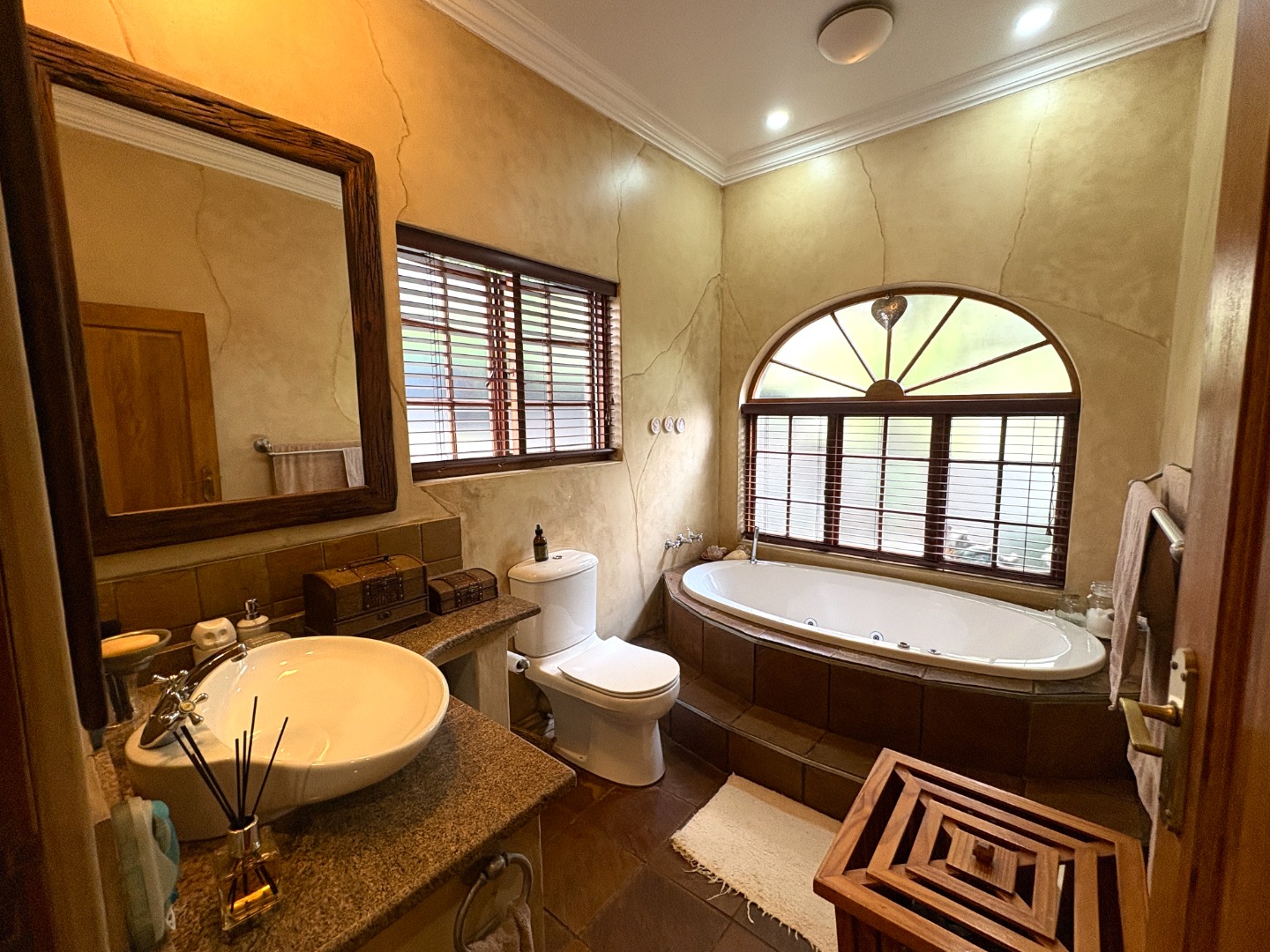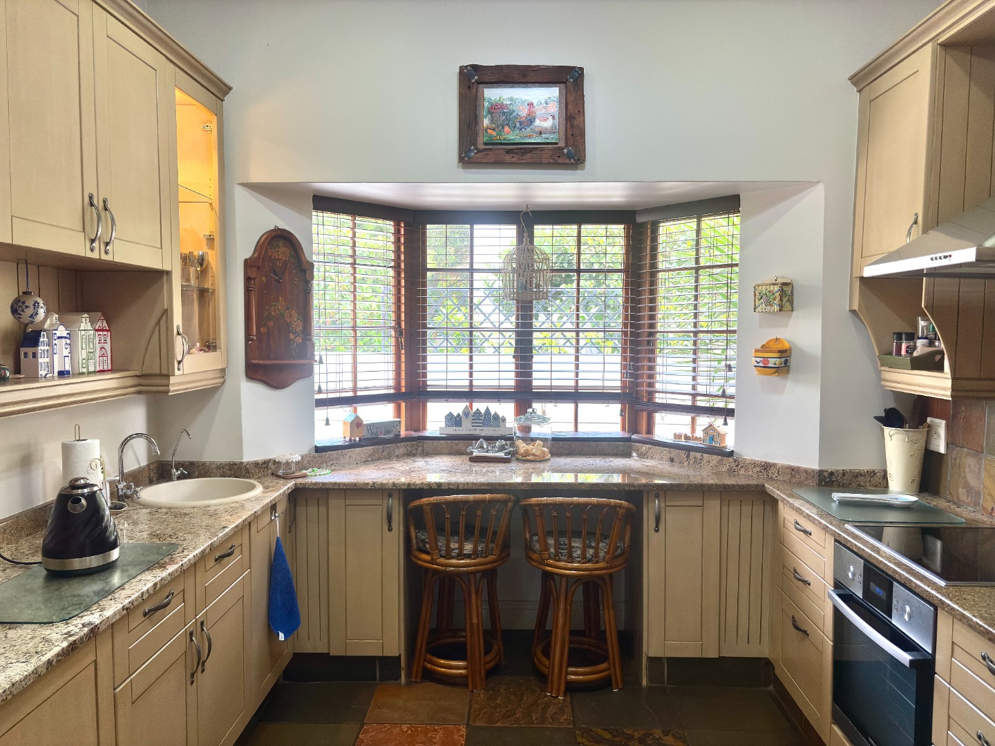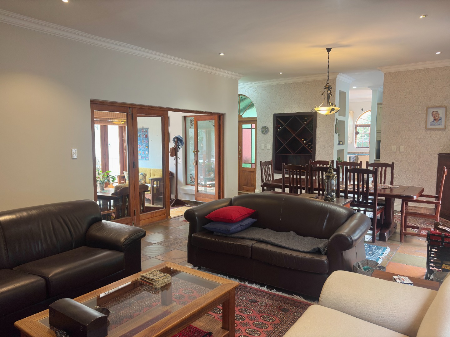 The heart of the home is a well-appointed kitchen featuring a pantry, microwave cut out, electric stove and oven, space for a double fridge, and a separate scullery with room for two appliances and direct access to a courtyard, designed with both practicality and convenience in mind.
