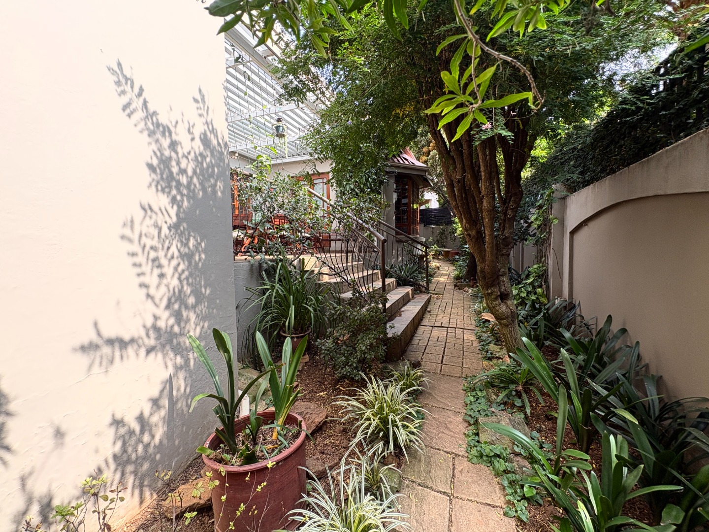 The lush garden is a haven for nature lovers, beautifully designed with established plants and a peaceful seating area, perfect for morning coffee or quiet moments. Additional features include two raised garden beds, an outside bathroom, and extra storage in the double garage.