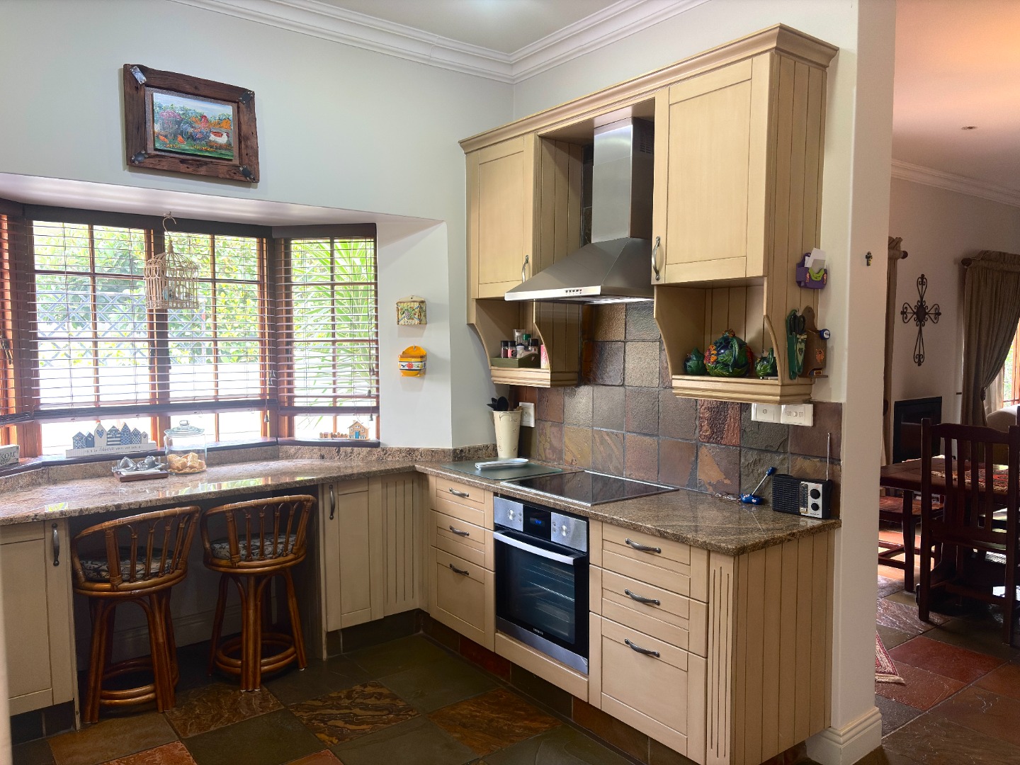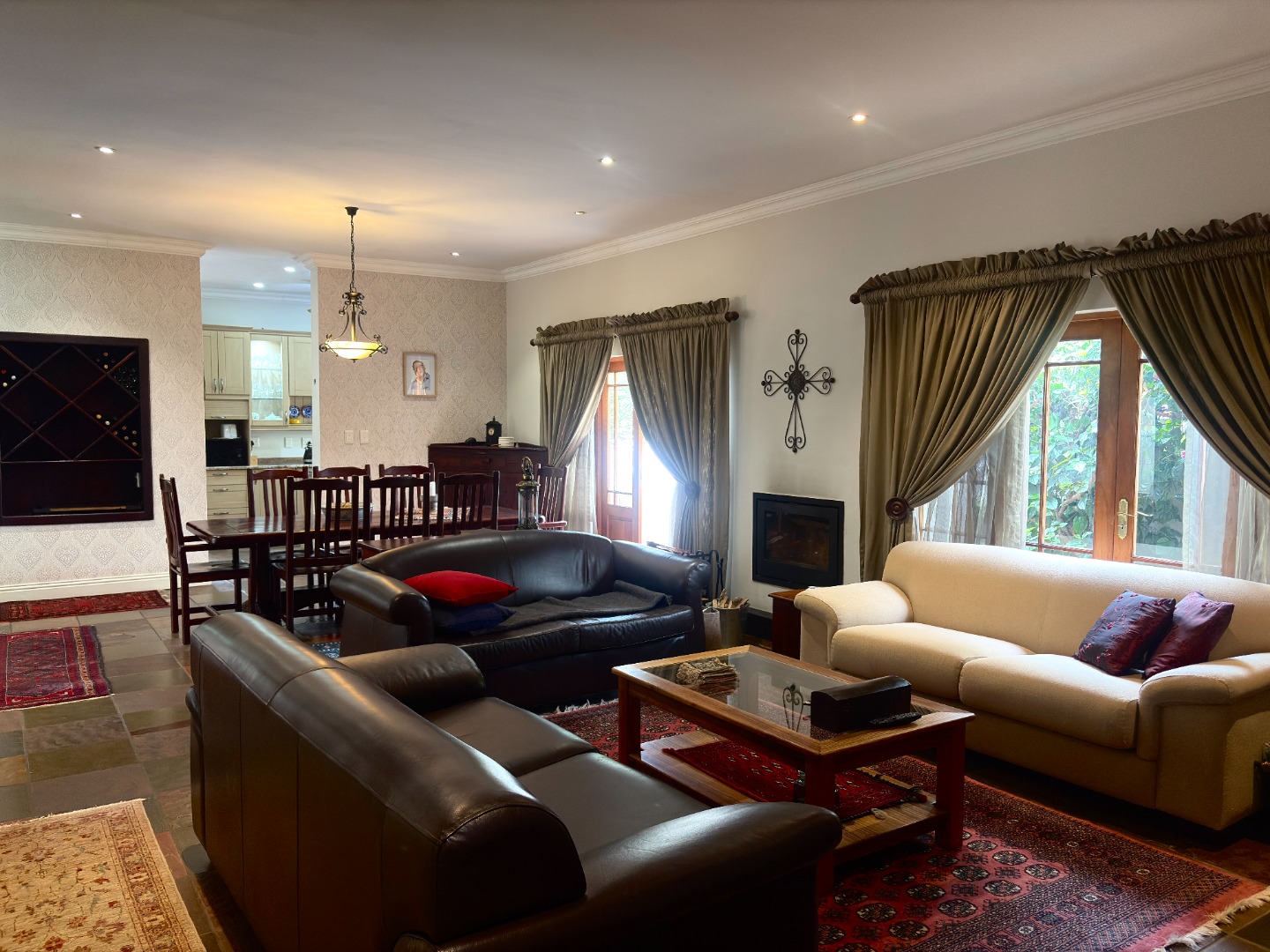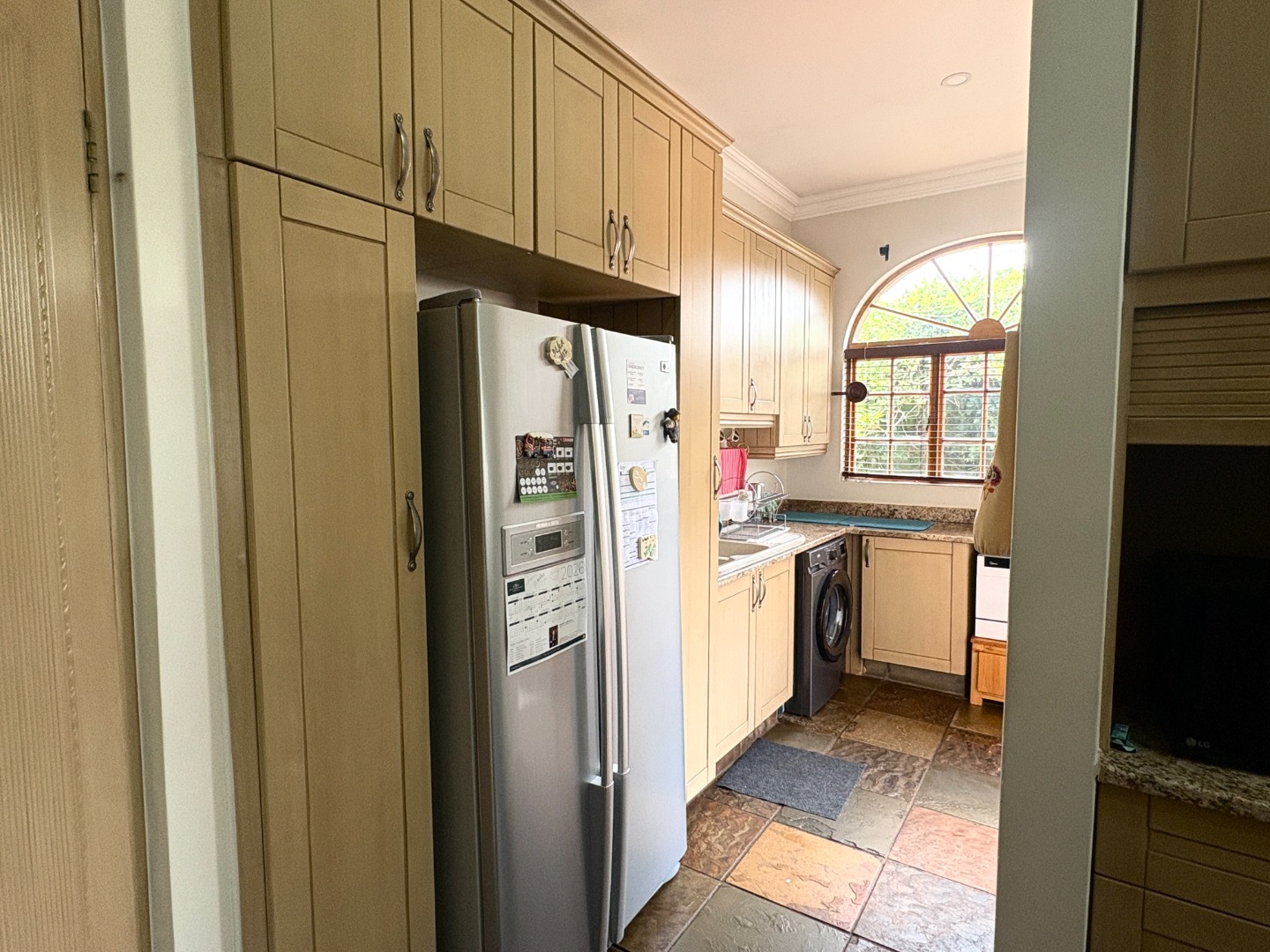 The heart of the home is a well-appointed kitchen featuring a pantry, microwave cut out, electric stove and oven, space for a double fridge, and a separate scullery with room for two appliances and direct access to a courtyard, designed with both practicality and convenience in mind.