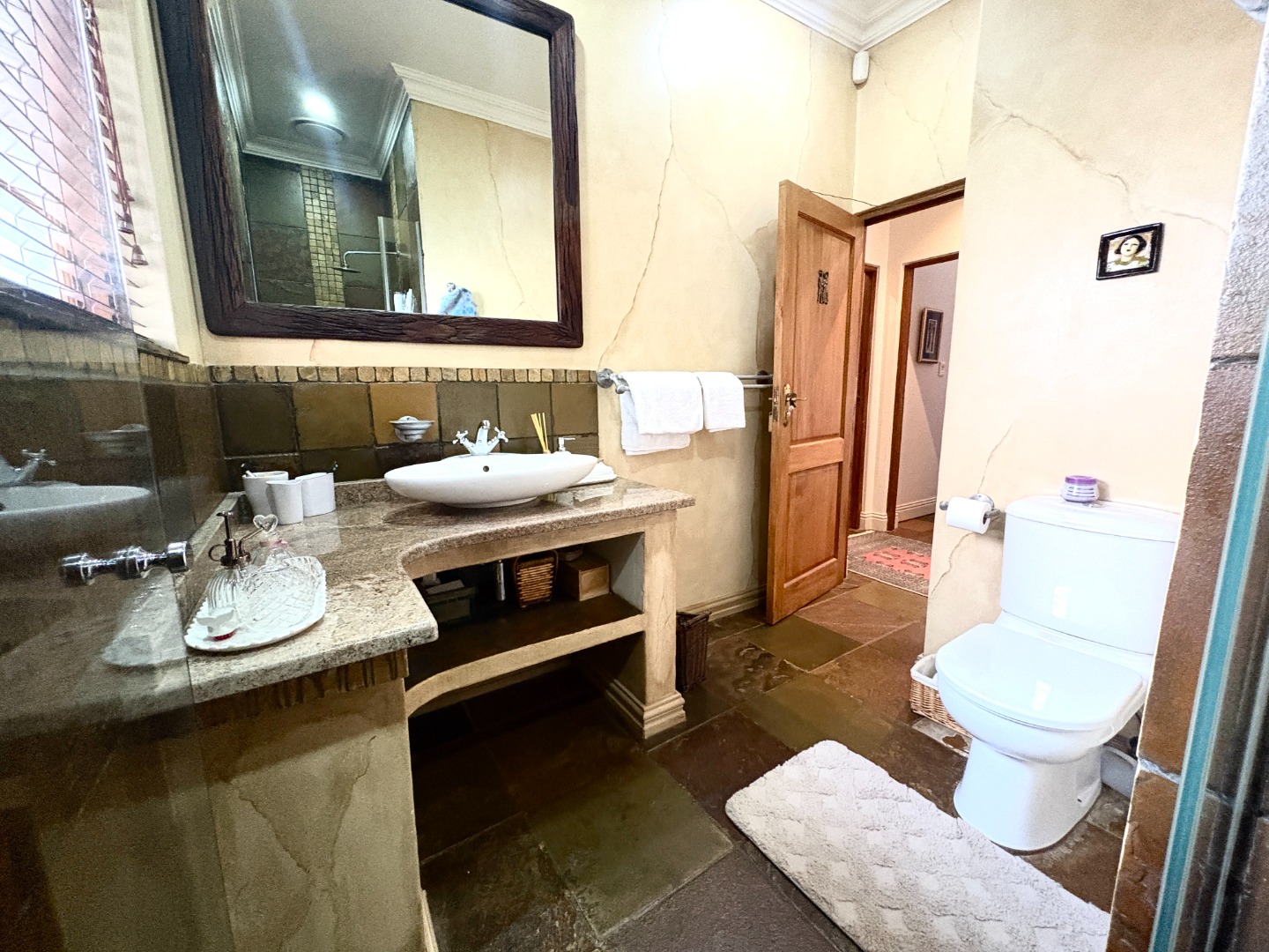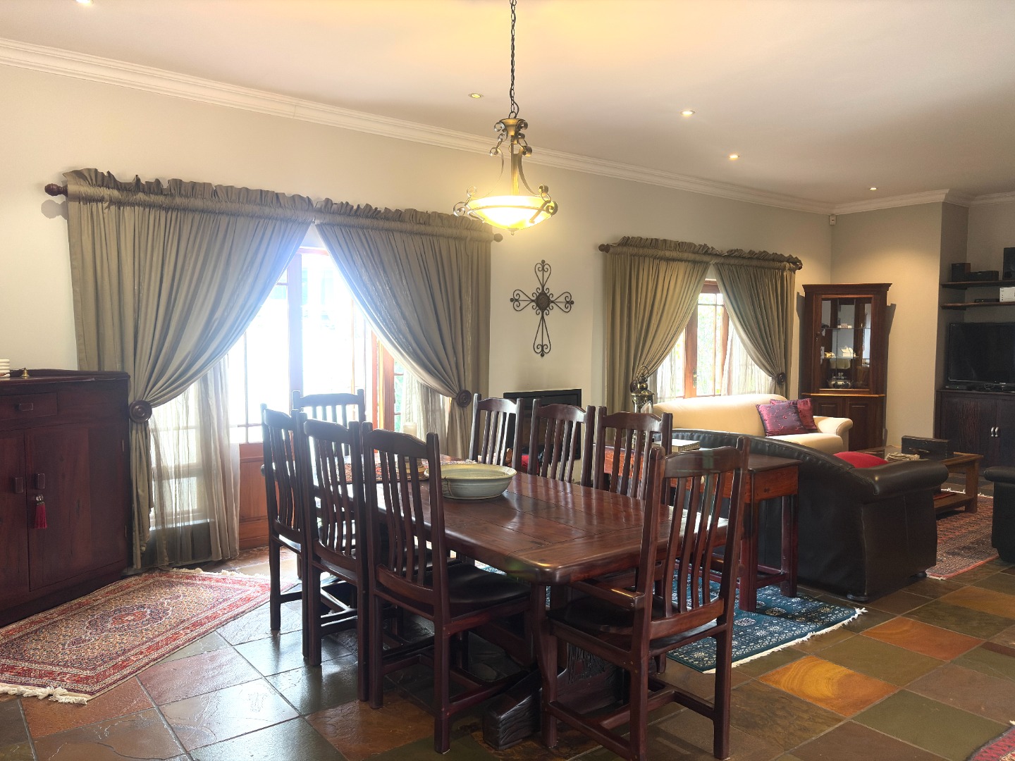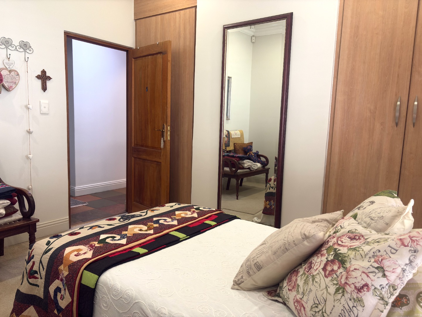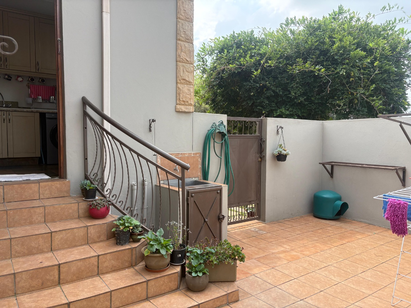 The heart of the home is a well-appointed kitchen featuring a pantry, microwave cut out, electric stove and oven, space for a double fridge, and a separate scullery with room for two appliances and direct access to a courtyard, designed with both practicality and convenience in mind.