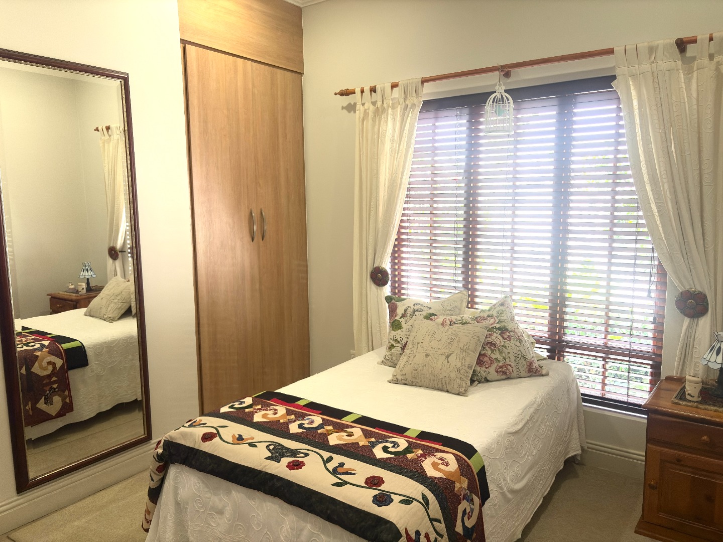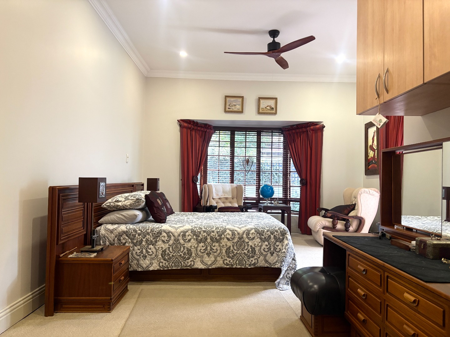 This home offers three bedrooms, or two bedrooms with a study. Two of the bedrooms are complete with built in cupboards, and share a near-by bathroom fitted with a shower, basin and toilet. The spacious main bedroom is a private retreat, complete with ample cupboard space, a ceiling fan, direct access to the patio, and an en suite bathroom with a bath, basin and toilet.