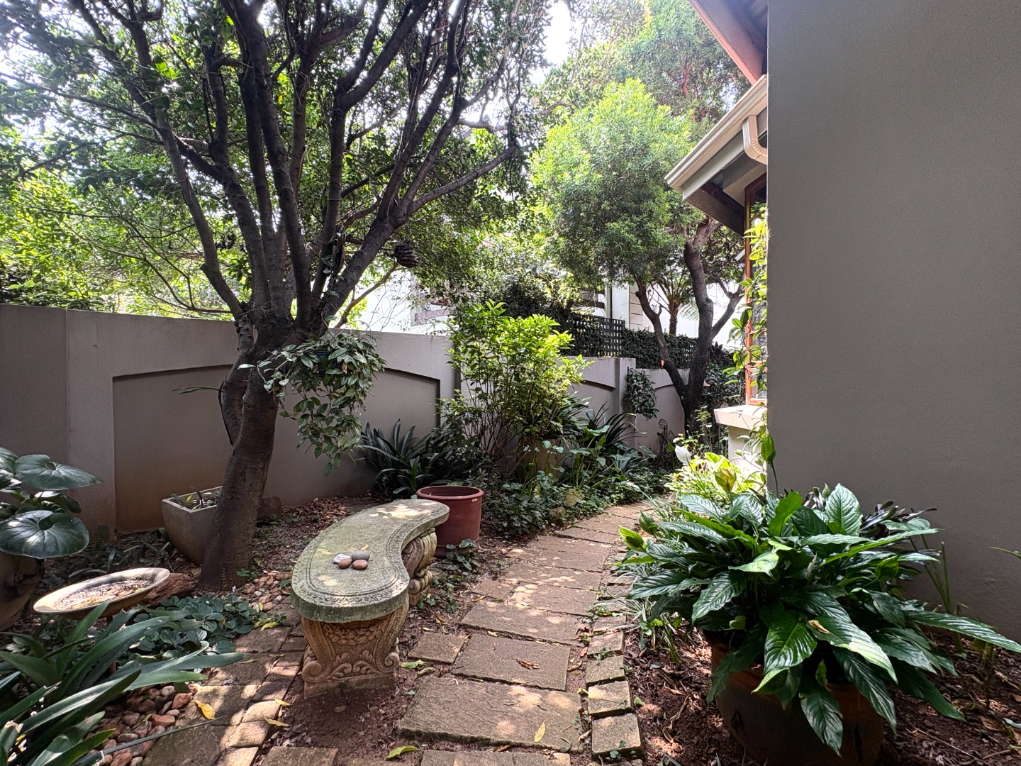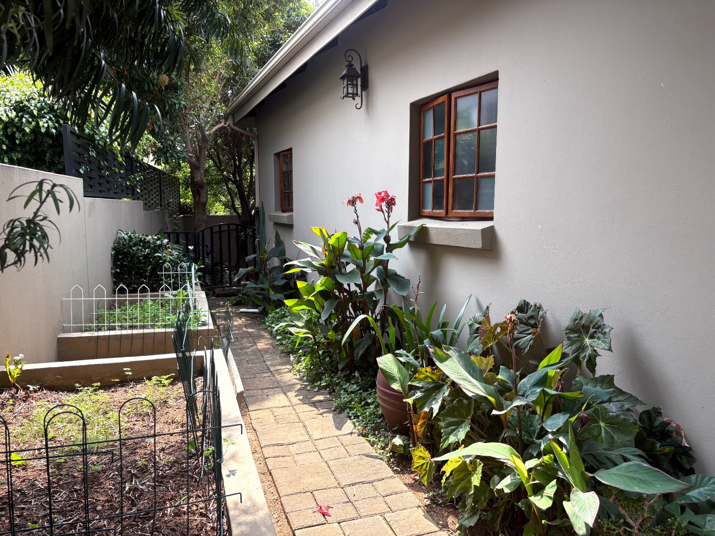 The lush garden is a haven for nature lovers, beautifully designed with established plants and a peaceful seating area, perfect for morning coffee or quiet moments. Additional features include two raised garden beds, an outside bathroom, and extra storage in the double garage.