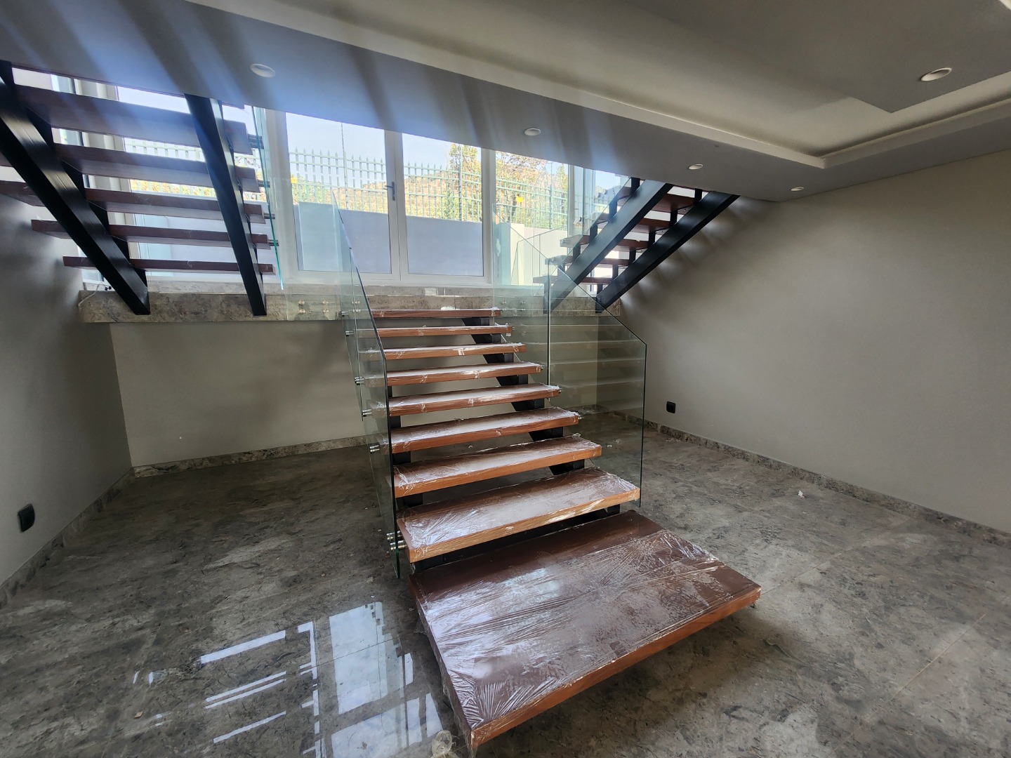 Outdoor plans include a private swimming pool and a pet-friendly garden — ideal for enjoying sunny South African days with family and friends. The property also offers staff quarters, three garages, and eight additional parking bays, providing ample space for residents and guests.