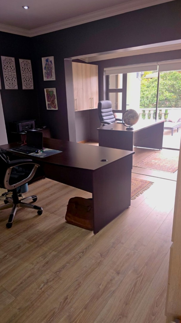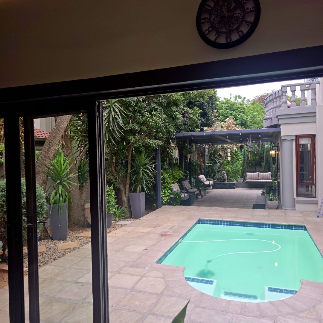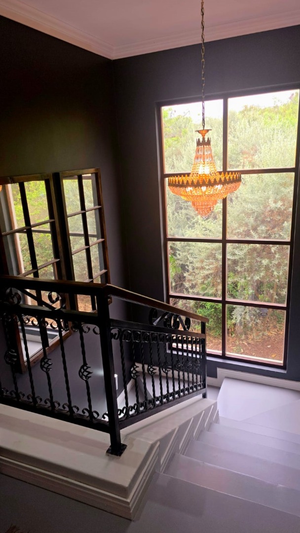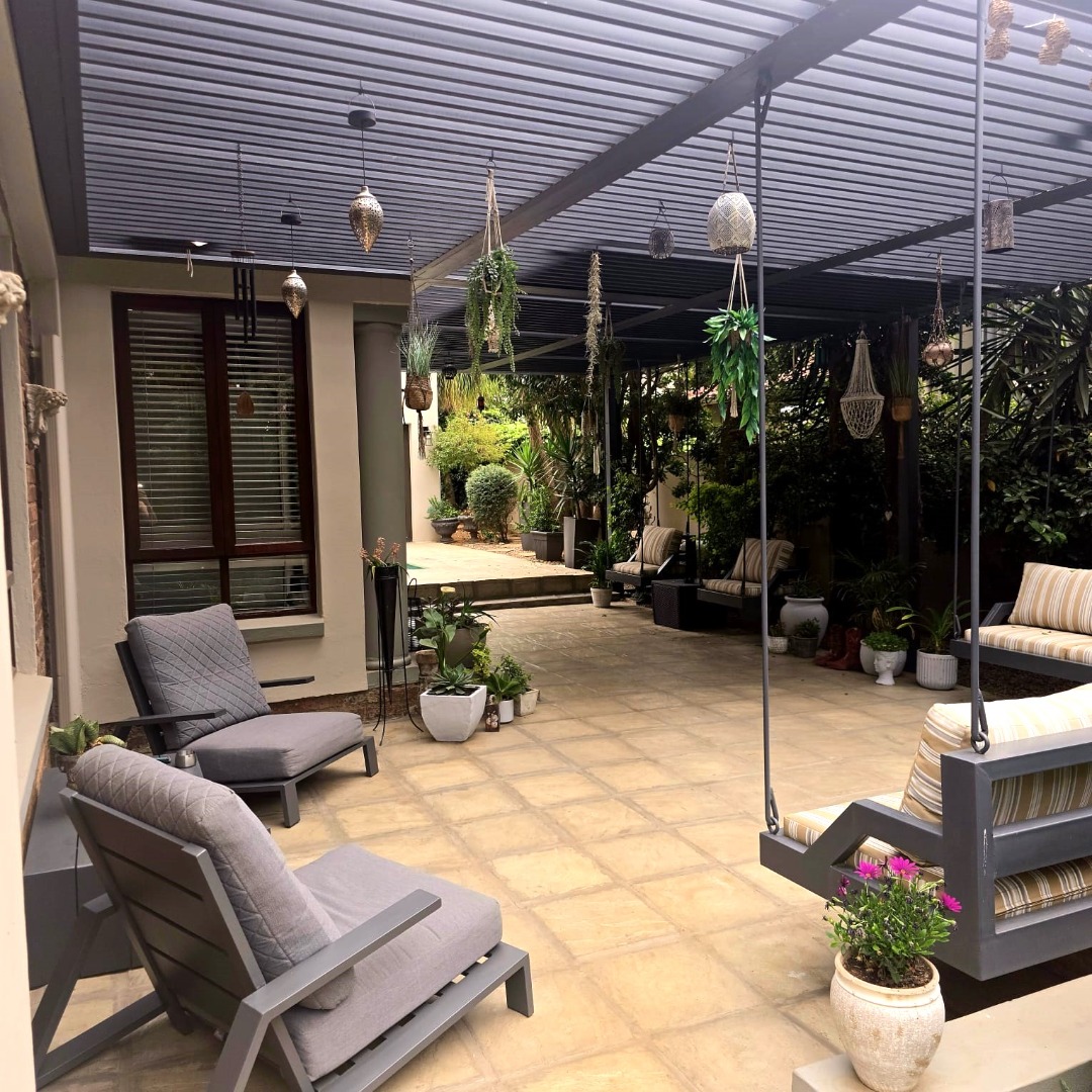 Comfort is paramount with four spacious bedrooms and three bathrooms upstairs, ensuring privacy and convenience for all residents. Additional, features include a gym room and air conditioning in every room. The property also includes staff quarters, adding to its practical appeal. Outdoor living is equally impressive, featuring a refreshing pool for relaxation and a pergola with built-in hanging chairs.