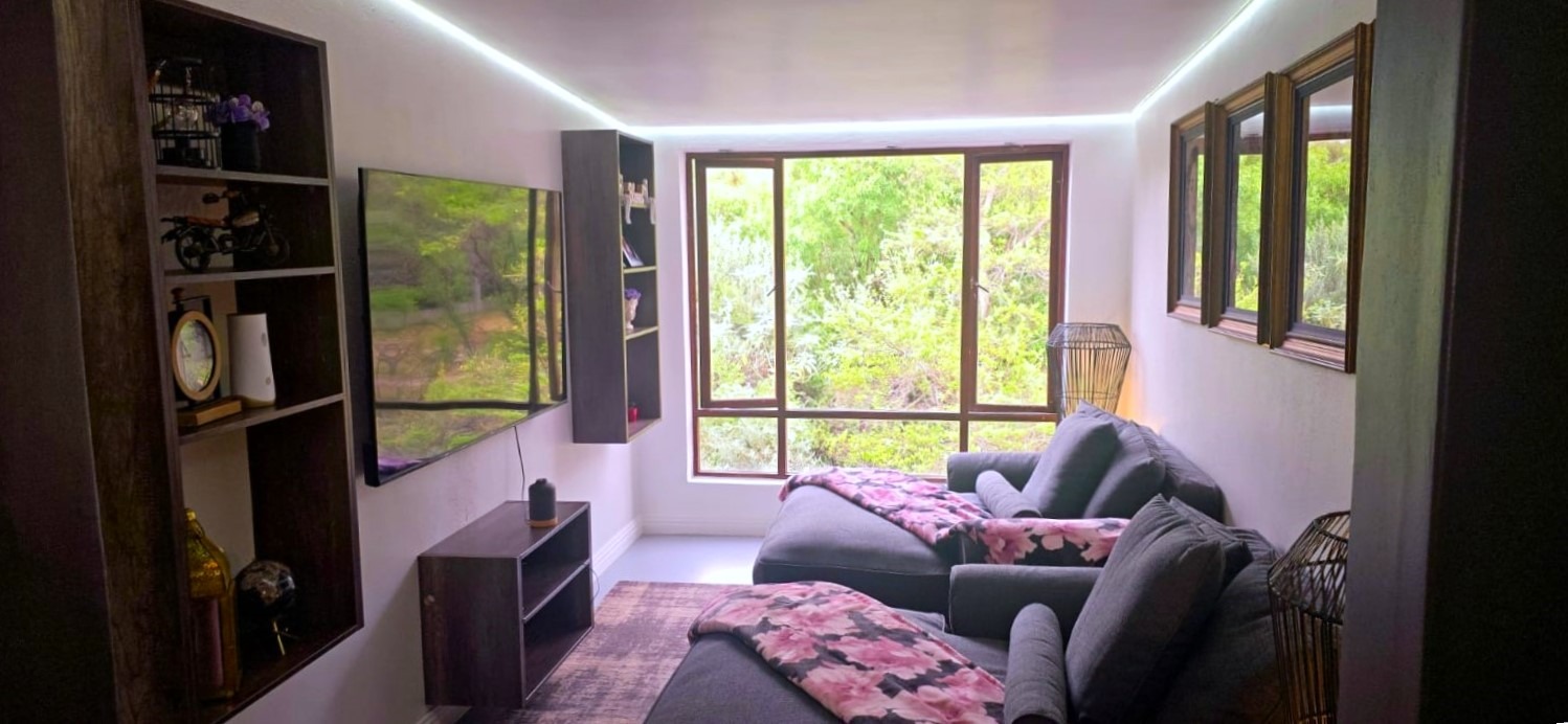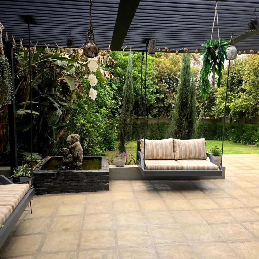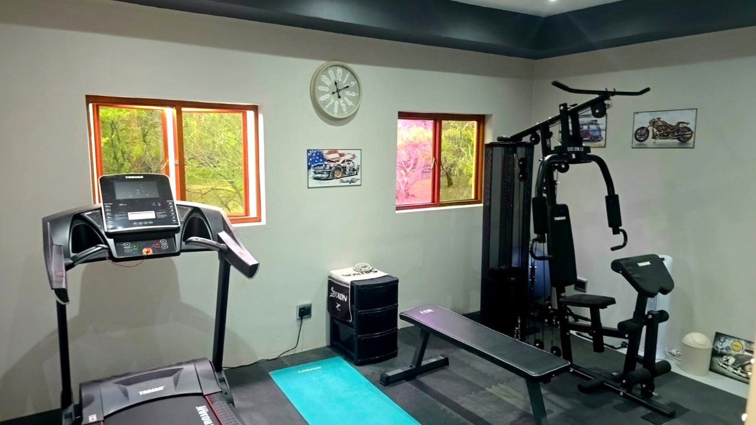 Comfort is paramount with four spacious bedrooms and three bathrooms upstairs, ensuring privacy and convenience for all residents. Additional, features include a gym room and air conditioning in every room. The property also includes staff quarters, adding to its practical appeal. Outdoor living is equally impressive, featuring a refreshing pool for relaxation and a pergola with built-in hanging chairs.