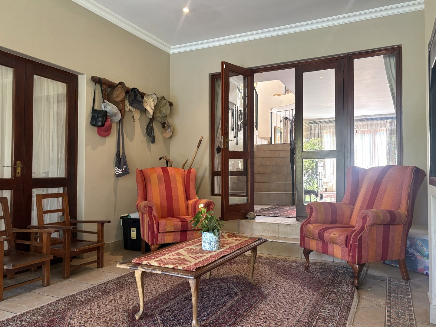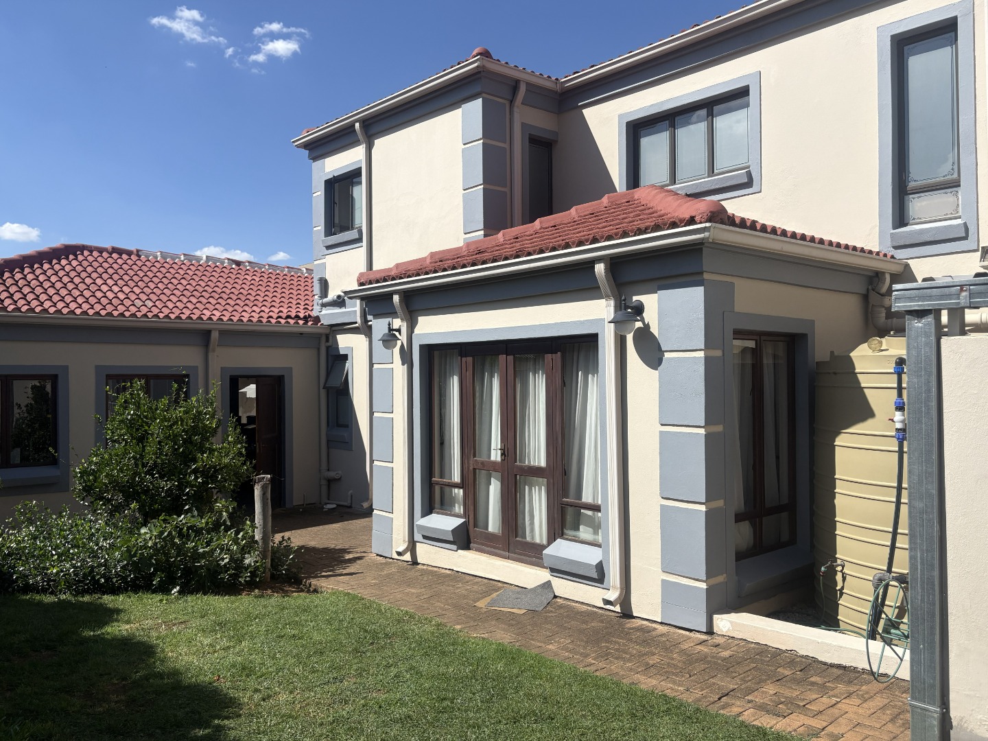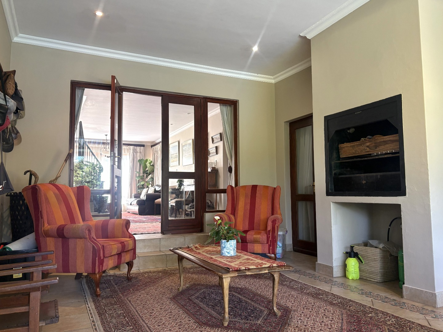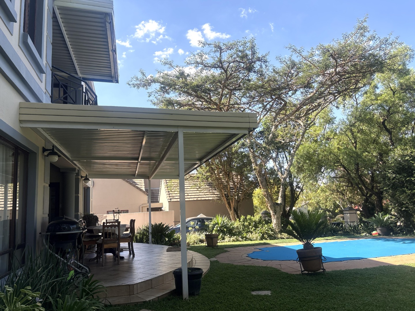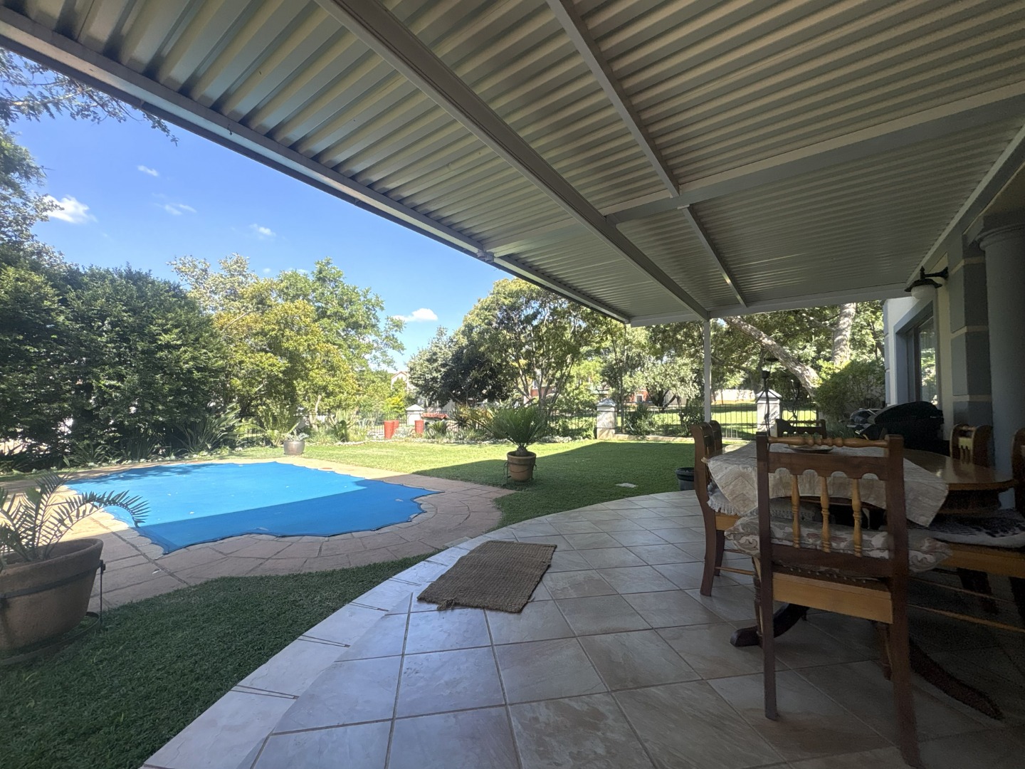 The outdoor space is designed for relaxed entertaining and memorable family gatherings. A lush garden surrounds the sparkling pool, perfectly positioned near the enclosed patio, ideal for summer afternoons, and weekend braais.