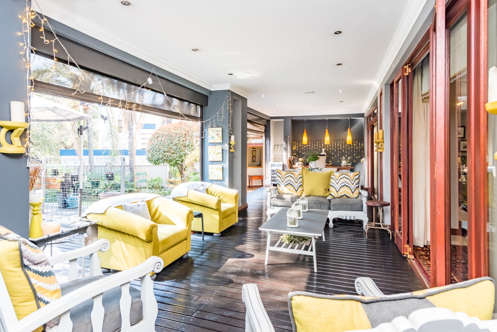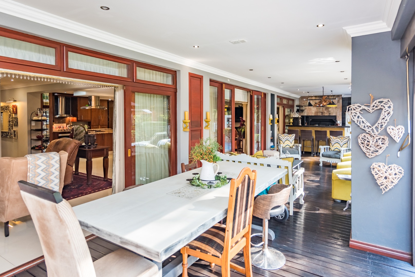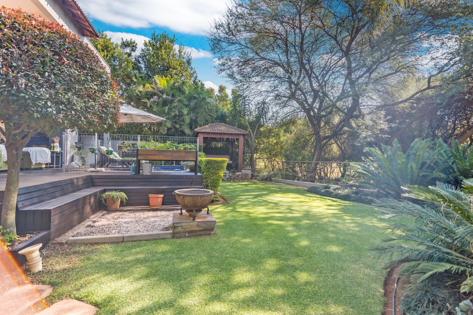 Entertain year round under the covered patio with roller blinds, a built-in bar, and braai area overlooking the deck, pool, and boma, all surrounded by lush greenery and a peaceful garden. A separate guest suite with private access adds flexibility for family or guests.