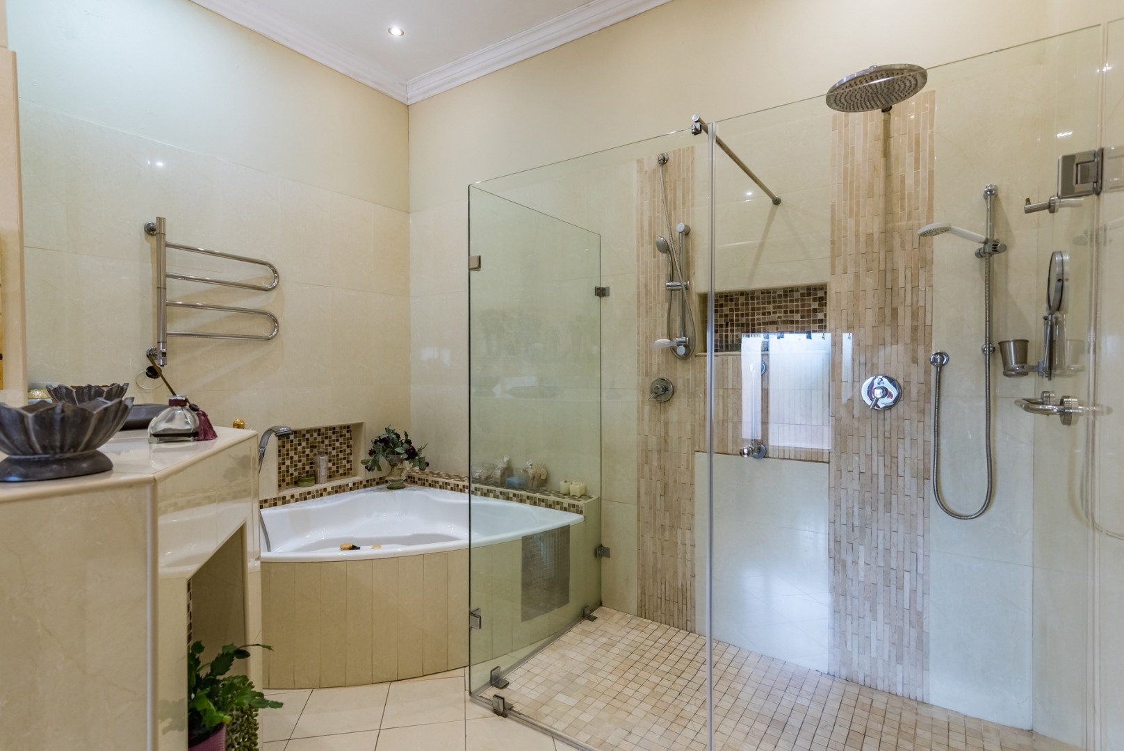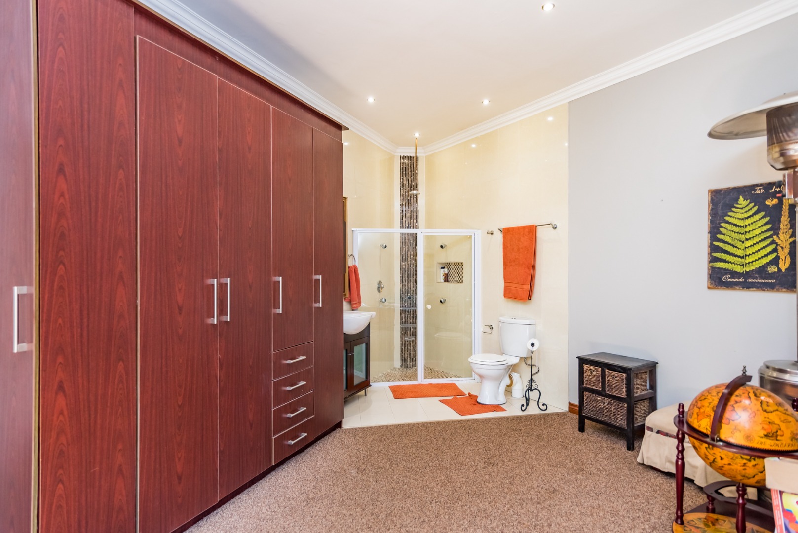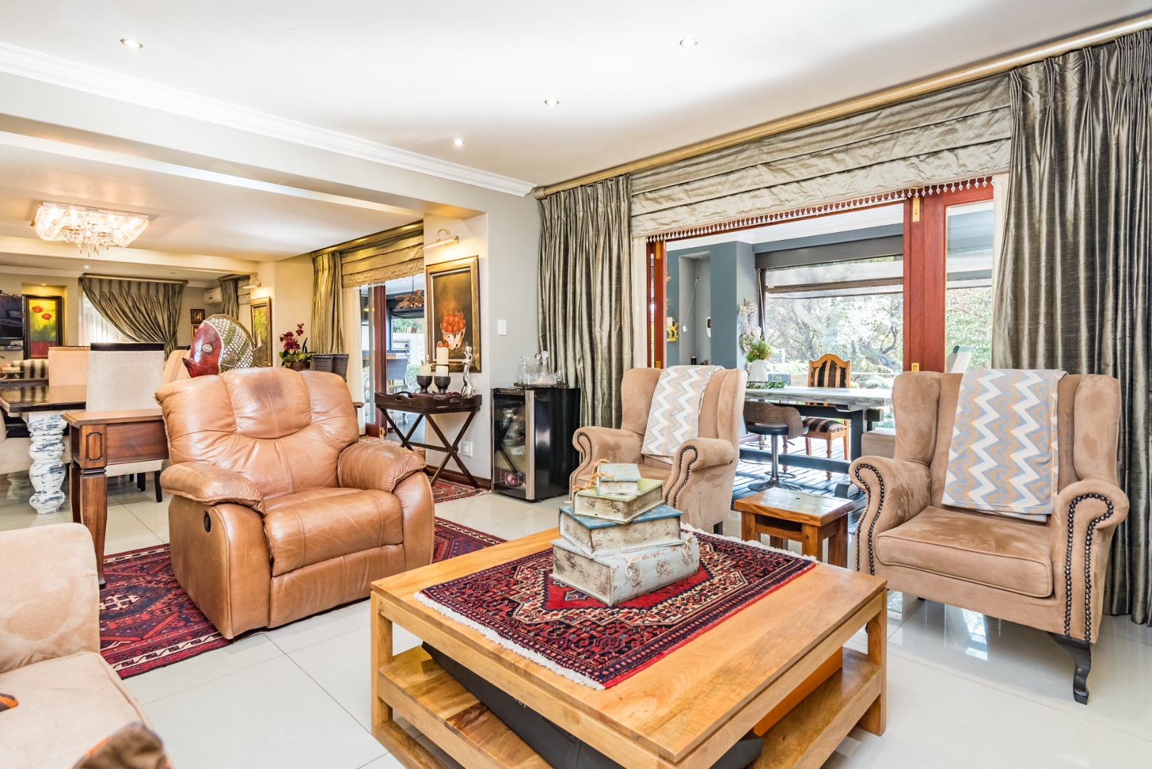 Entertain year round under the covered patio with roller blinds, a built-in bar, and braai area overlooking the deck, pool, and boma, all surrounded by lush greenery and a peaceful garden. A separate guest suite with private access adds flexibility for family or guests.