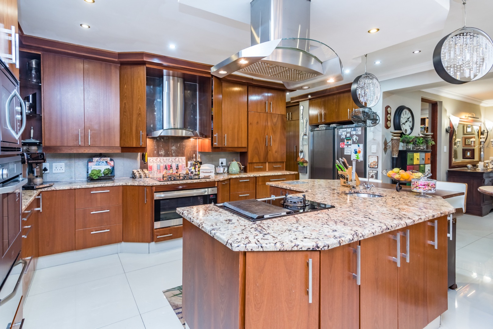 The chef’s kitchen is a showstopper, featuring custom lighting, dual ovens, a gas stove, a warming tray, and an island with an integrated grill. The adjoining scullery and laundry offer ample storage and practicality for everyday living.