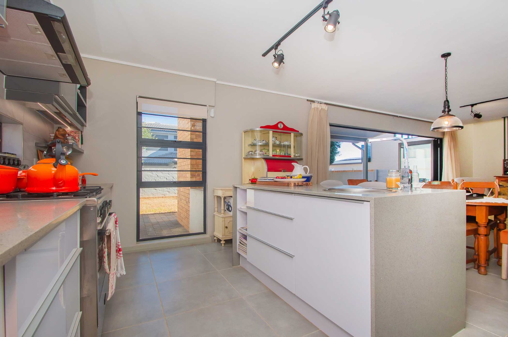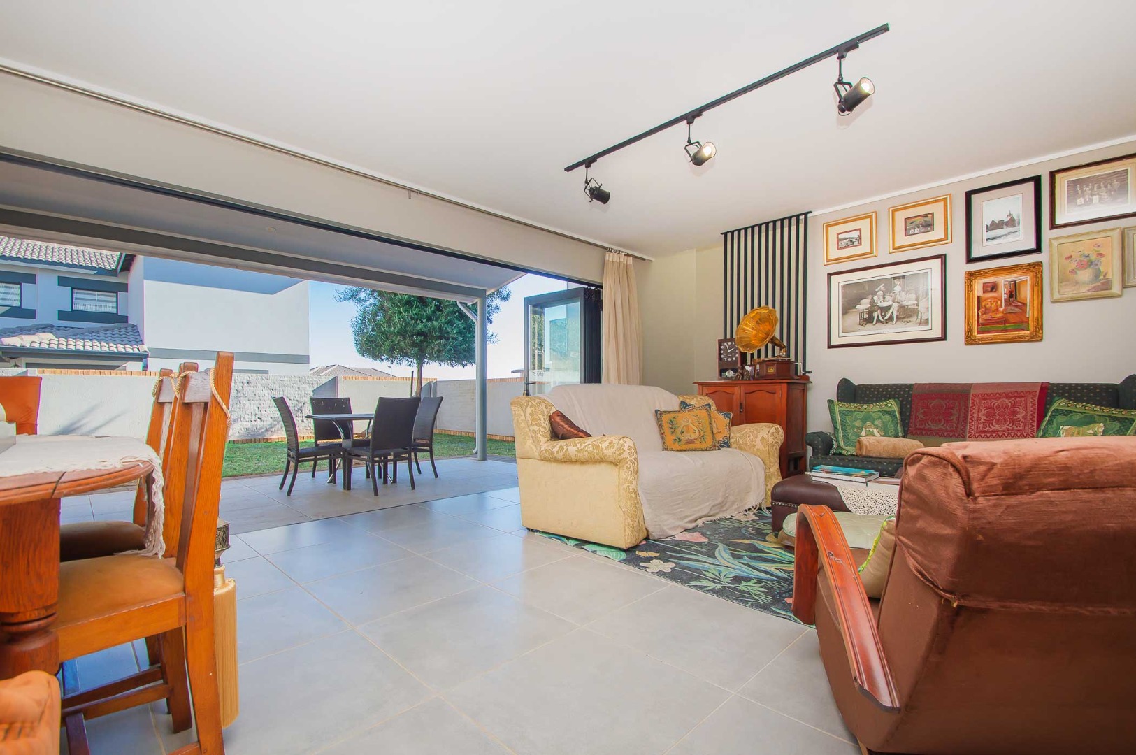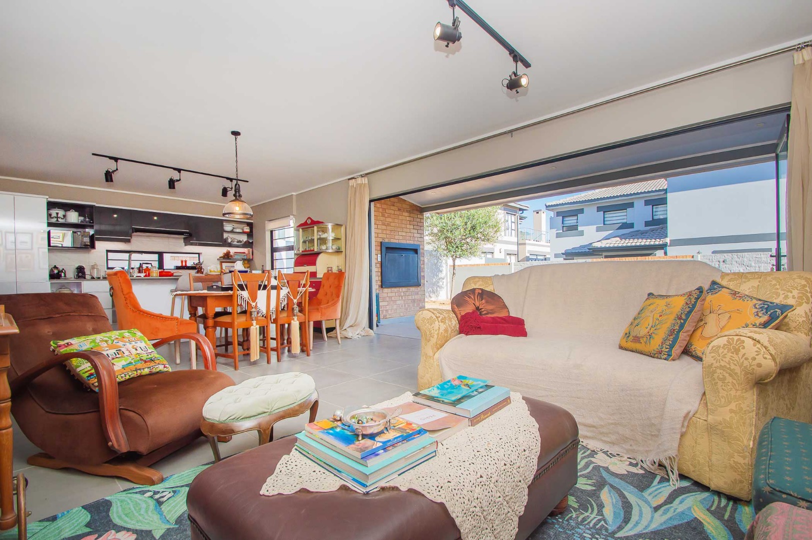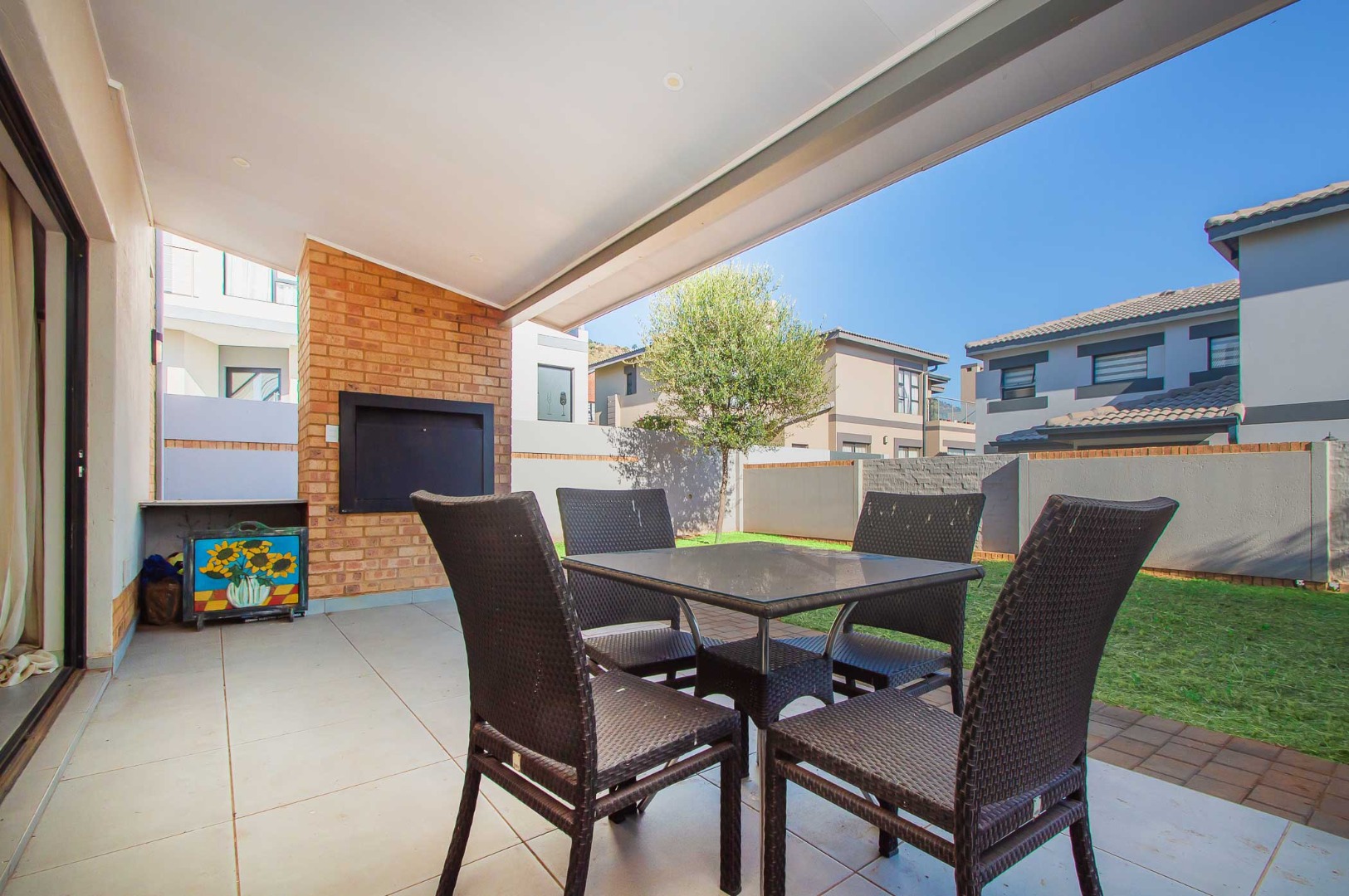 The spacious main bedroom boasts an open-plan en-suite bathroom, creating a luxurious and airy feel. Stacking doors open out onto a covered patio with a built-in braai, overlooking a pet-friendly garden—ideal for relaxed weekends or hosting friends and family.