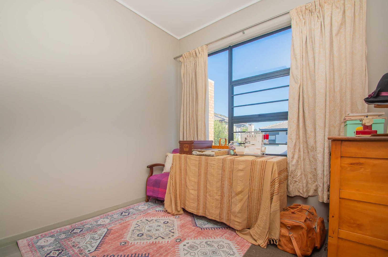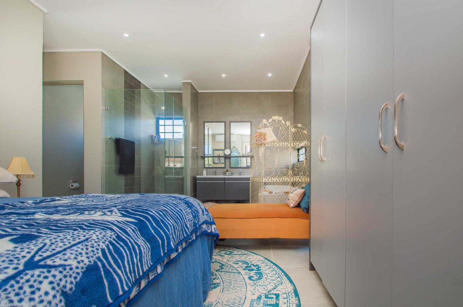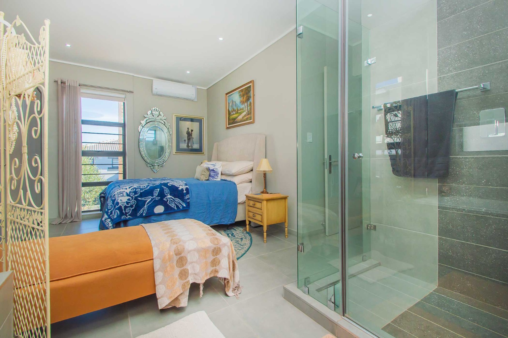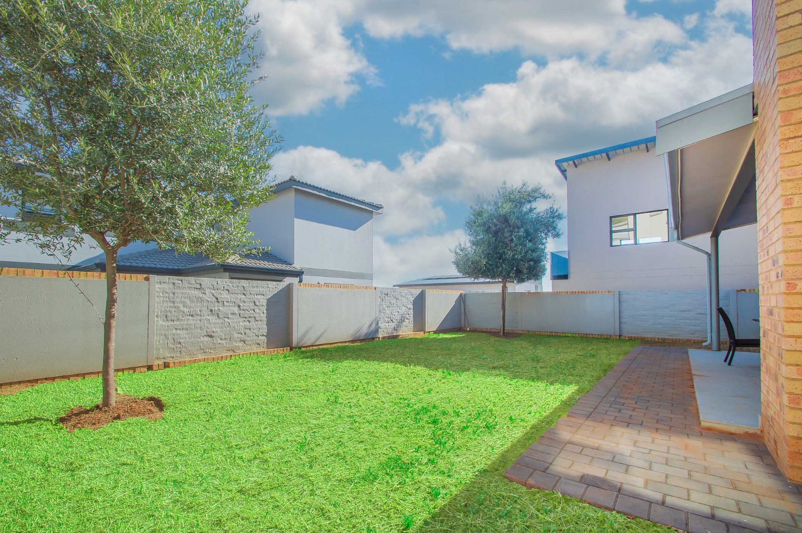 The spacious main bedroom boasts an open-plan en-suite bathroom, creating a luxurious and airy feel. Stacking doors open out onto a covered patio with a built-in braai, overlooking a pet-friendly garden—ideal for relaxed weekends or hosting friends and family.