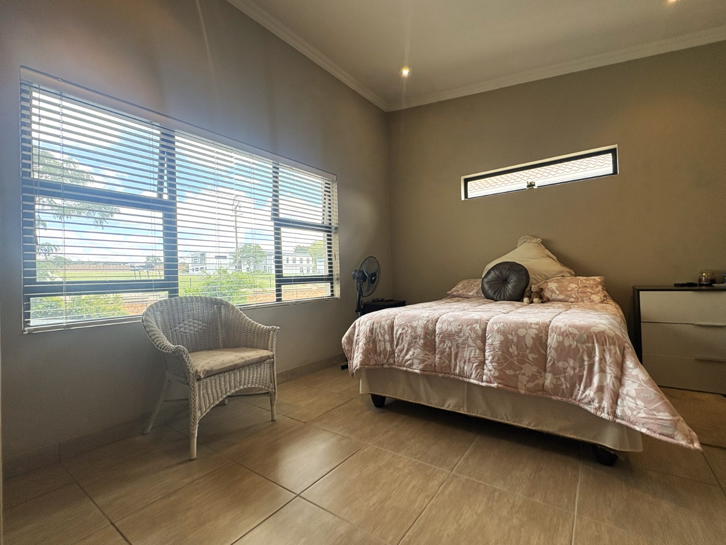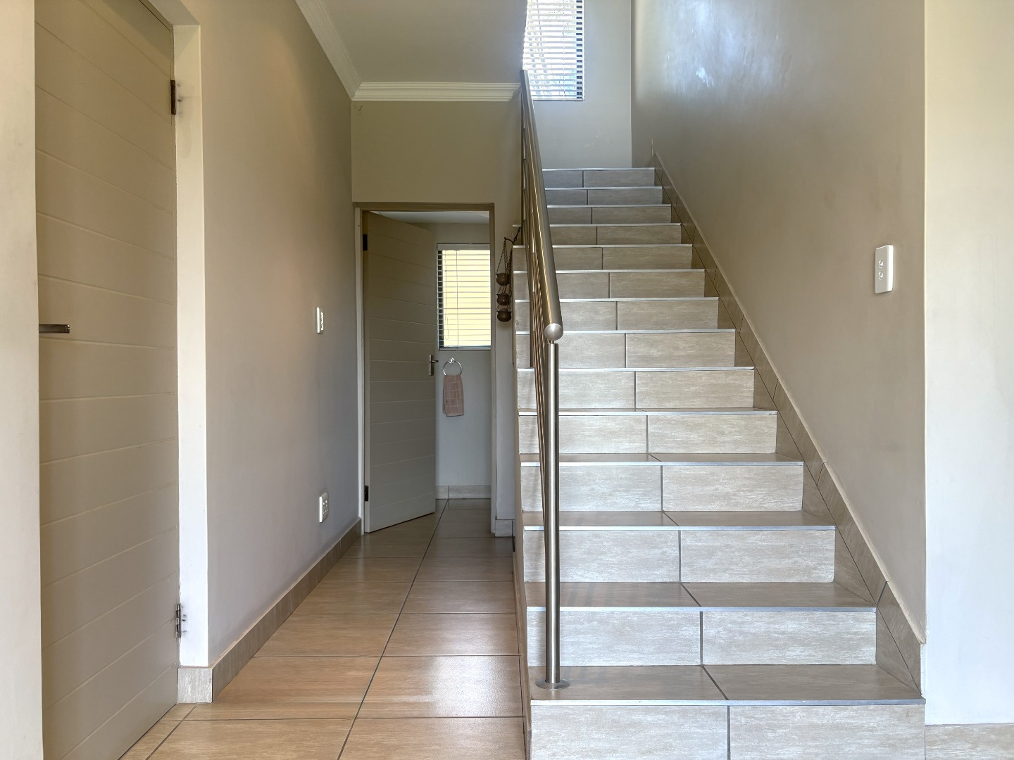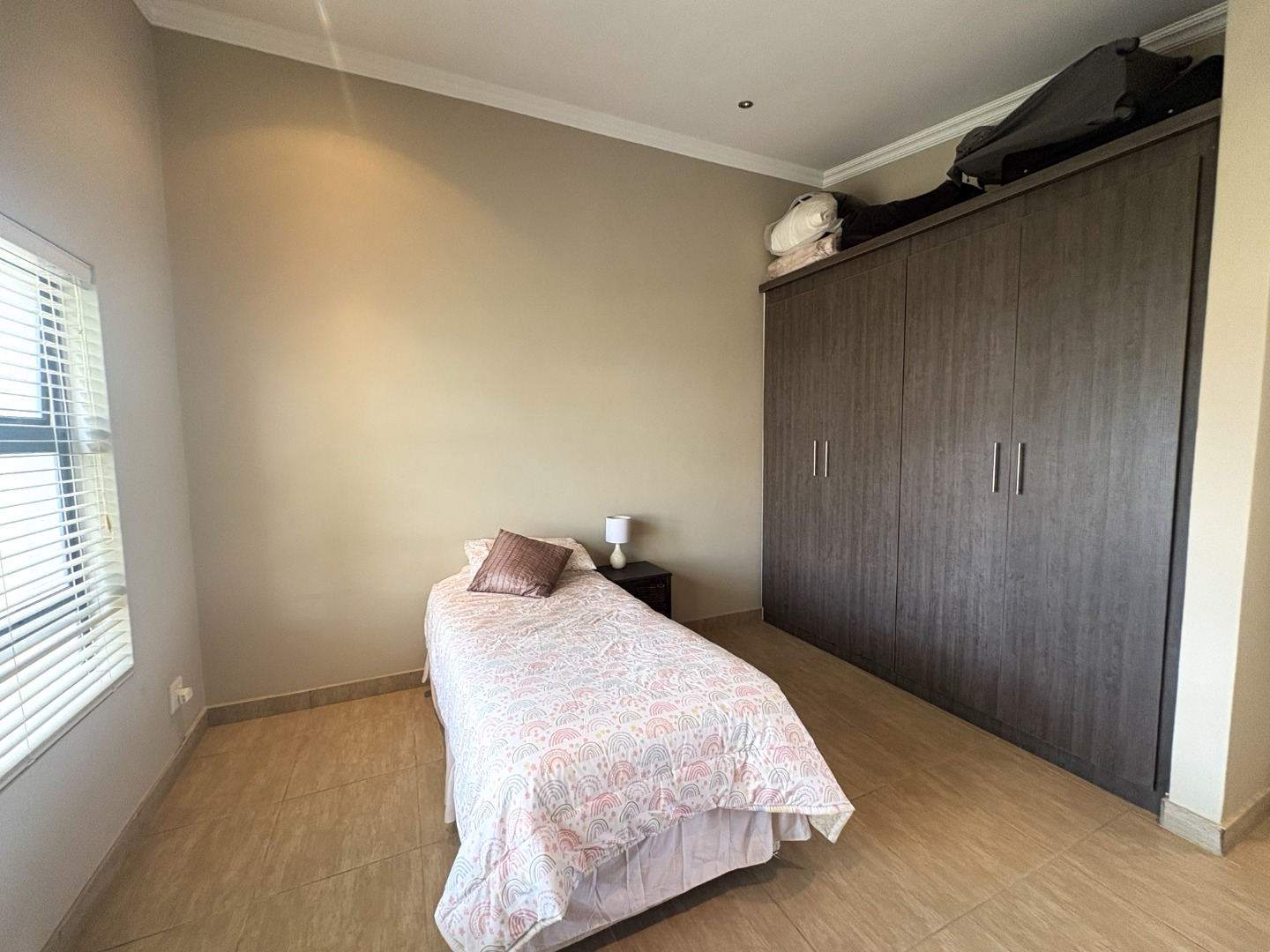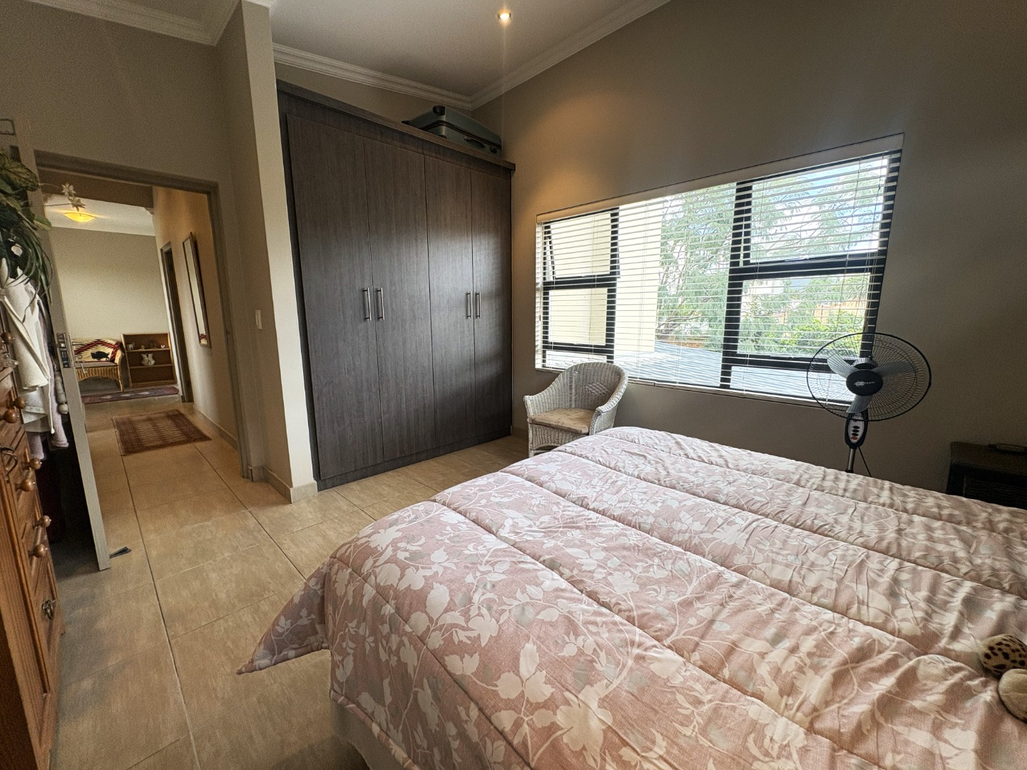 Upstairs, the spacious main bedroom serves as a private retreat, featuring generous cupboard space, a full en-suite bathroom with both bath and shower, and a balcony that invites in fresh air and natural light. Down the passage, the two additional bedrooms are thoughtfully positioned on either side of the full guest bathroom, also fitted with a bath and shower.