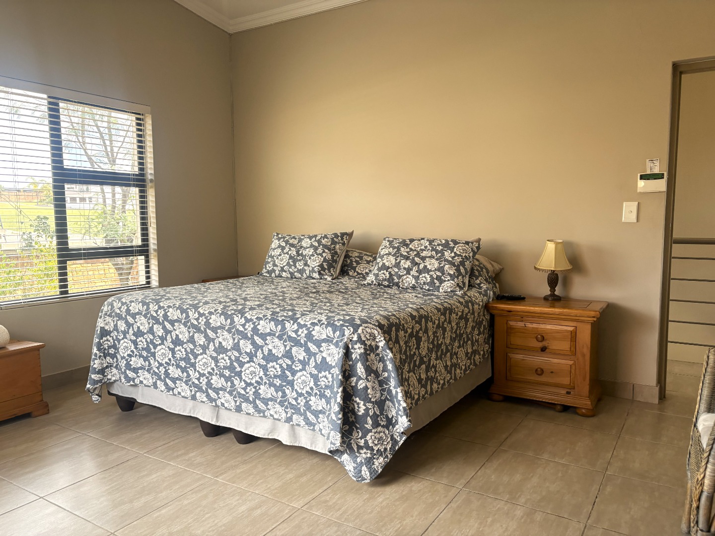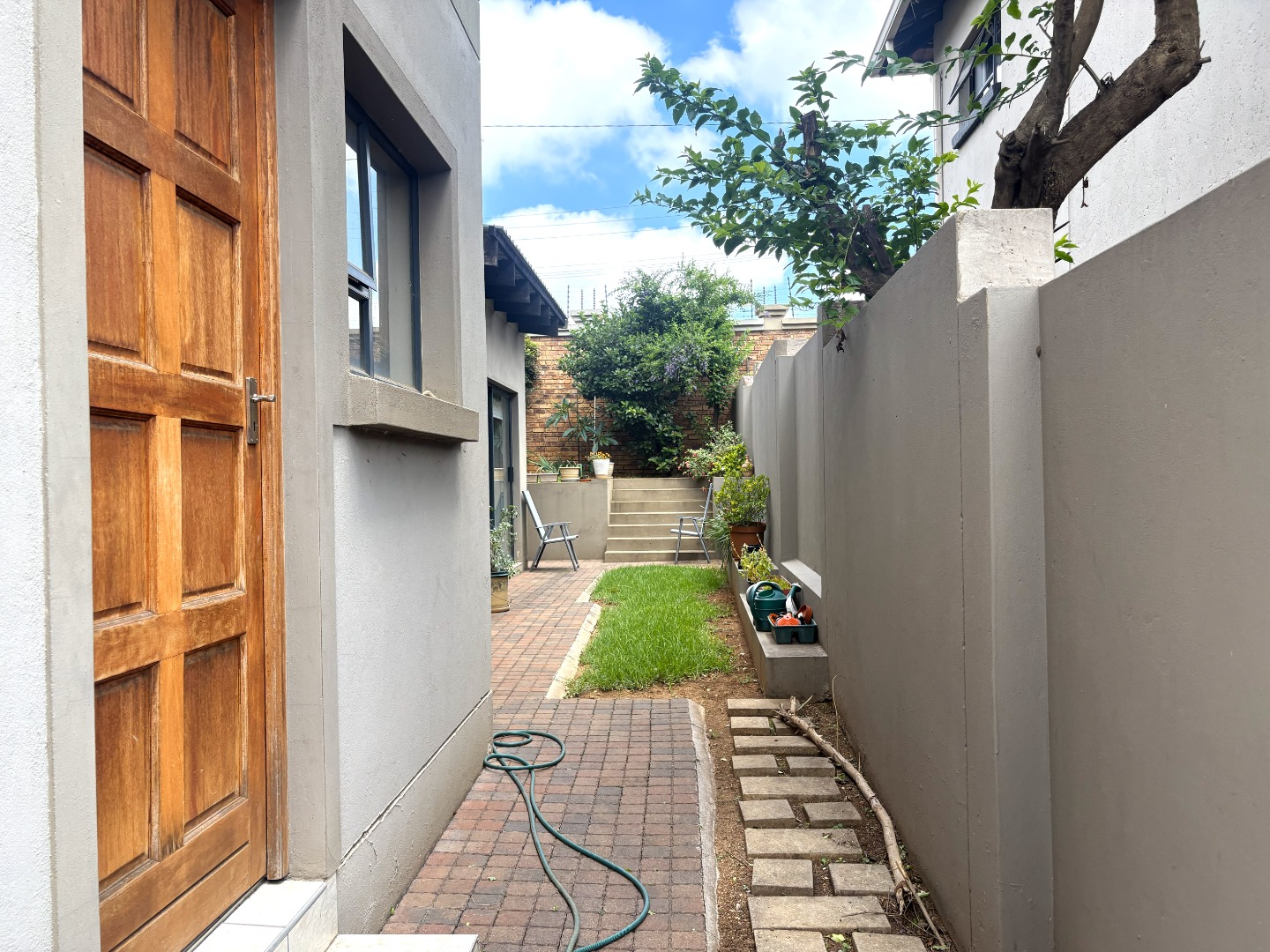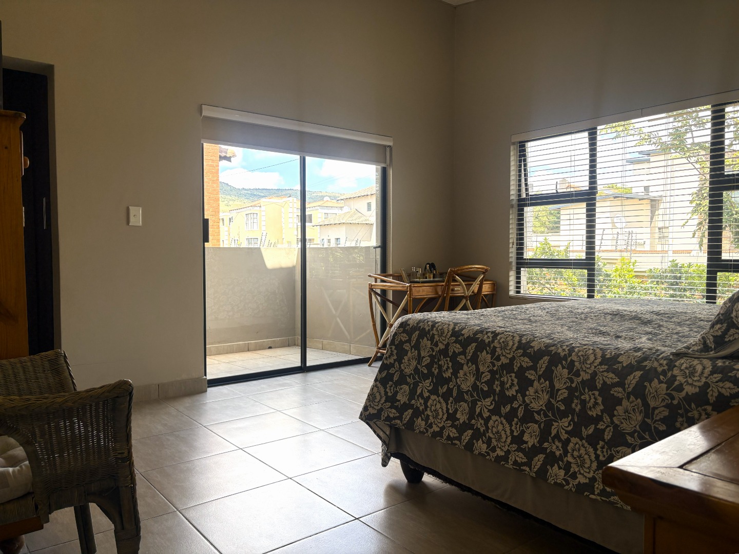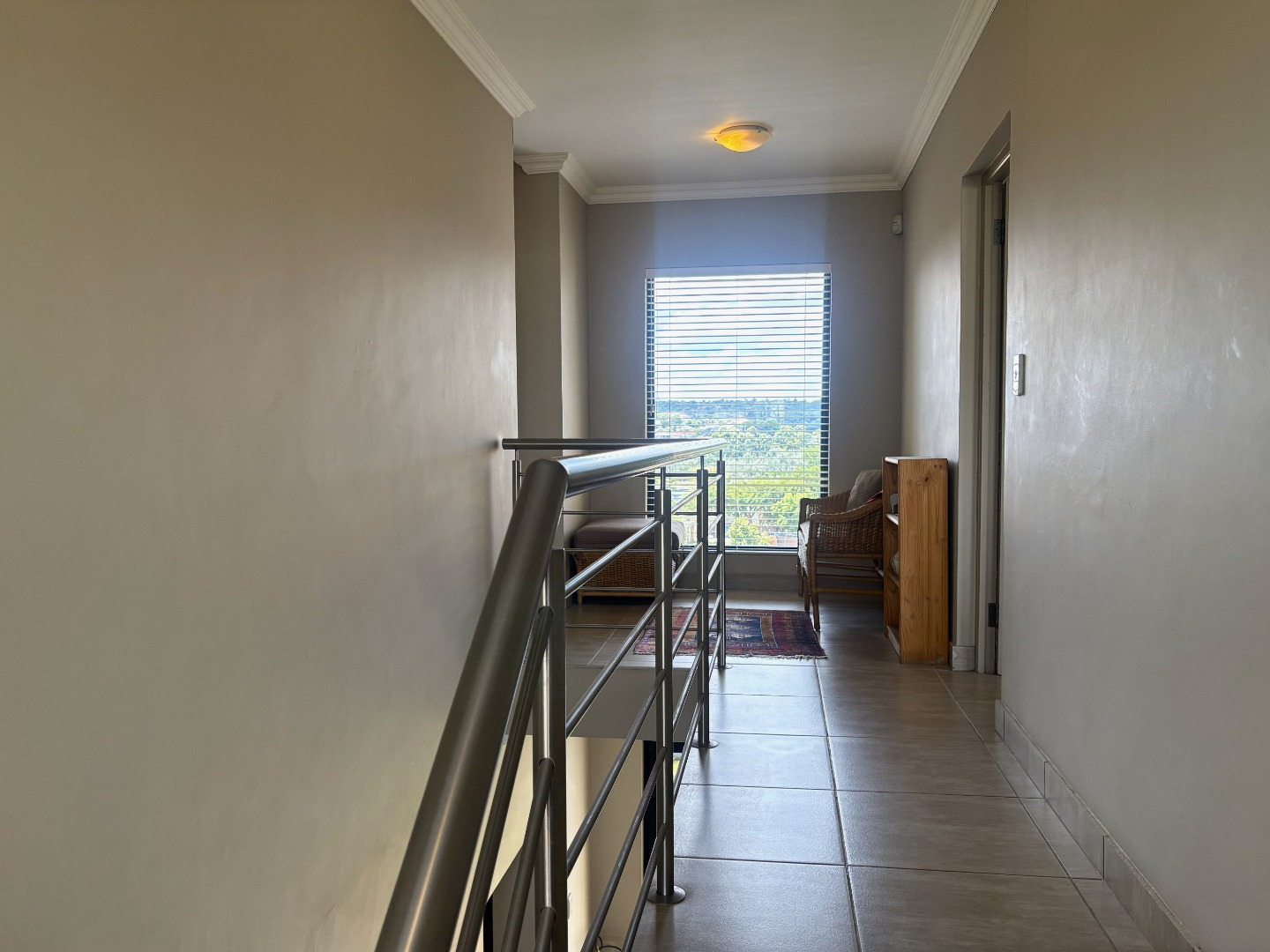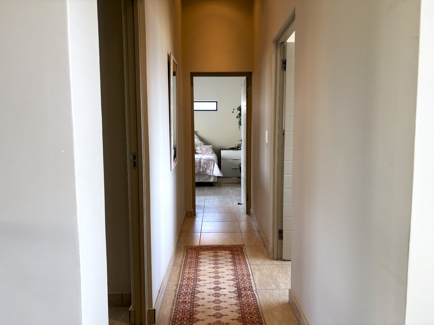 Upstairs, the spacious main bedroom serves as a private retreat, featuring generous cupboard space, a full en-suite bathroom with both bath and shower, and a balcony that invites in fresh air and natural light. Down the passage, the two additional bedrooms are thoughtfully positioned on either side of the full guest bathroom, also fitted with a bath and shower.