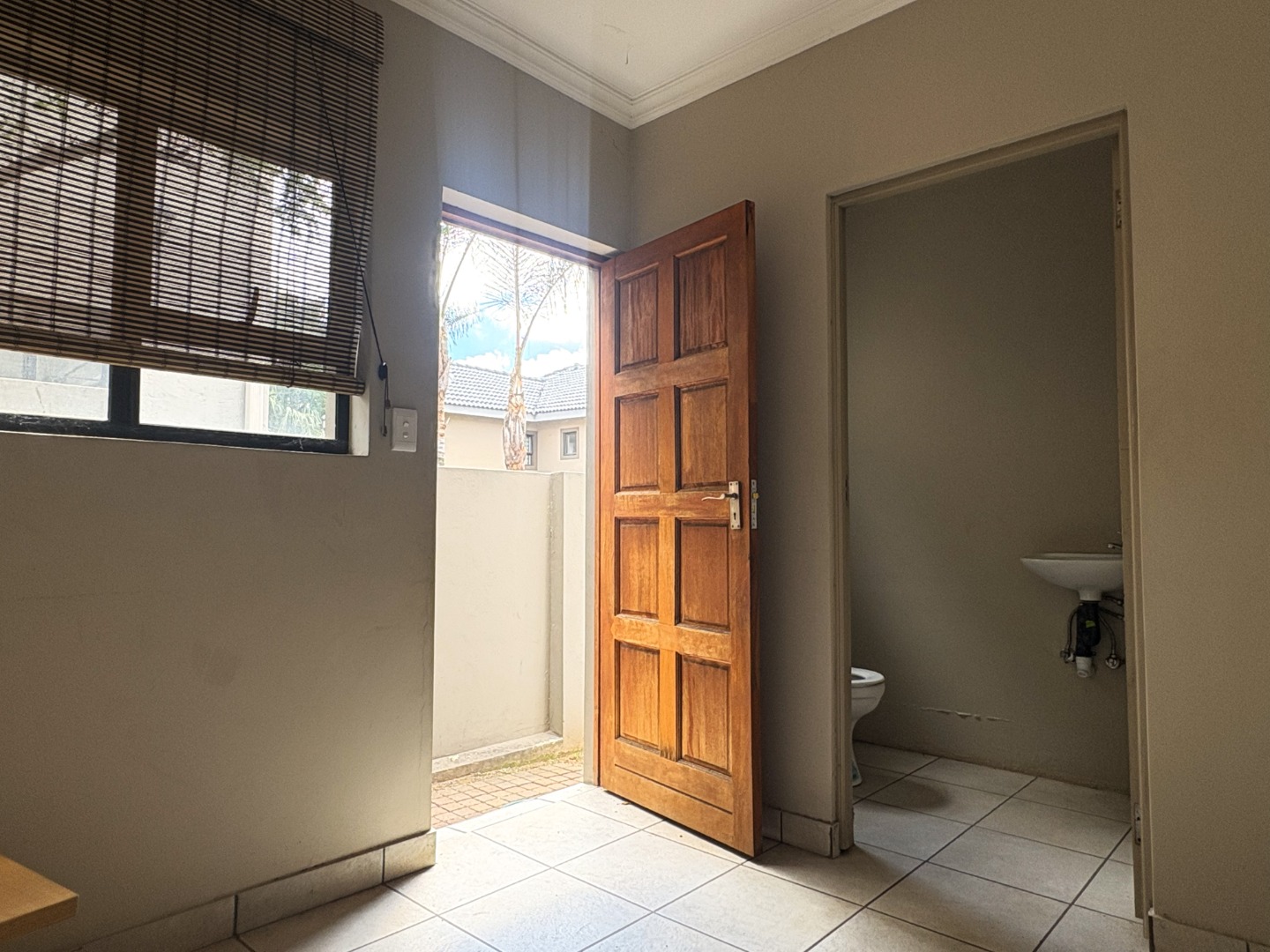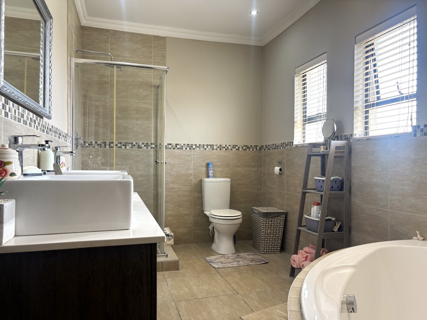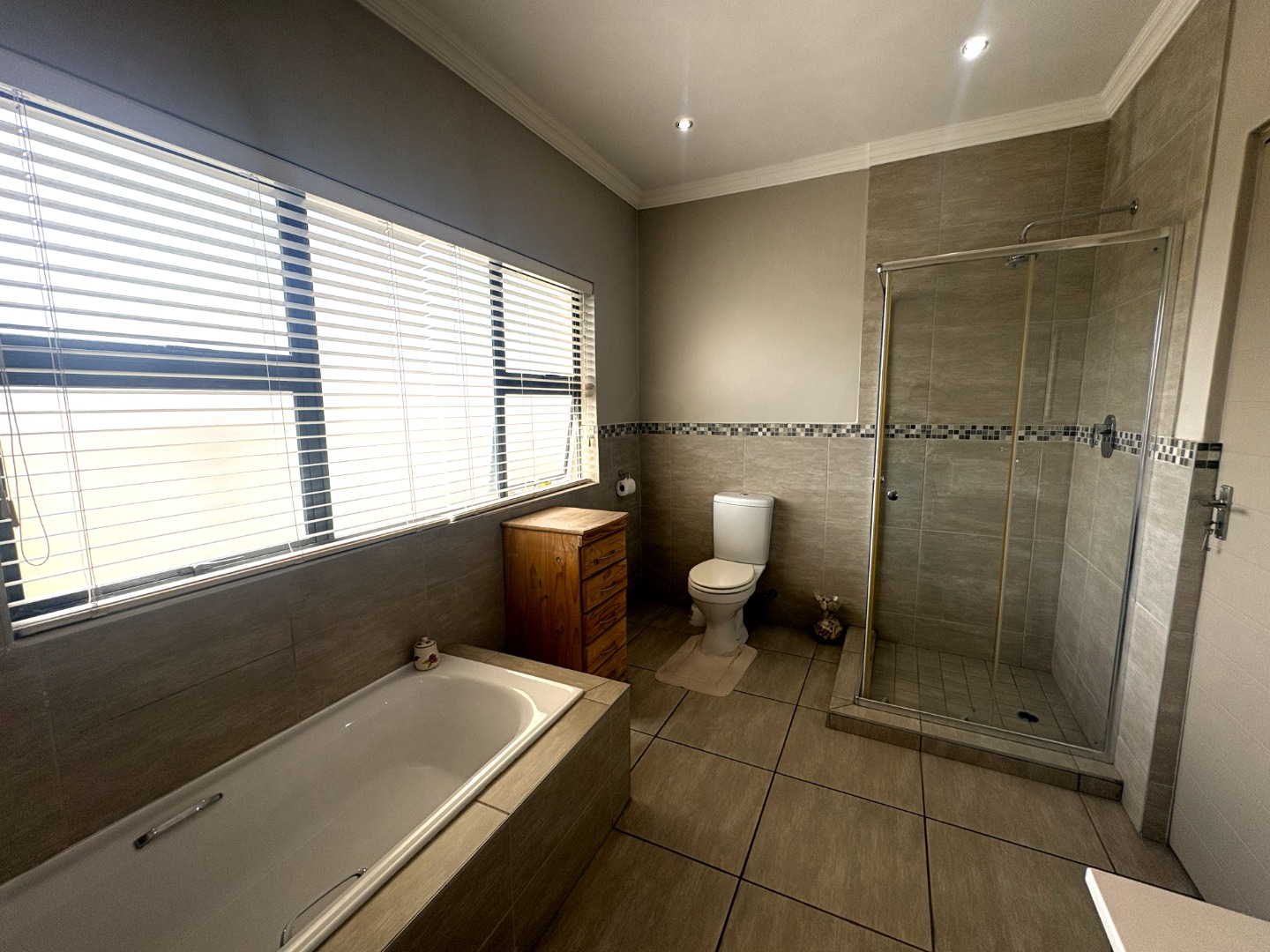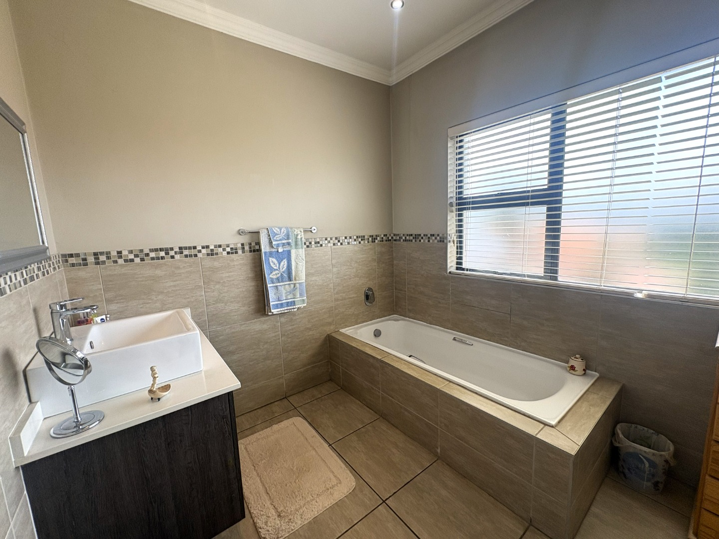 Upstairs, the spacious main bedroom serves as a private retreat, featuring generous cupboard space, a full en-suite bathroom with both bath and shower, and a balcony that invites in fresh air and natural light. Down the passage, the two additional bedrooms are thoughtfully positioned on either side of the full guest bathroom, also fitted with a bath and shower.
