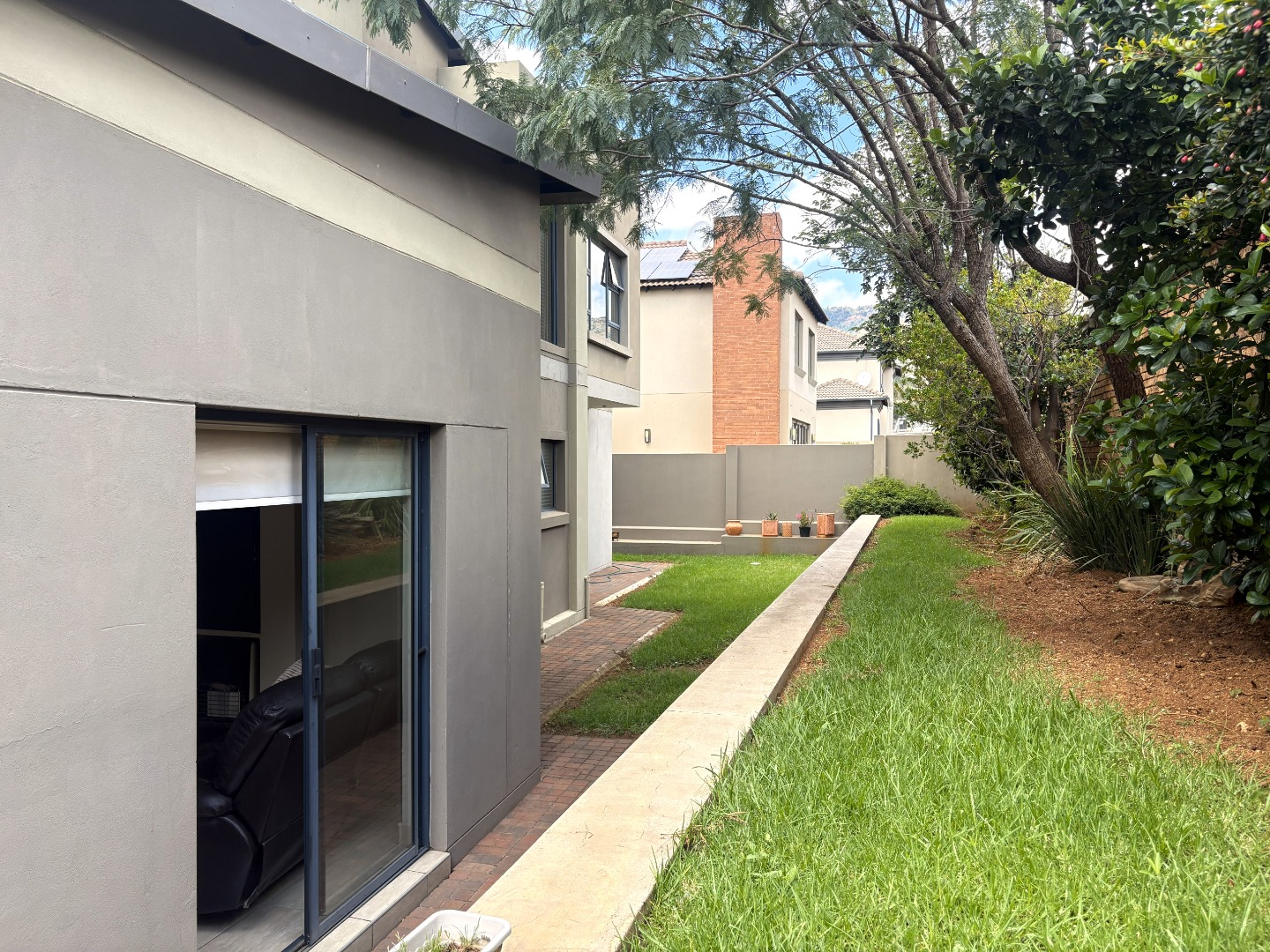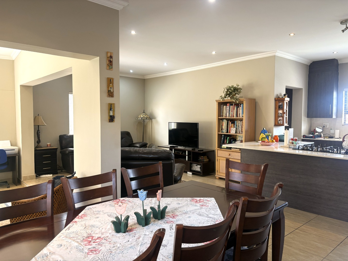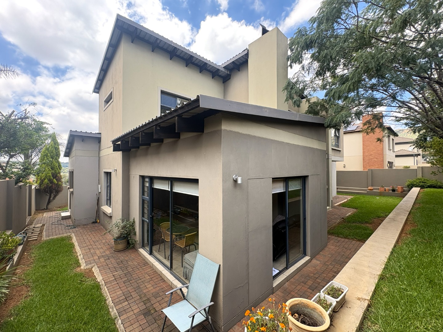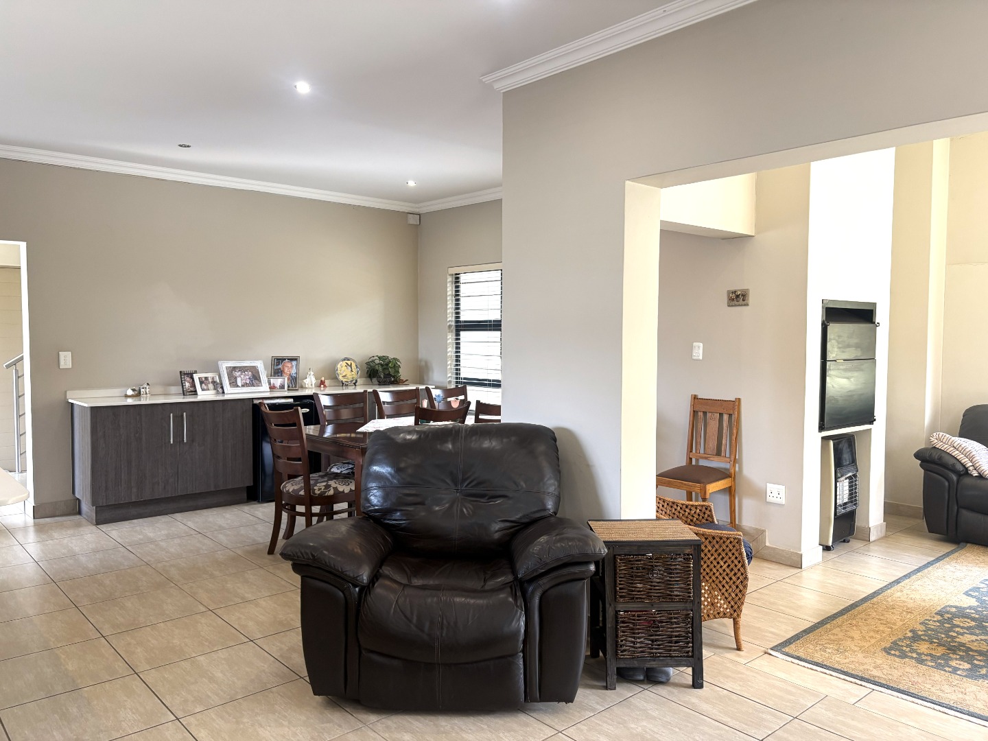From the moment you step inside, you are welcomed by a light-filled, contemporary open-plan layout. The kitchen, dining area, TV lounge, and braai room flow seamlessly together on the ground floor, creating an inviting space ideal for hosting family gatherings or relaxed evenings with friends. A conveniently positioned guest bathroom completes the lower level.
