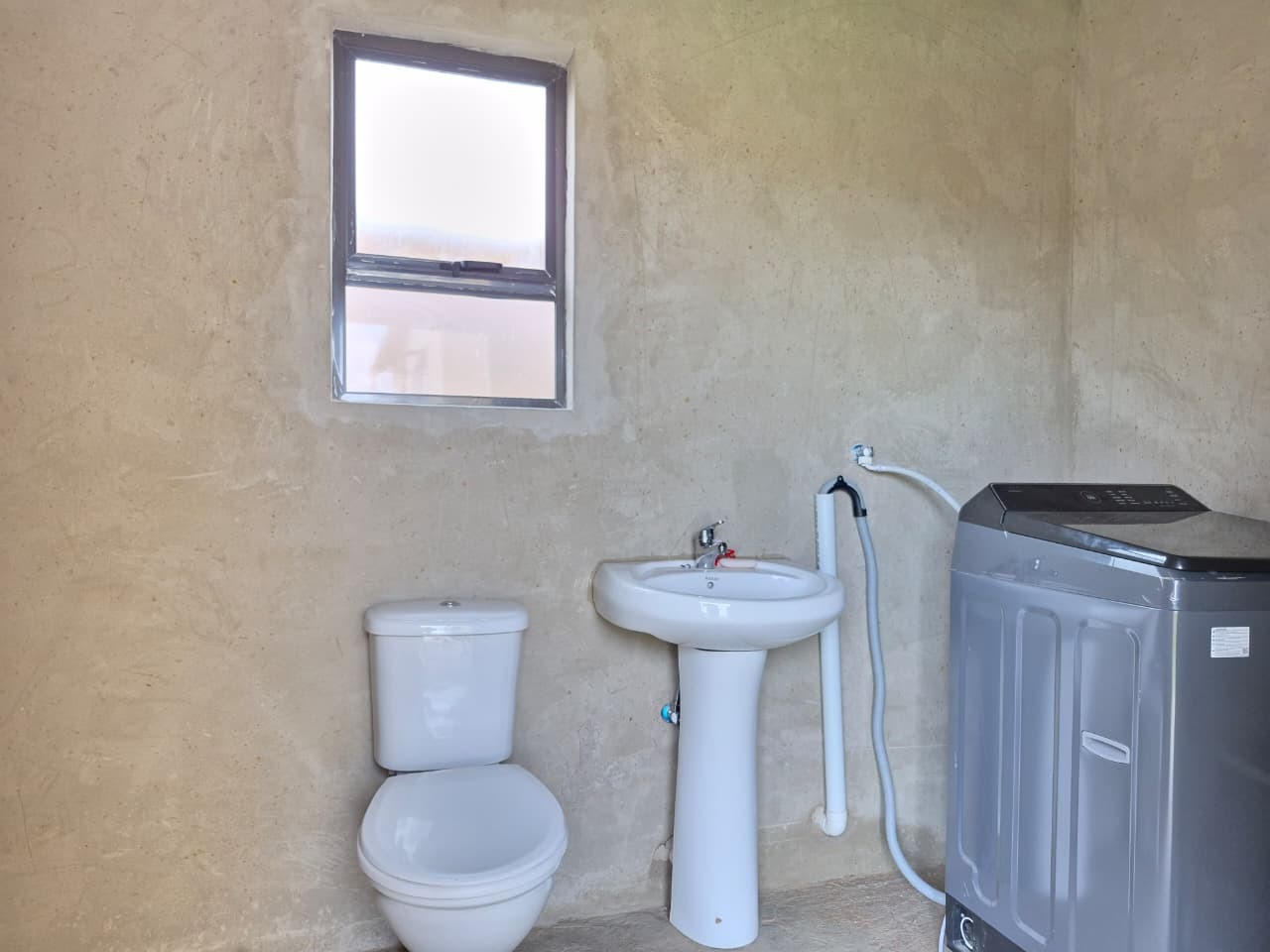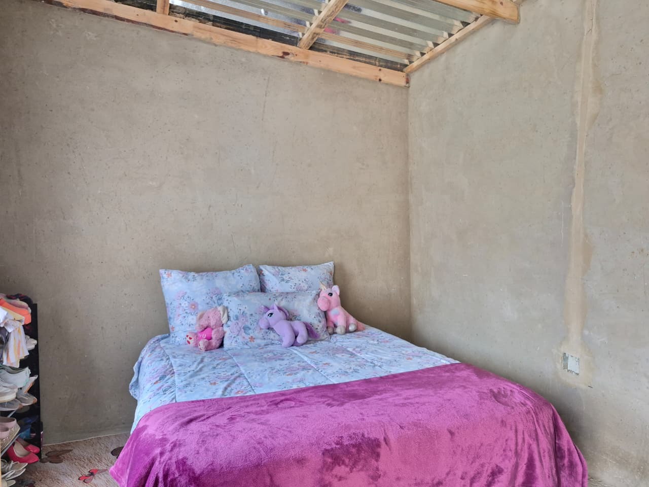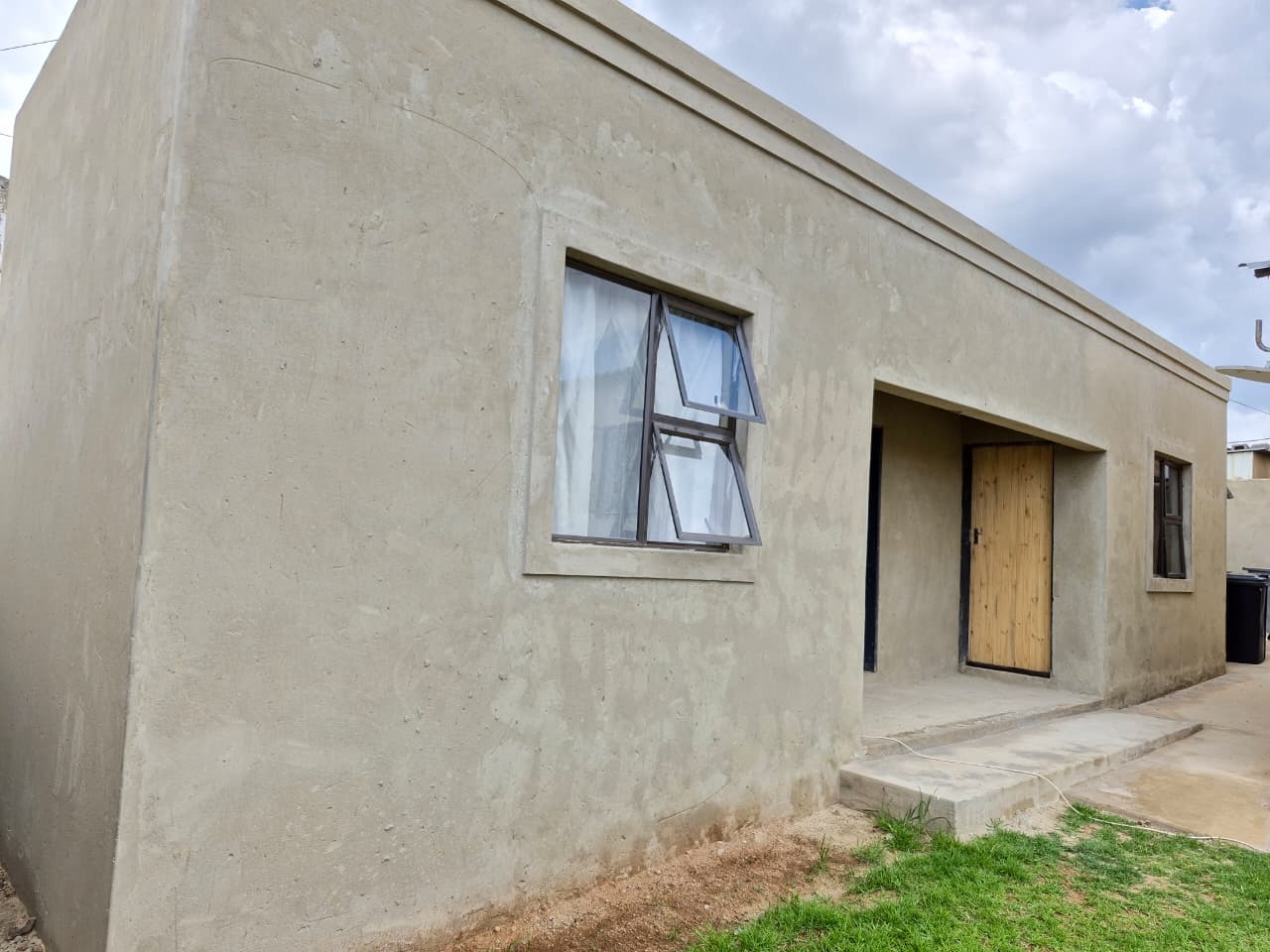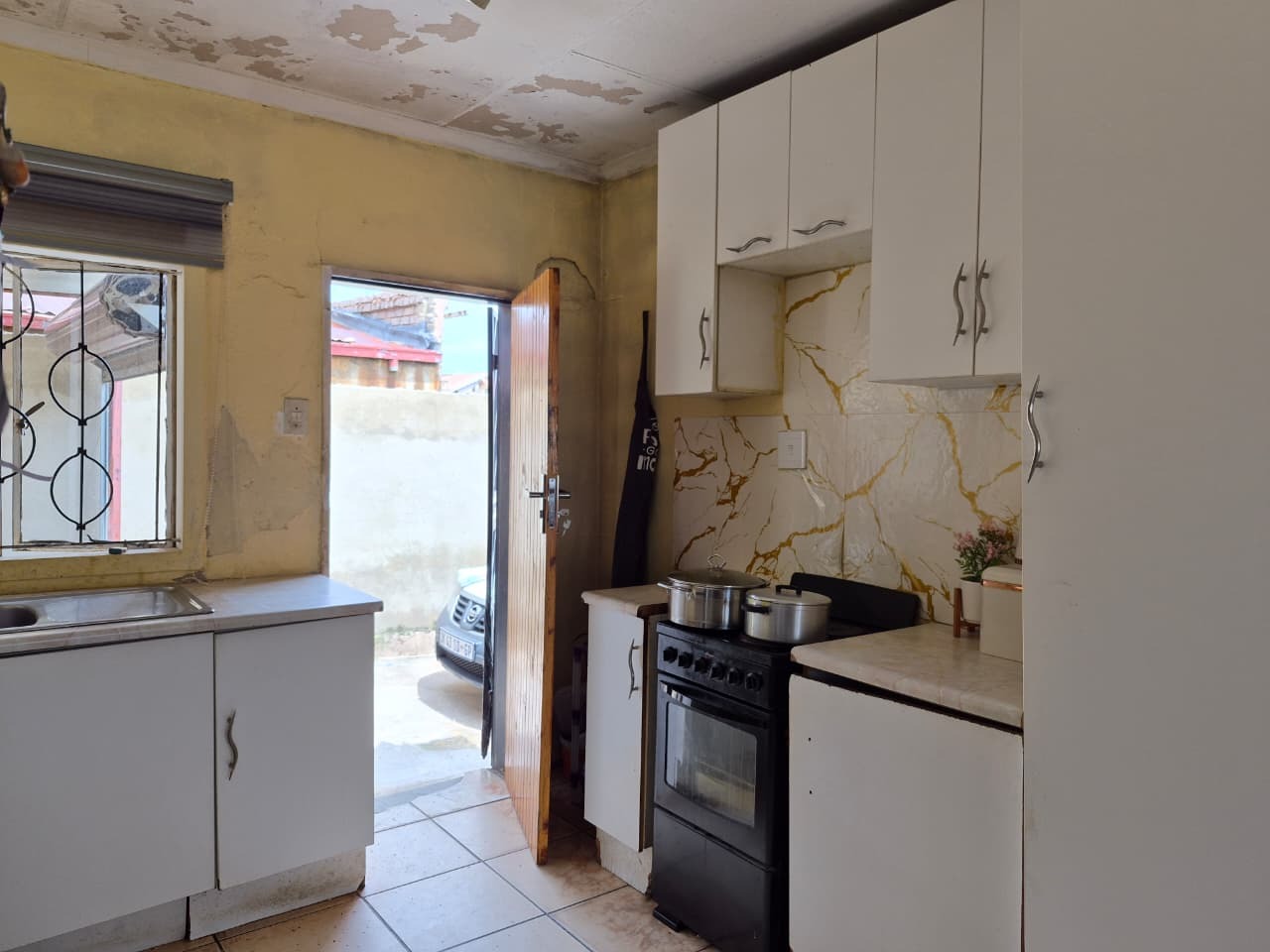 The interior of the home presents an open-plan lounge and kitchen area, designed for functional living. The kitchen is equipped with built-in cupboards, a sink, and space for essential appliances, featuring tiled flooring throughout. While some areas show signs of wear and may benefit from renovation, the foundation provides a canvas for personalization. The property includes two comfortable bedrooms and one bathroom, along with a guest toilet and an additional outside toilet for convenience.
