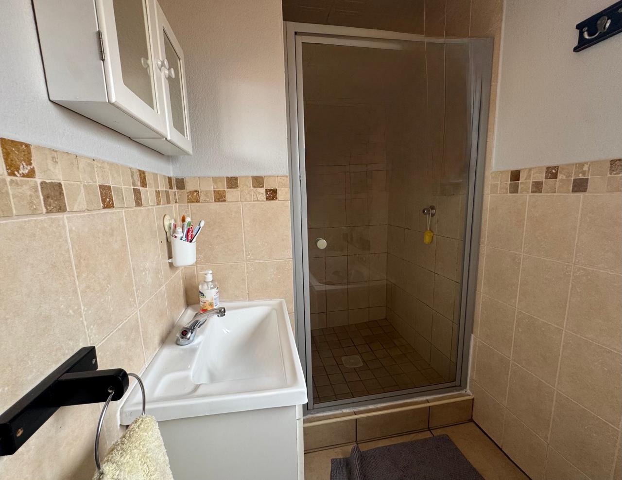 Accommodation comprises three bedrooms, including one en-suite bathroom, ensuring privacy and convenience. The bedrooms benefit from natural light and feature built-in wooden wardrobes, providing practical storage solutions. The bathrooms are tiled, with one offering a compact, functional wet-room style shower stall that includes a toilet, and the other featuring an enclosed shower with a glass door.