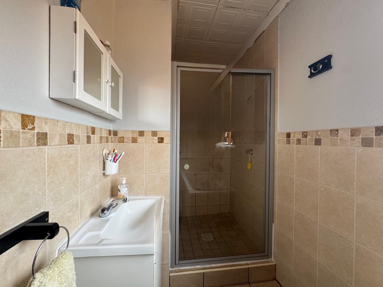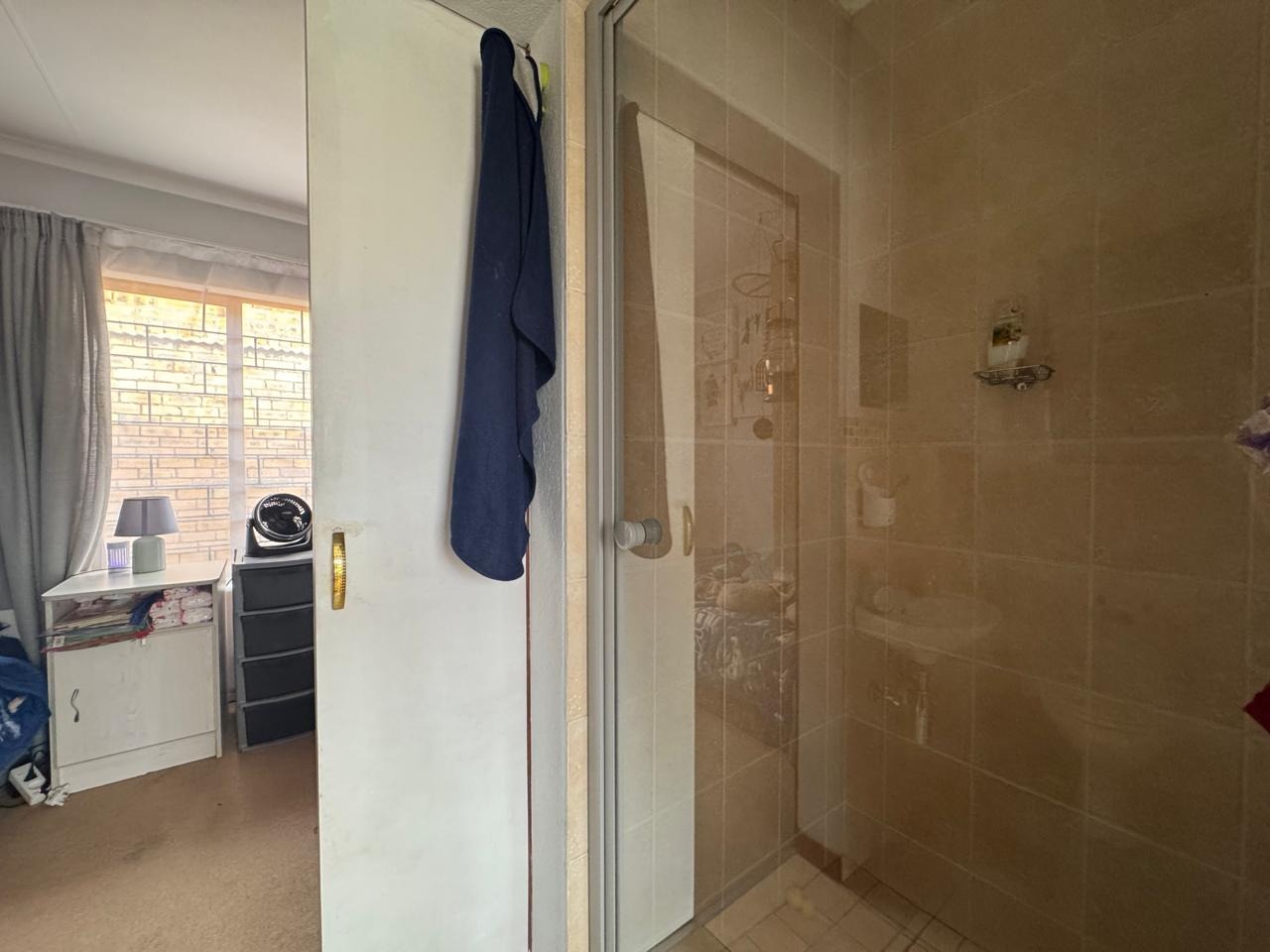 Accommodation comprises three bedrooms, including one en-suite bathroom, ensuring privacy and convenience. The bedrooms benefit from natural light and feature built-in wooden wardrobes, providing practical storage solutions. The bathrooms are tiled, with one offering a compact, functional wet-room style shower stall that includes a toilet, and the other featuring an enclosed shower with a glass door.