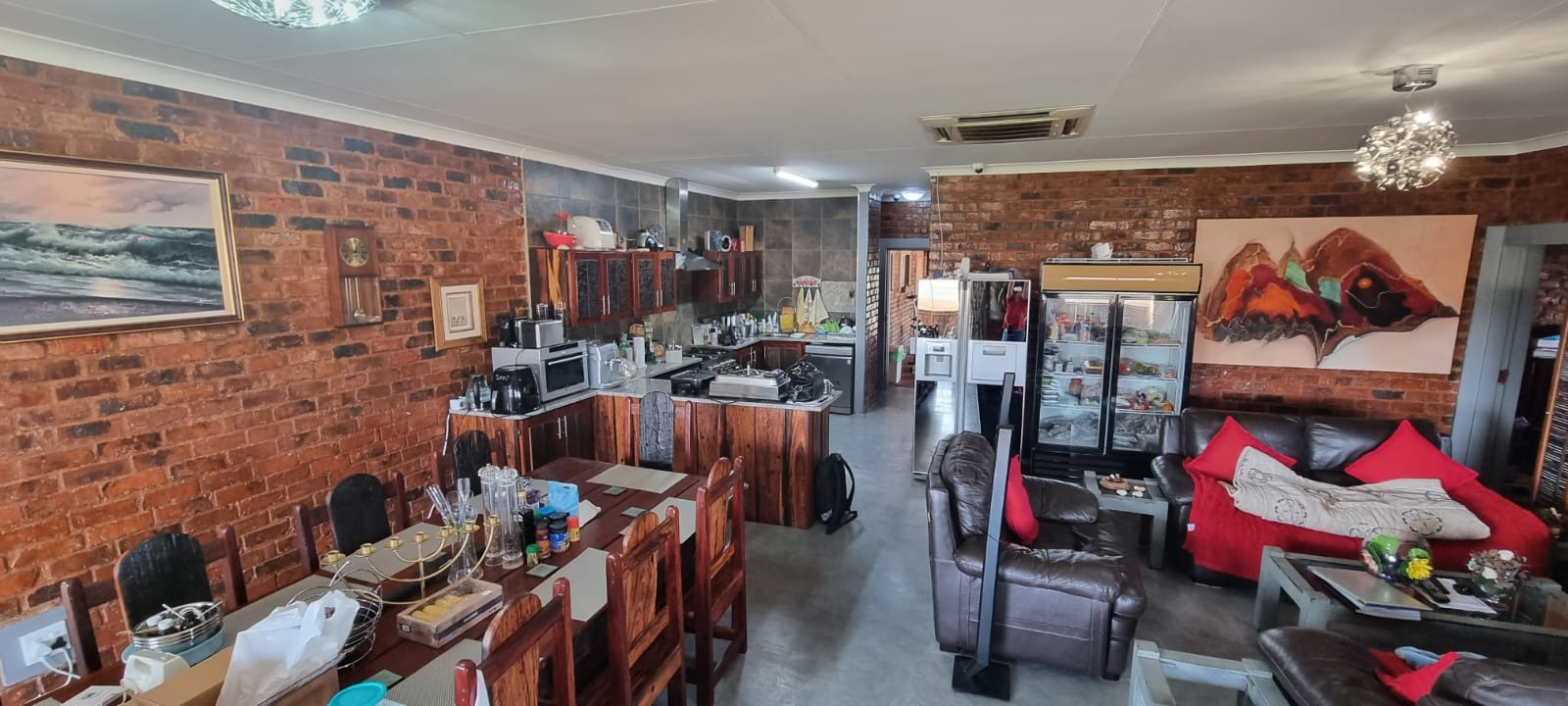 • Open-plan kitchen, dining, lounge & TV room with air-conditioning, sleeper wood cupboards, and gas stove.