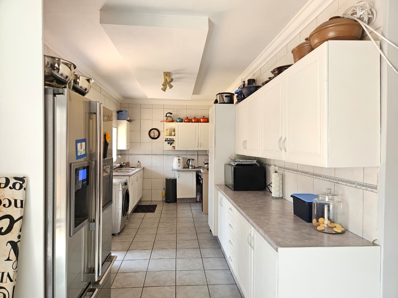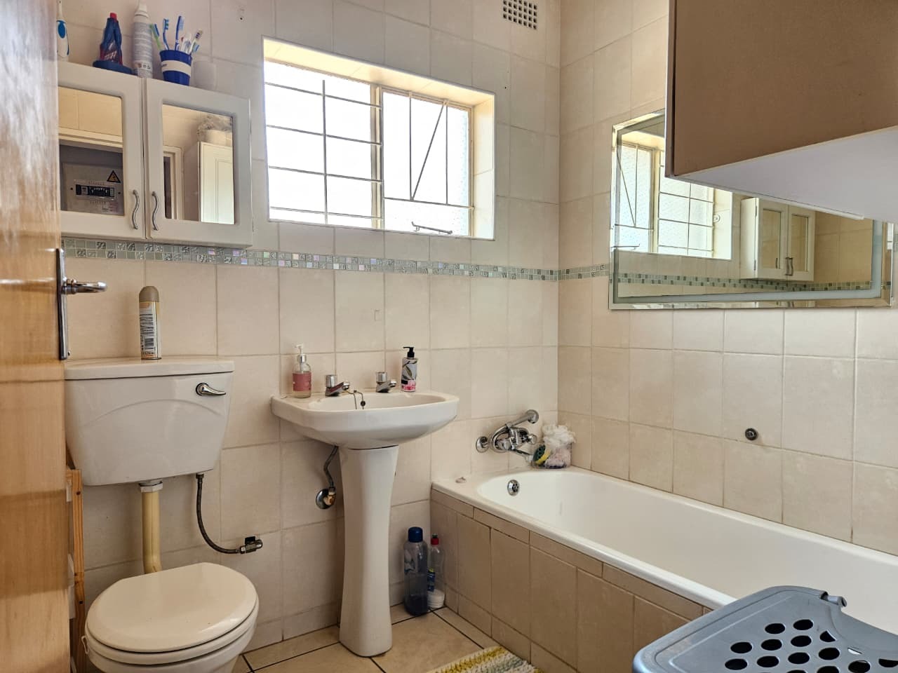 Accommodation comprises three spacious bedrooms, with the main bedroom offering the convenience of an en-suite bathroom, complemented by a second bathroom. Each bedroom is designed for comfort, featuring practical built-in cupboards for extensive storage and tiled floors last bedroom receives good natural light, creating a versatile personal space with traditional wood finishes.