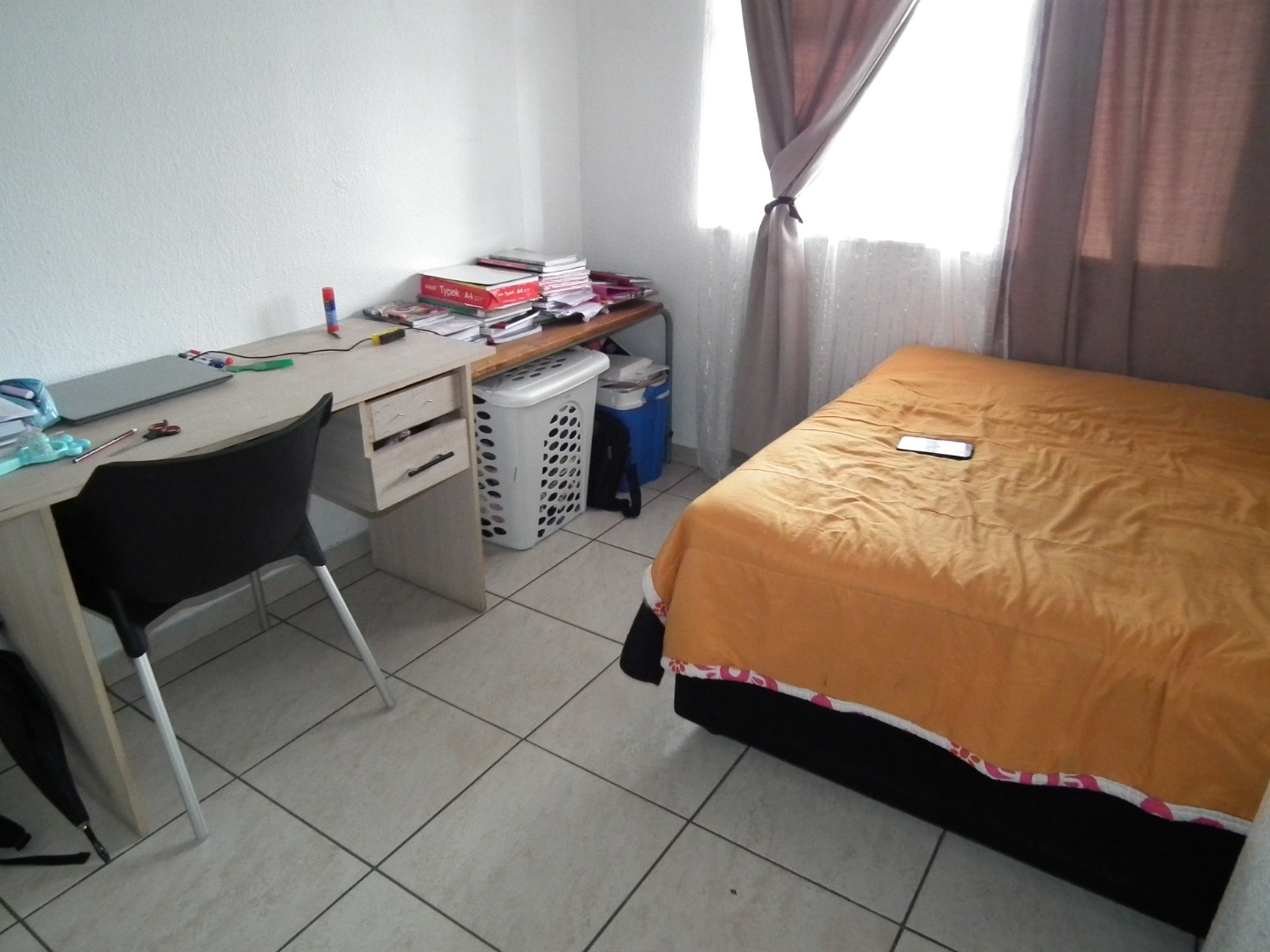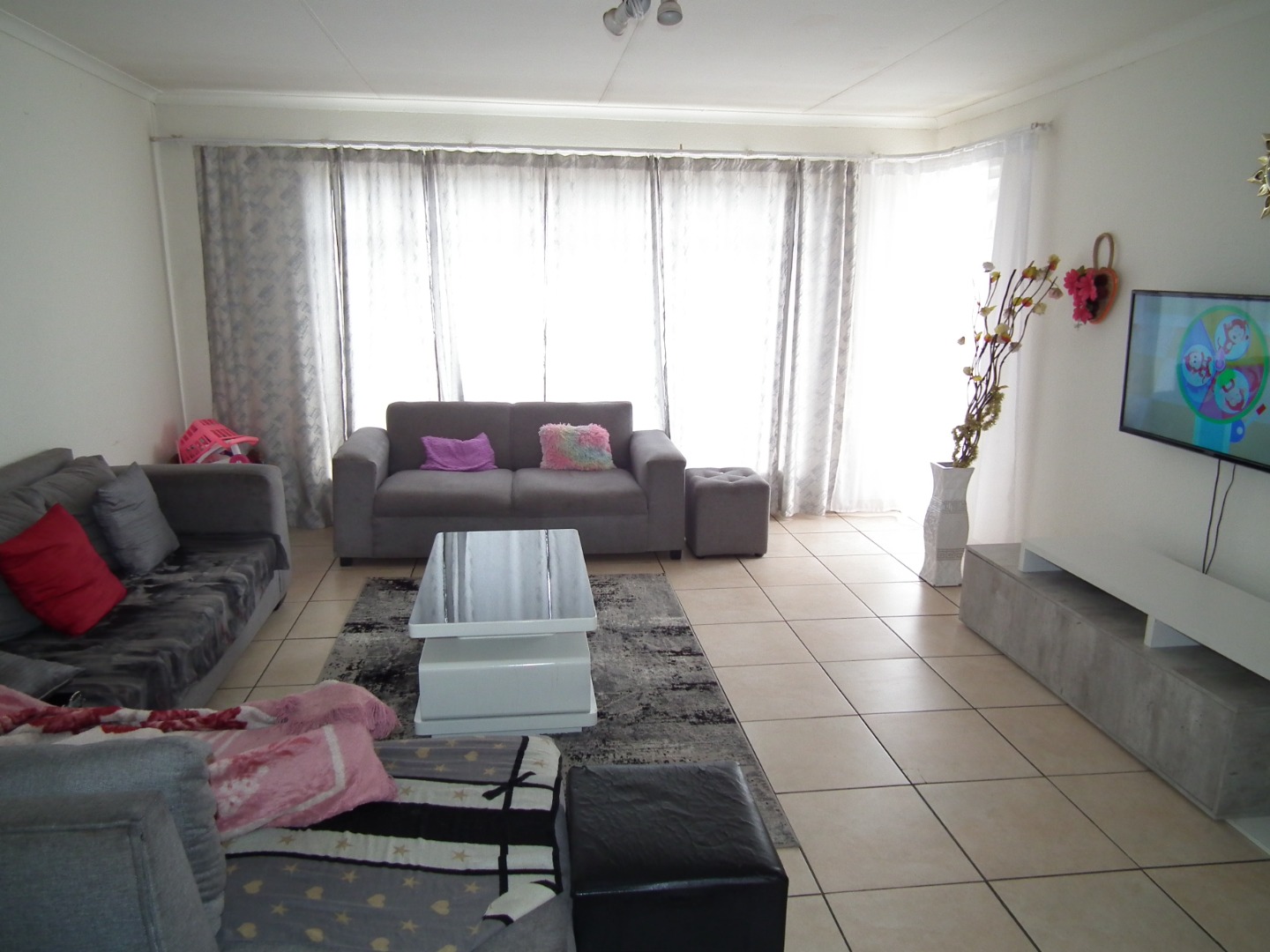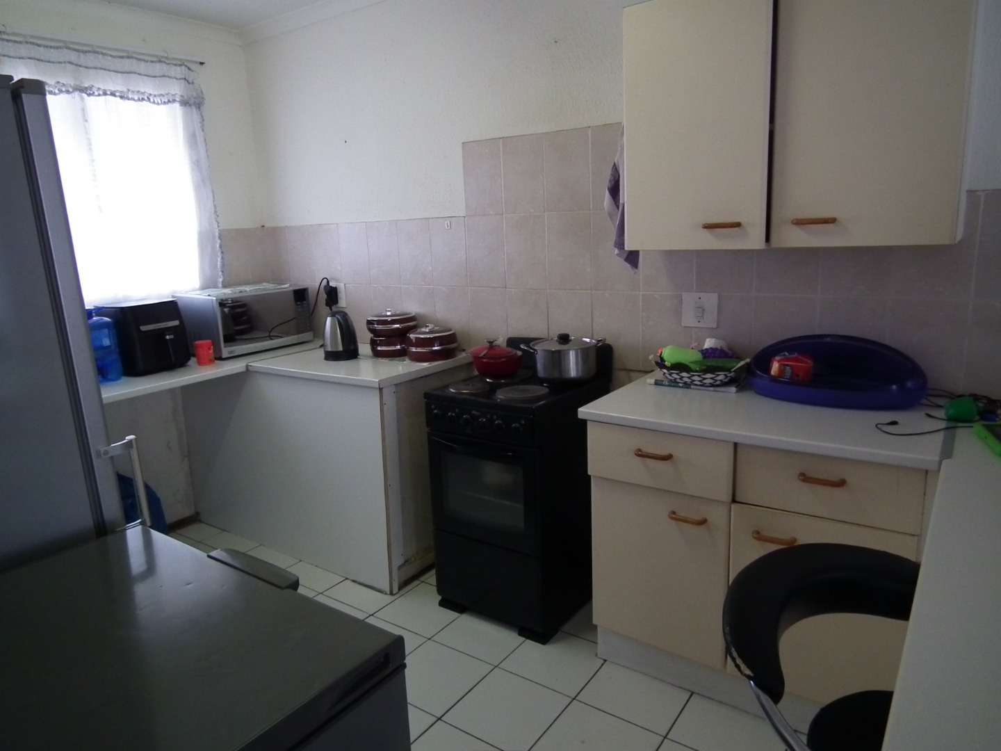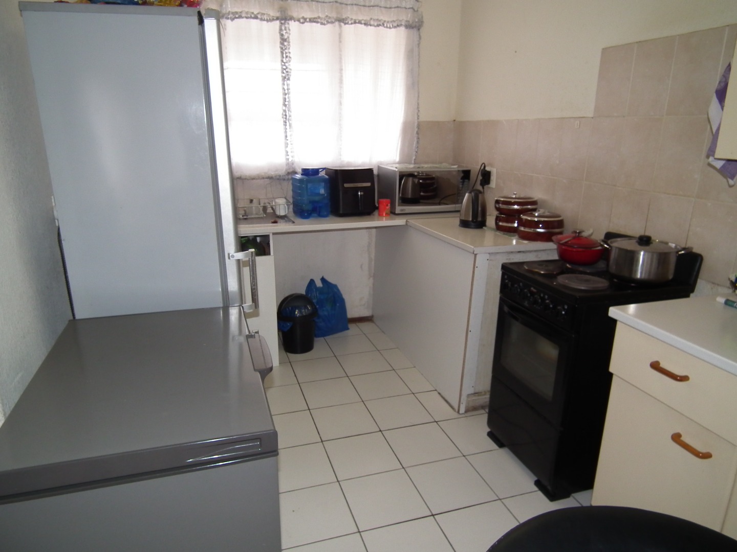 This functional 2-bedroom, 1-bathroom apartment offers a practical living solution within a secure complex in Monument, Krugersdorp. Upon entering, you are greeted by a well-lit lounge area featuring light tiled flooring and large windows, creating an inviting atmosphere. The kitchen, also tiled, offers a freestanding stove/oven, space for a appliances and space for one undercounter appliance, providing practical functionality for daily needs. Light-colored cabinetry offers storage, though the space presents an opportunity for modern updates.
