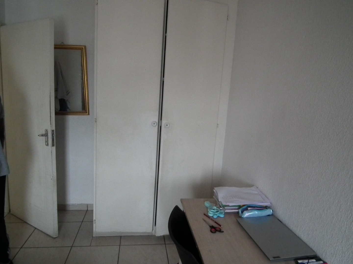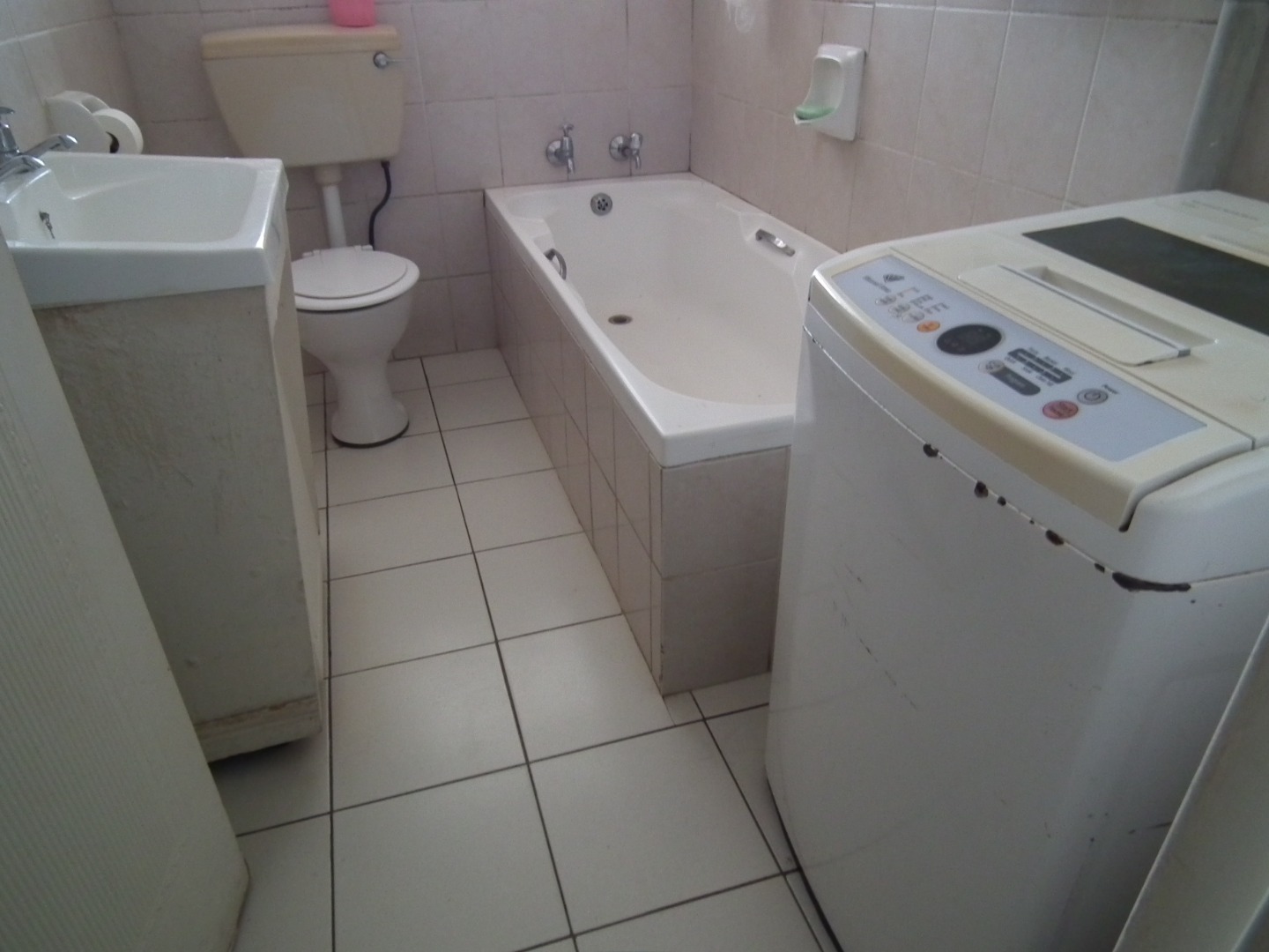 The apartment comprises two comfortable bedrooms, both benefiting from natural light and durable tiled flooring. Both features built-in cupboards, offering convenient storage solutions. The full bathroom is equipped with a toilet, sink, and bathtub, and includes space for a washing machine.