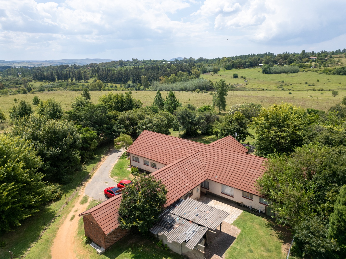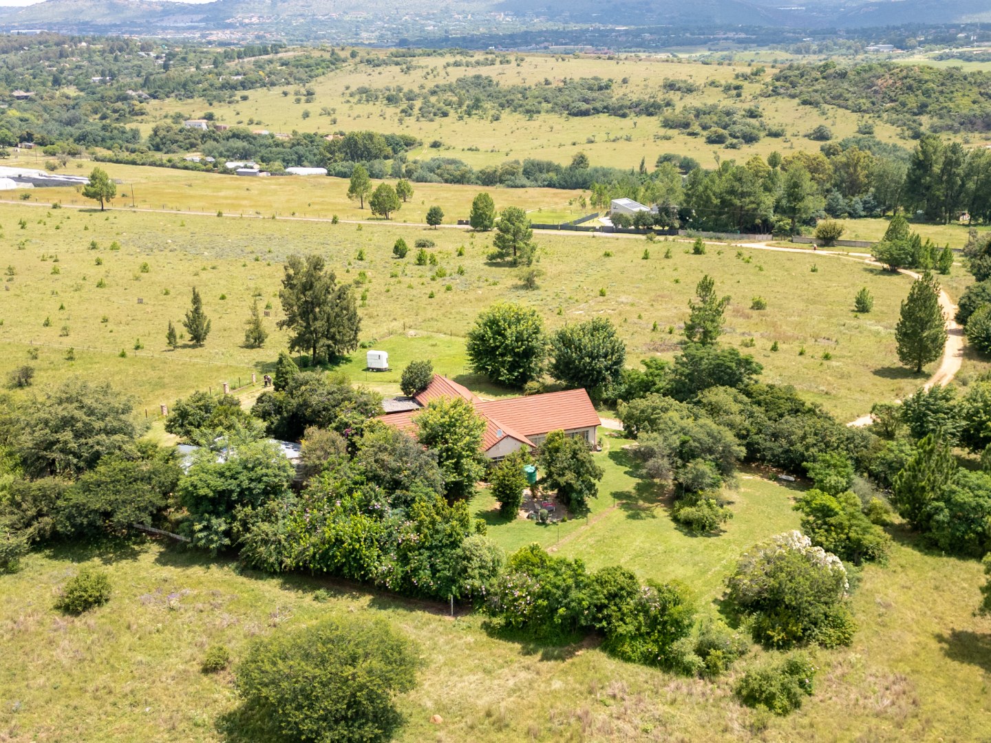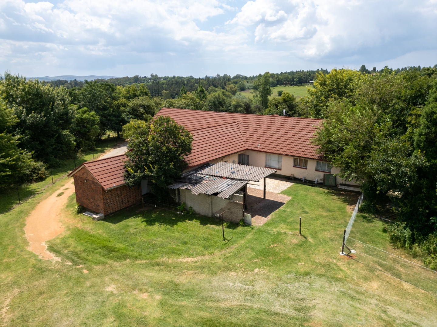 The property features a main house comprising 3 bedrooms and a study, kitchen. living areas , bathrooms, and more. A separate cottage with 2 bedrooms, offers living area, kitchen and bathroom. The aerial views reveal well-maintained structures with classic red-tiled roofs, blending harmoniously with the natural surroundings. Sustainability is enhanced by visible solar panels on one of the buildings, and a borehole ensures a reliable water supply for the established garden and extensive grounds.