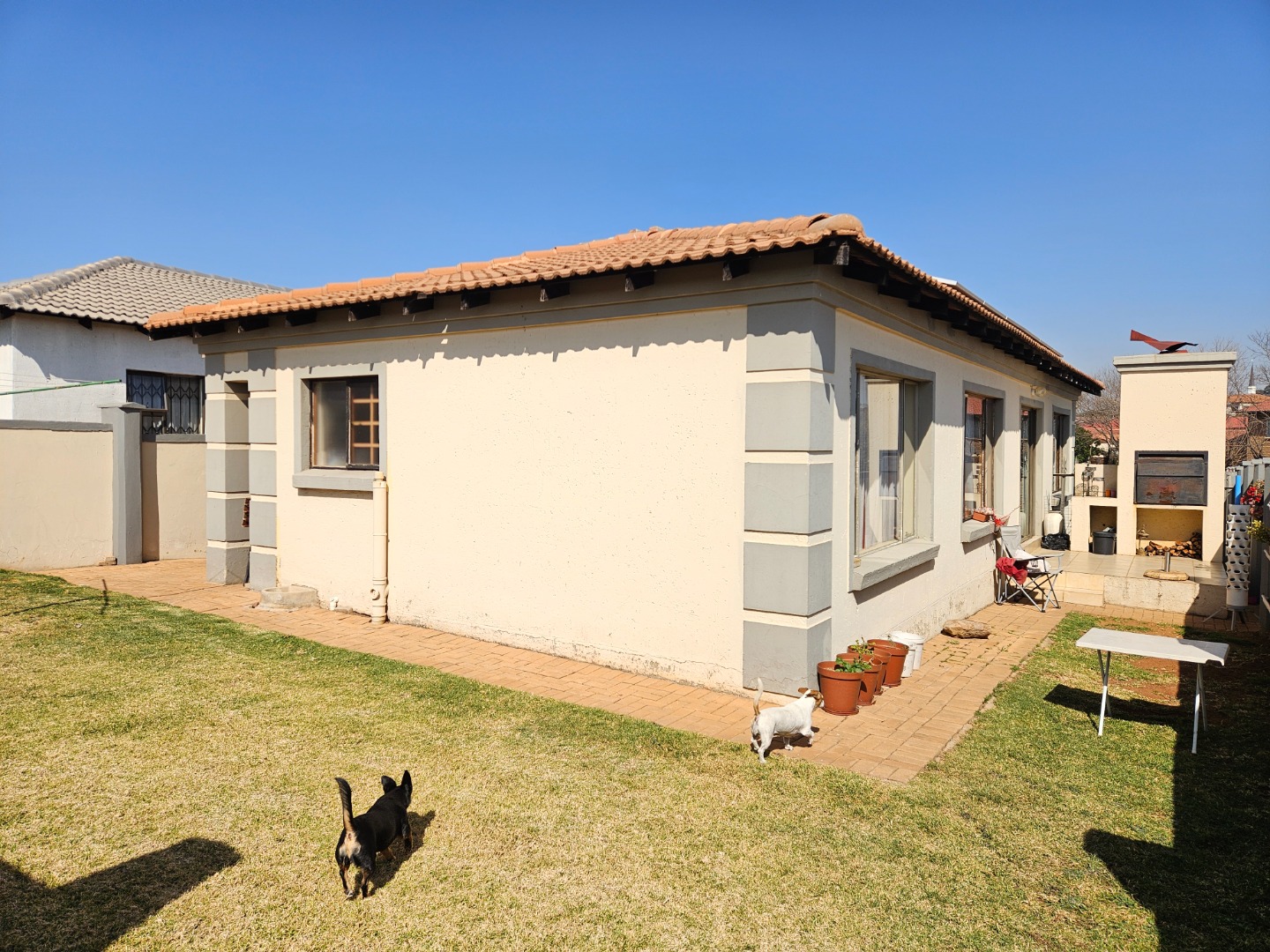 All three bedrooms have built in cupboards with the 2 making use of a second bathroom and the main accessing its own full bathroom. The kitchen, dinning area and lounge are open plan and that enhances family time and easy sharing of chores. As you walk through the sliding door you are greeted by a braai area right there on a space that you can chill on garden chairs enjoying the moonlight. The wrap-around garden has been meticulously maintained green throughout the year and has got much more space at the back for privacy. A Hollyhood garage/carport parks two and extra space parks as many in front. Its a haven for pet lovers too! Get hold of me instantly to arrange a viewing.